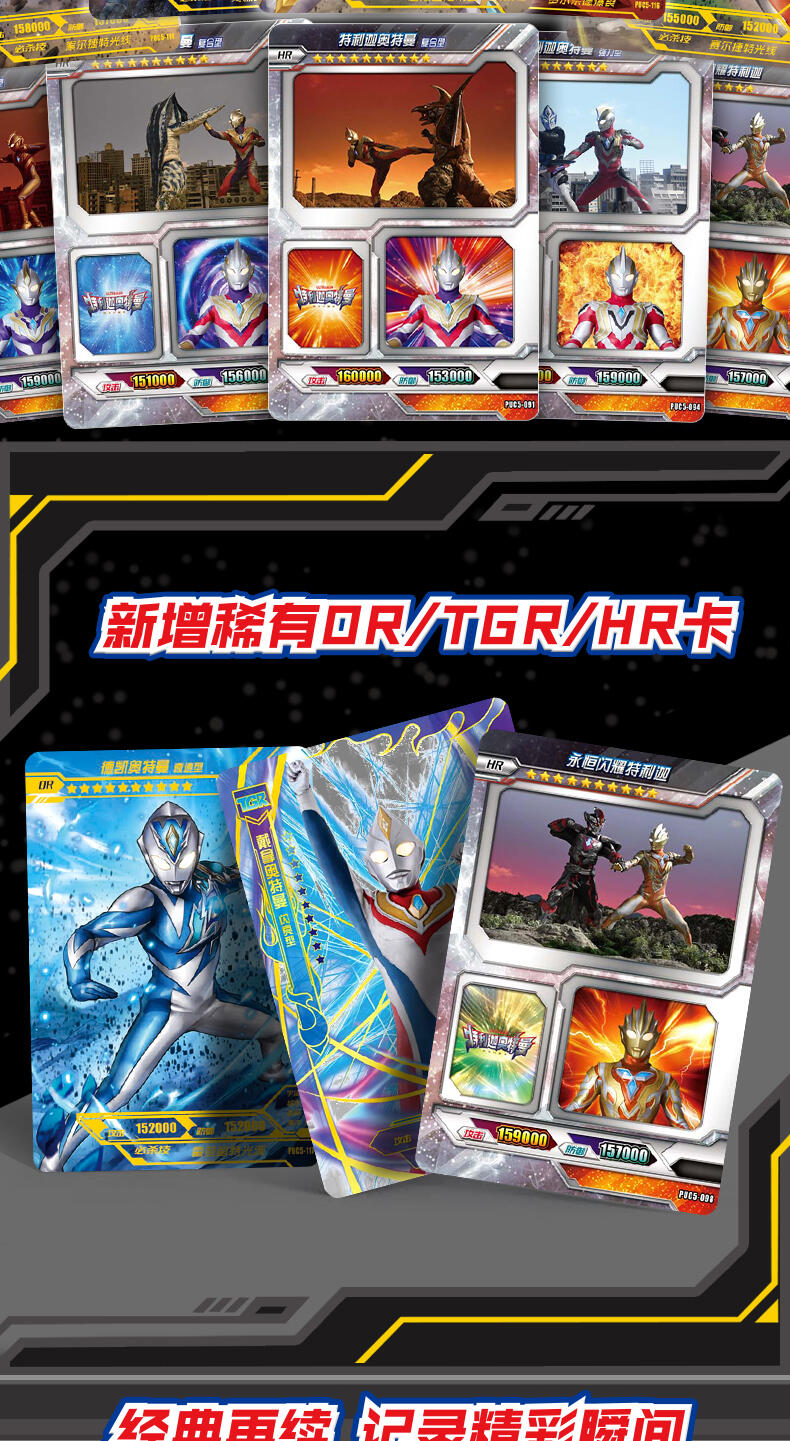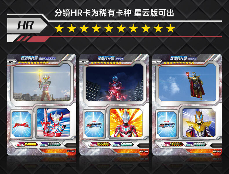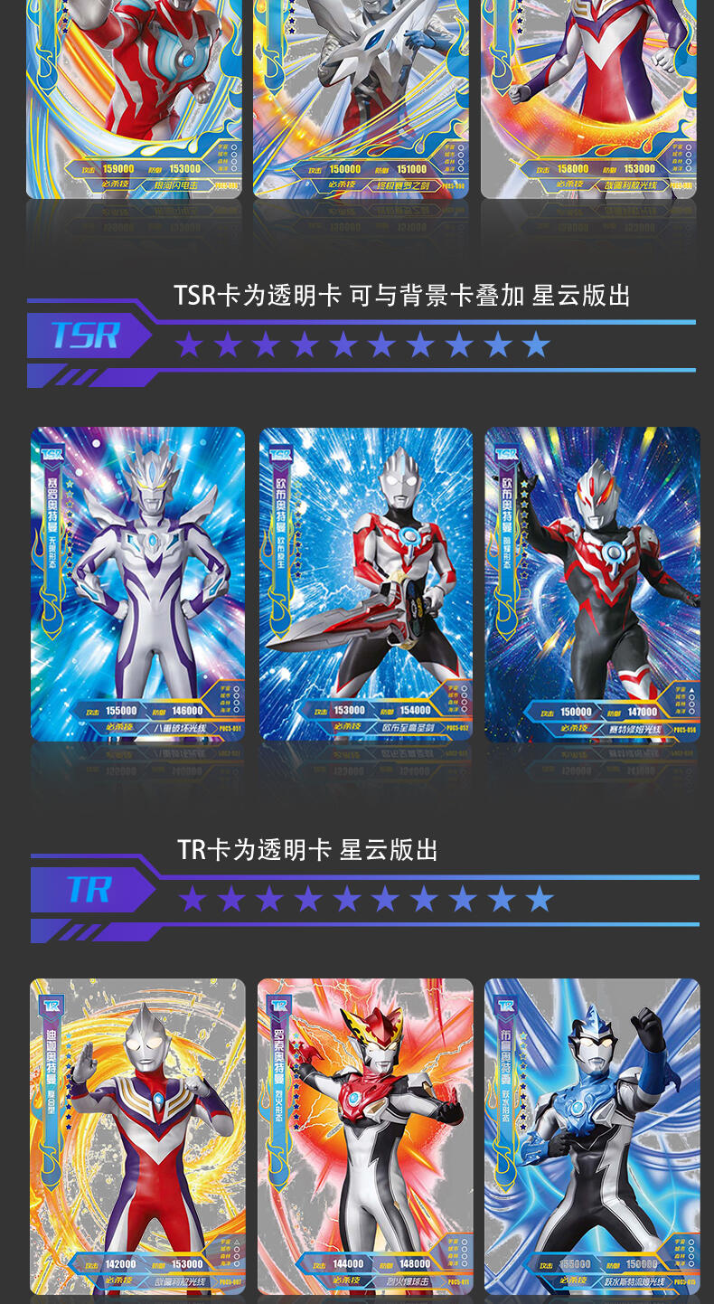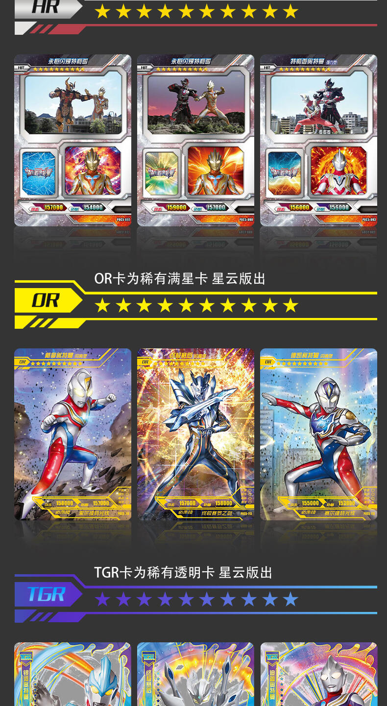 超宇宙奥特英雄X档案星云版第3弹每包含有30张卡牌,不仅收录了星辰版的全新稀有度TR卡、TGR卡、TSR卡以及热门稀有度OR卡,还增加了还原经典场景的分镜HR卡.
