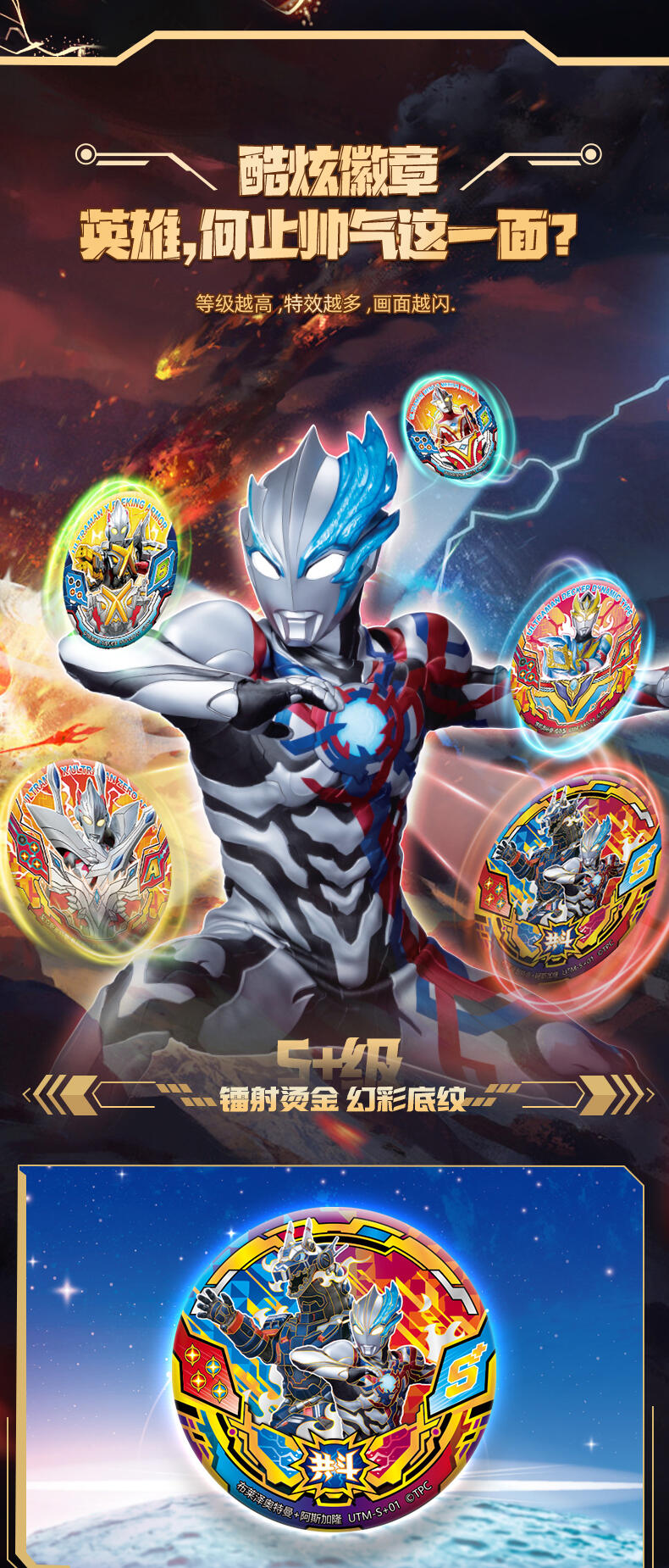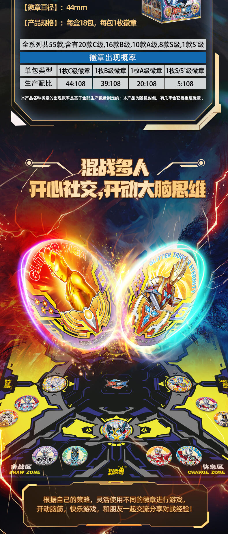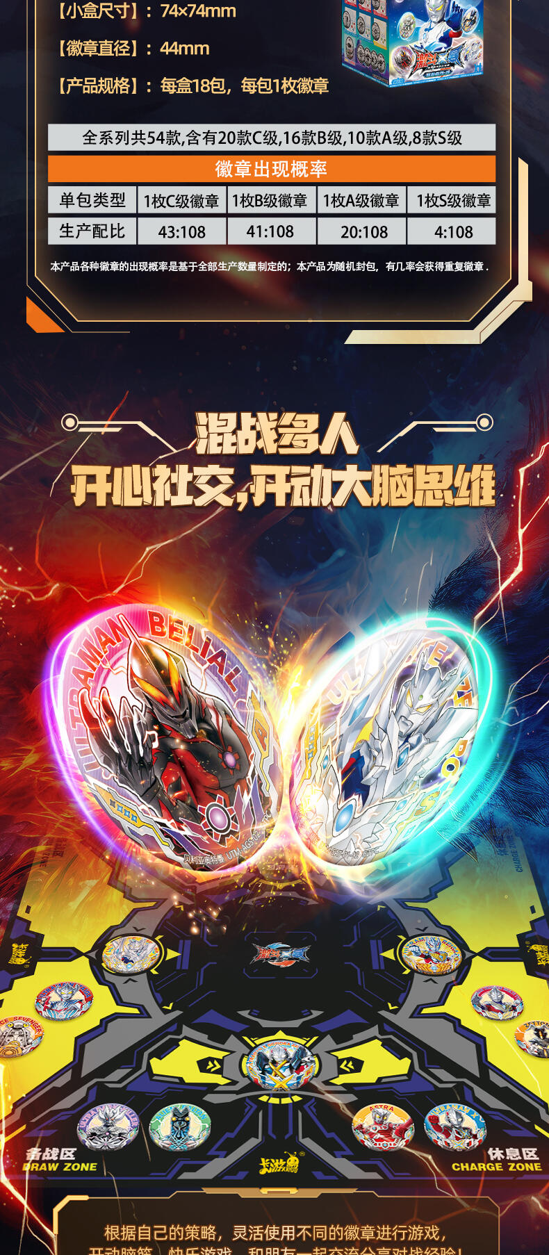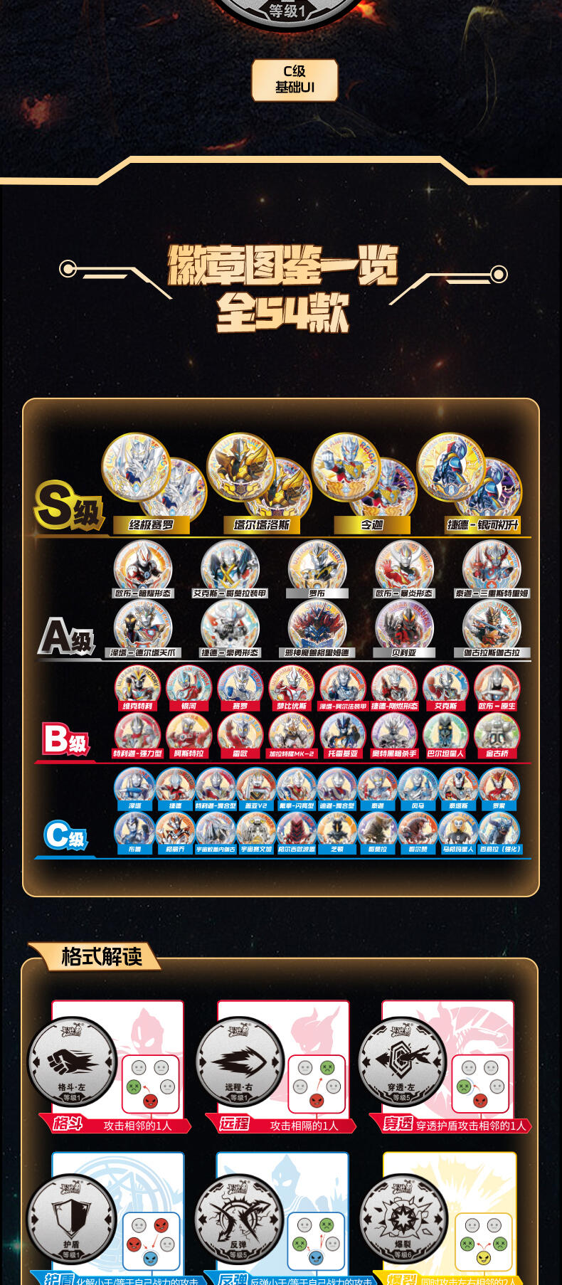 战斗徽章第一弹共50款,其中奥特英雄54款,均单独出售。徽章包正面含能力星级,英雄称呼,收藏编码,稀有度等级,背面则含战斗值,招式名称、方向以及攻击方向,突出正面好看,背面好玩的特点,其中等级分布全系分4个等级,等级越高,特效越多,战力越强,背面招式覆盖攻击型、防御型、特别型,该徽章不仅可以社交对战,也可以收藏