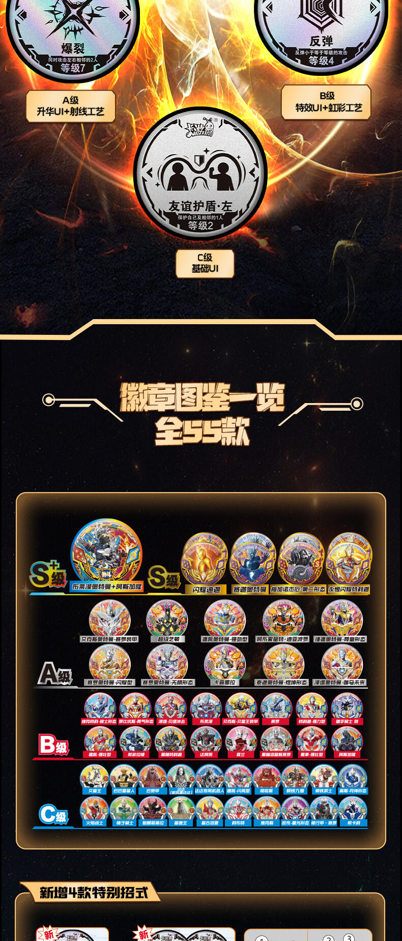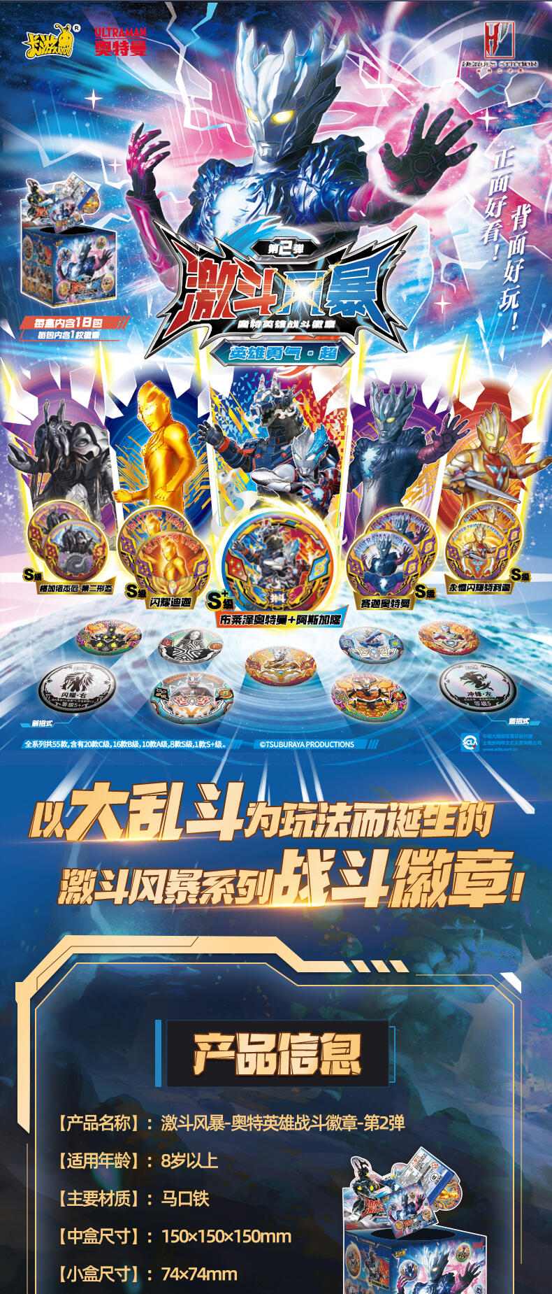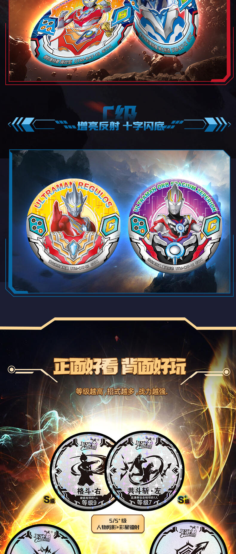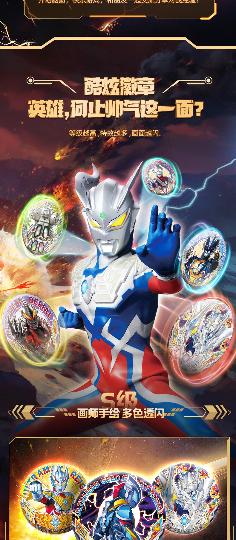 战斗徽章第一弹共50款,其中奥特英雄54款,均单独出售。徽章包正面含能力星级,英雄称呼,收藏编码,稀有度等级,背面则含战斗值,招式名称、方向以及攻击方向,突出正面好看,背面好玩的特点,其中等级分布全系分4个等级,等级越高,特效越多,战力越强,背面招式覆盖攻击型、防御型、特别型,该徽章不仅可以社交对战,也可以收藏