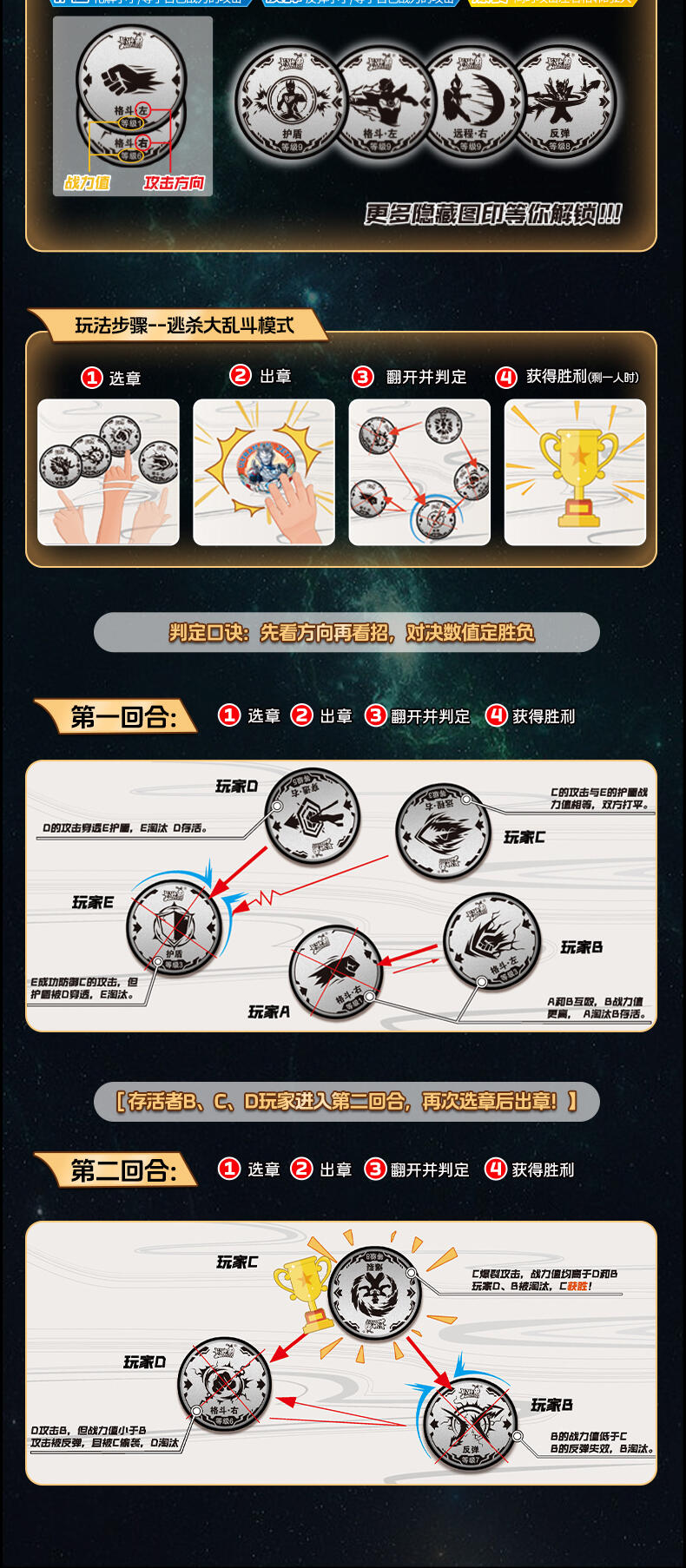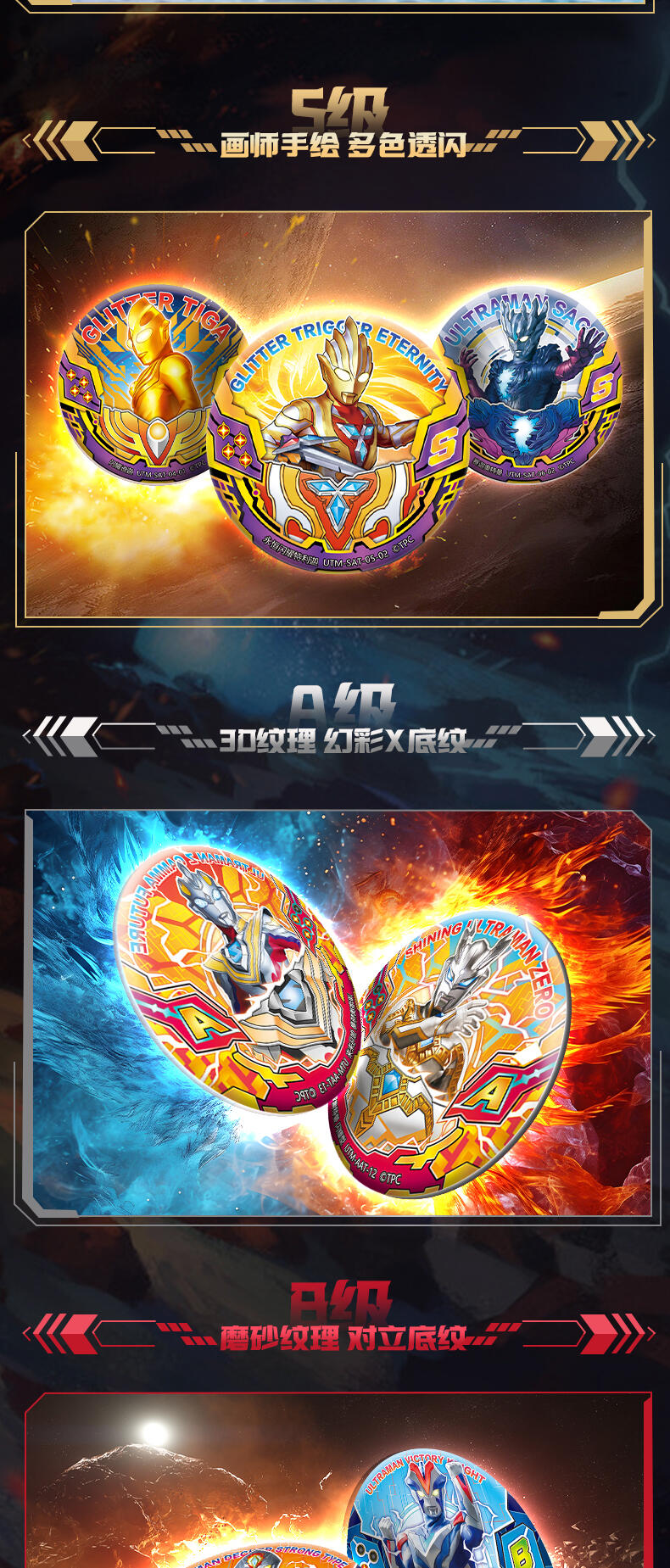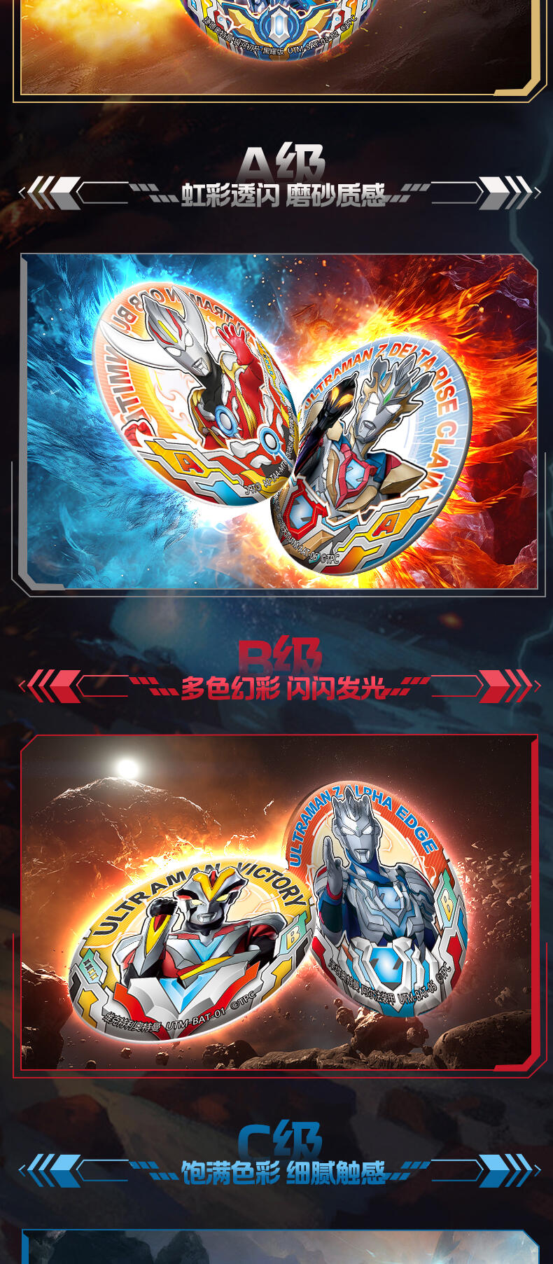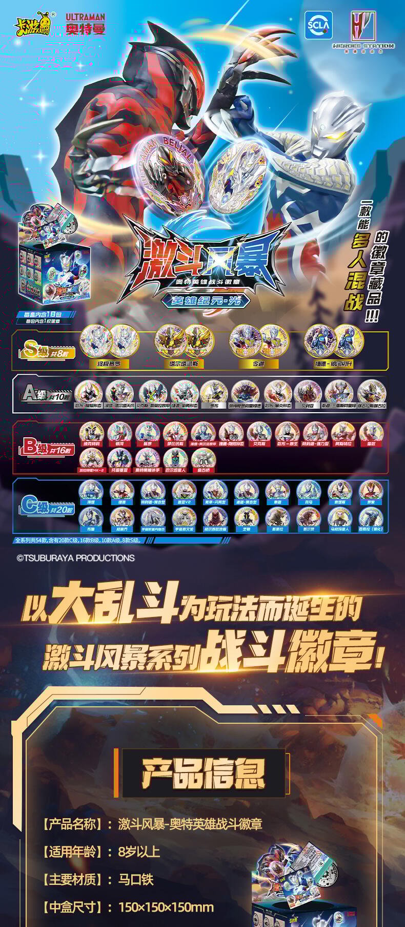 战斗徽章第一弹共50款,其中奥特英雄54款,均单独出售。徽章包正面含能力星级,英雄称呼,收藏编码,稀有度等级,背面则含战斗值,招式名称、方向以及攻击方向,突出正面好看,背面好玩的特点,其中等级分布全系分4个等级,等级越高,特效越多,战力越强,背面招式覆盖攻击型、防御型、特别型,该徽章不仅可以社交对战,也可以收藏