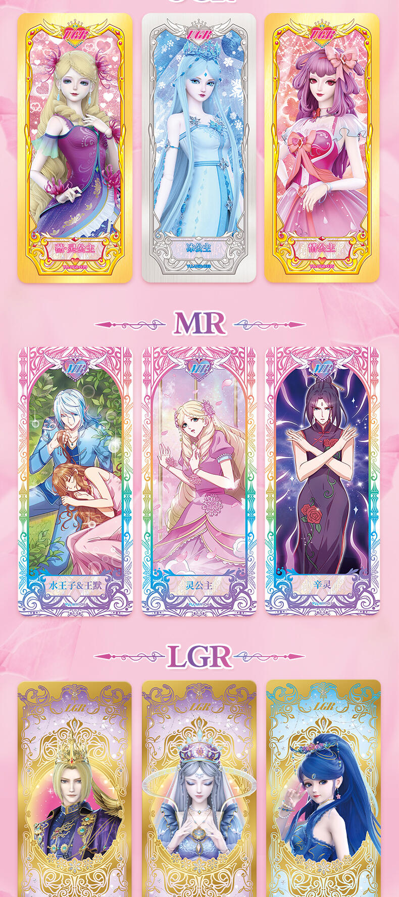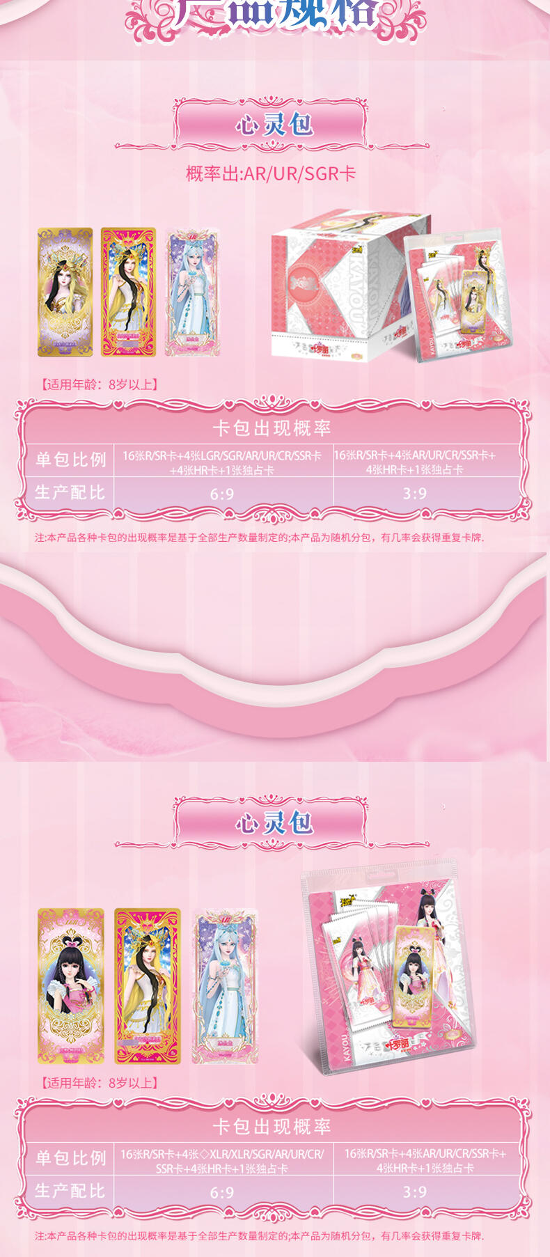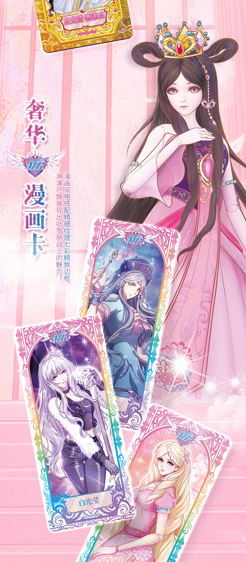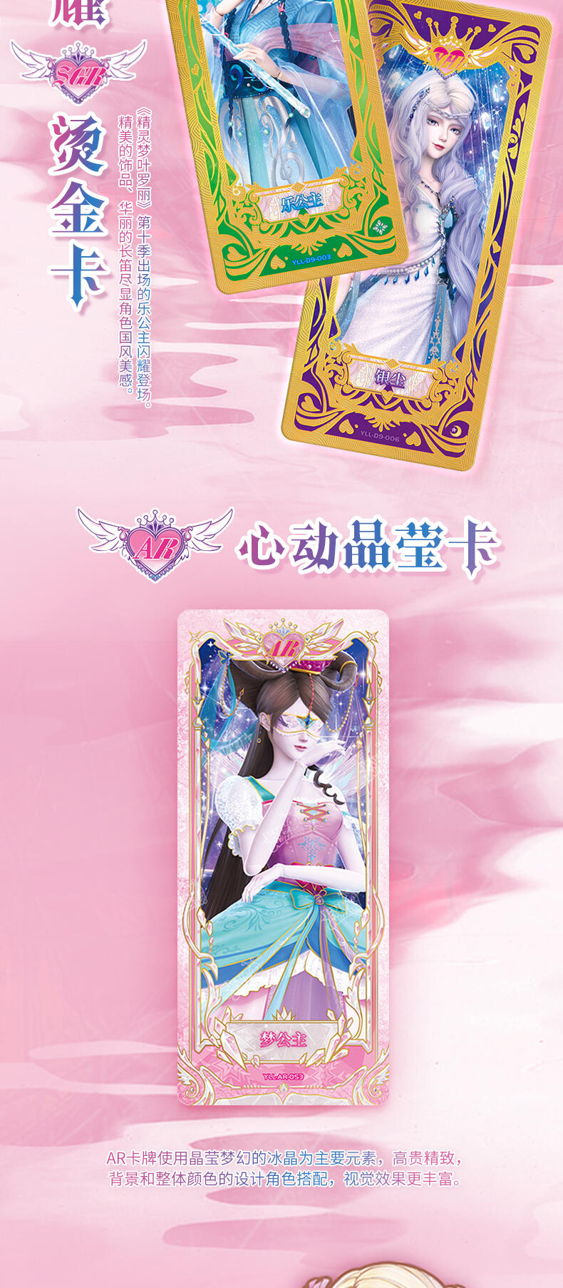 叶罗丽-仙境收藏卡-心灵包-第2弹,每板包含4包卡包及1张白光莹LGR卡牌,其中卡包内卡牌收录了166种卡牌,其中SGR卡6种、LGR卡6种、AR卡6种、CR卡10种、UR卡18种、SSR卡20种、HR卡40种、SR卡20种、R卡40种,心灵包每包补充包包含6张卡牌,其中4张为R/SR卡,1张为HR卡,1张为随机AR/SGR/LGR/UR/CR/SSR卡。收录时间公主、金罗丽、梦公主等LGR稀有度卡牌,SGR、AR卡牌选取白光莹·新素白、冰公主·便服、傅冉·精神,冰公主、傅裘·精神、水王子·魔化、陈思思·新变身、王默·婚纱等丰富角色与服饰搭配