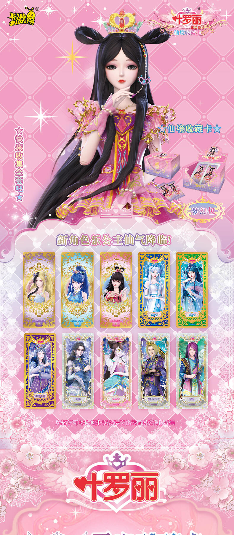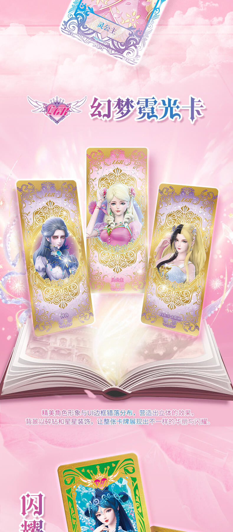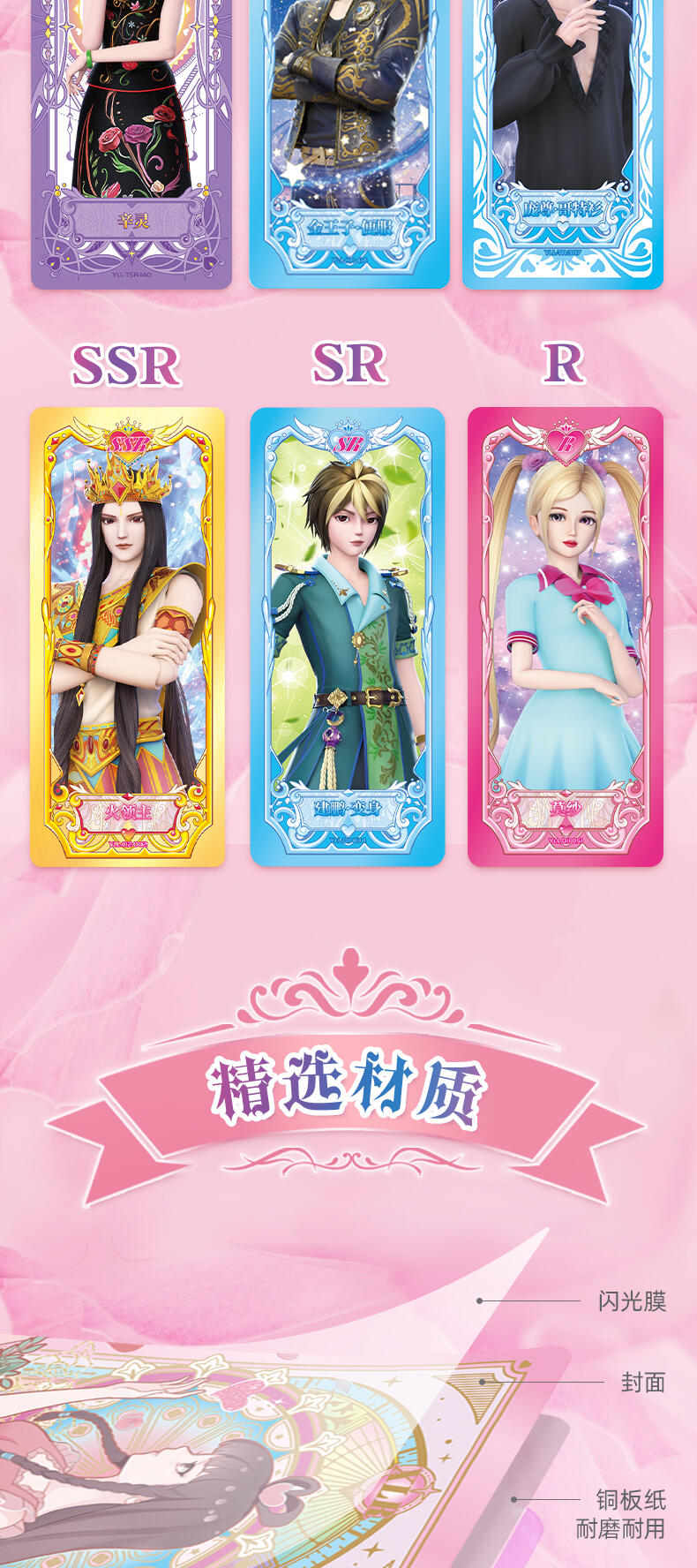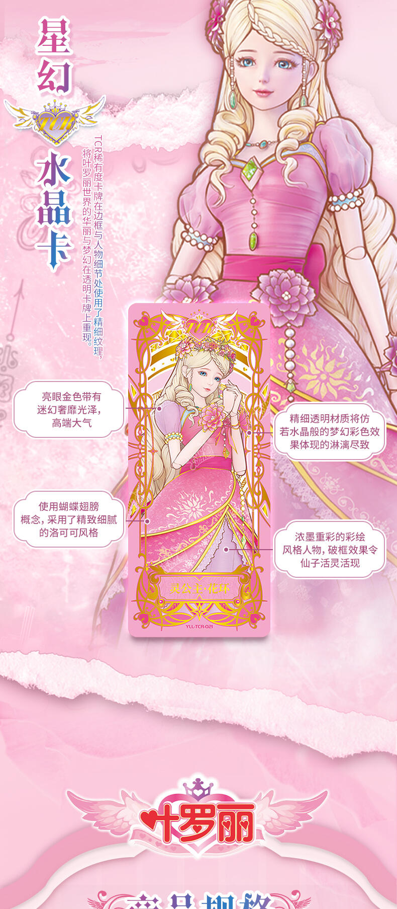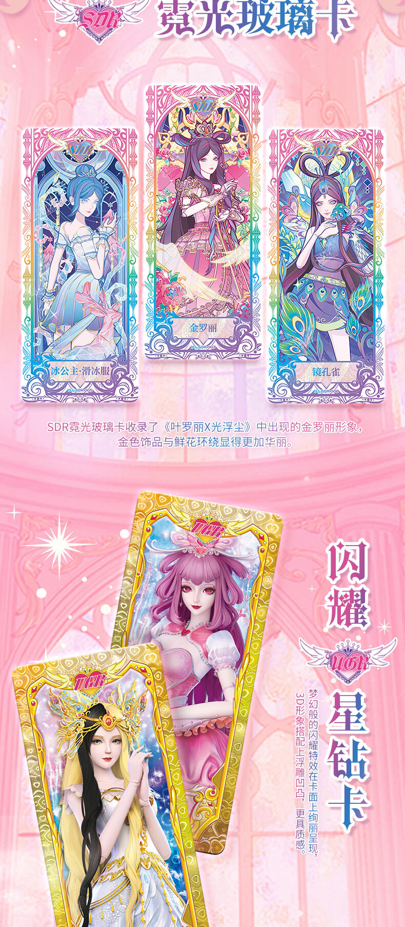 叶罗丽-仙境收藏卡-心灵包-第2弹,每板包含4包卡包及1张白光莹LGR卡牌,其中卡包内卡牌收录了166种卡牌,其中SGR卡6种、LGR卡6种、AR卡6种、CR卡10种、UR卡18种、SSR卡20种、HR卡40种、SR卡20种、R卡40种,心灵包每包补充包包含6张卡牌,其中4张为R/SR卡,1张为HR卡,1张为随机AR/SGR/LGR/UR/CR/SSR卡。收录时间公主、金罗丽、梦公主等LGR稀有度卡牌,SGR、AR卡牌选取白光莹·新素白、冰公主·便服、傅冉·精神,冰公主、傅裘·精神、水王子·魔化、陈思思·新变身、王默·婚纱等丰富角色与服饰搭配