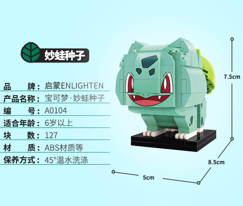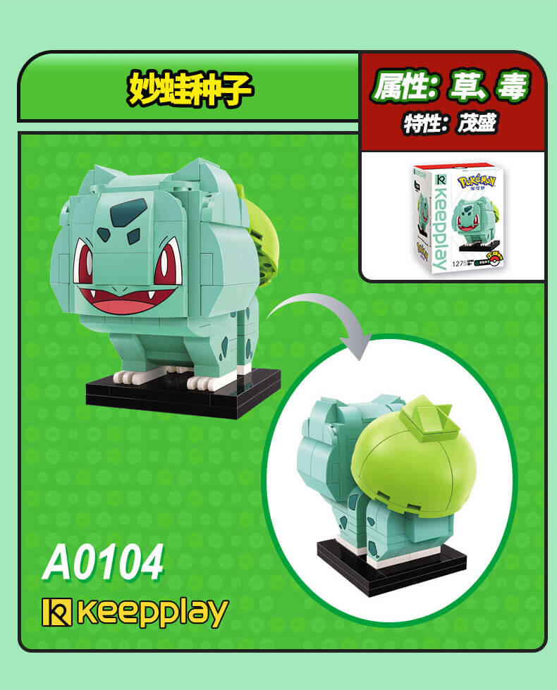 经典草系主角精灵,背有不可思议的种子。内含127块积木,兼容乐高。 色彩亮丽,边缘光滑,易于拼砌。