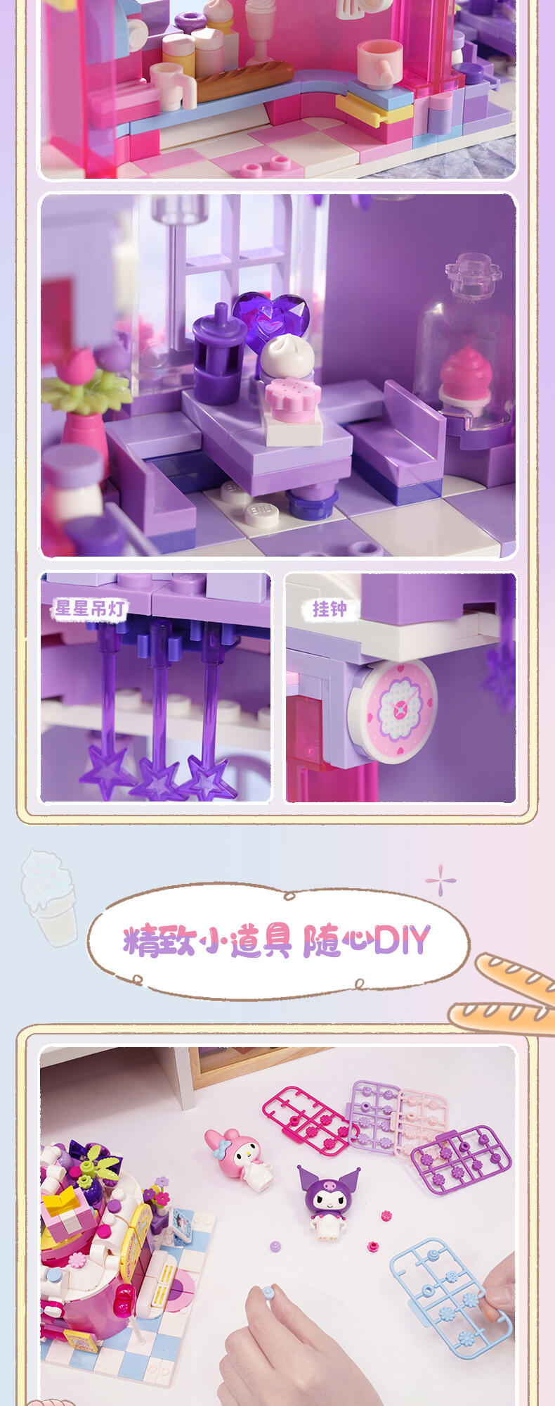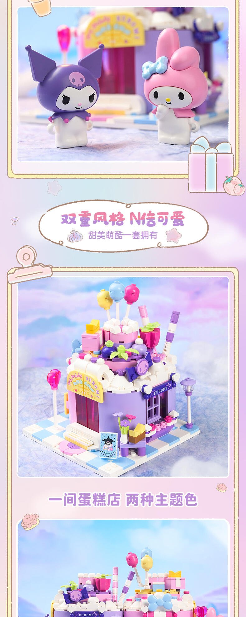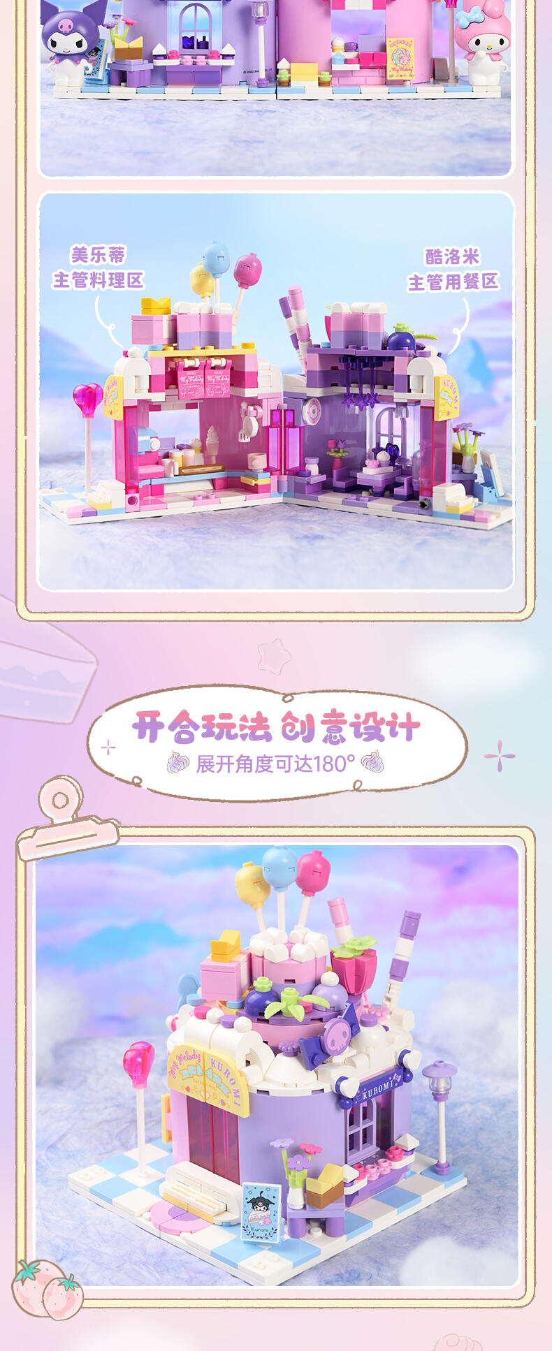 一间蛋糕店,两种主题色(美乐蒂主管料理区,酷洛米主管用餐区),开合玩法,创意设计;展开角度可达180度,全印刷细节精美;精致小道具,随心DIY。