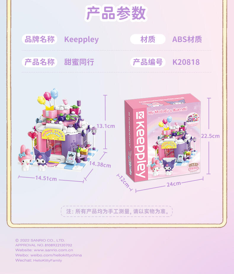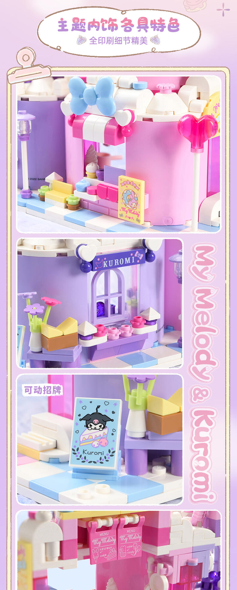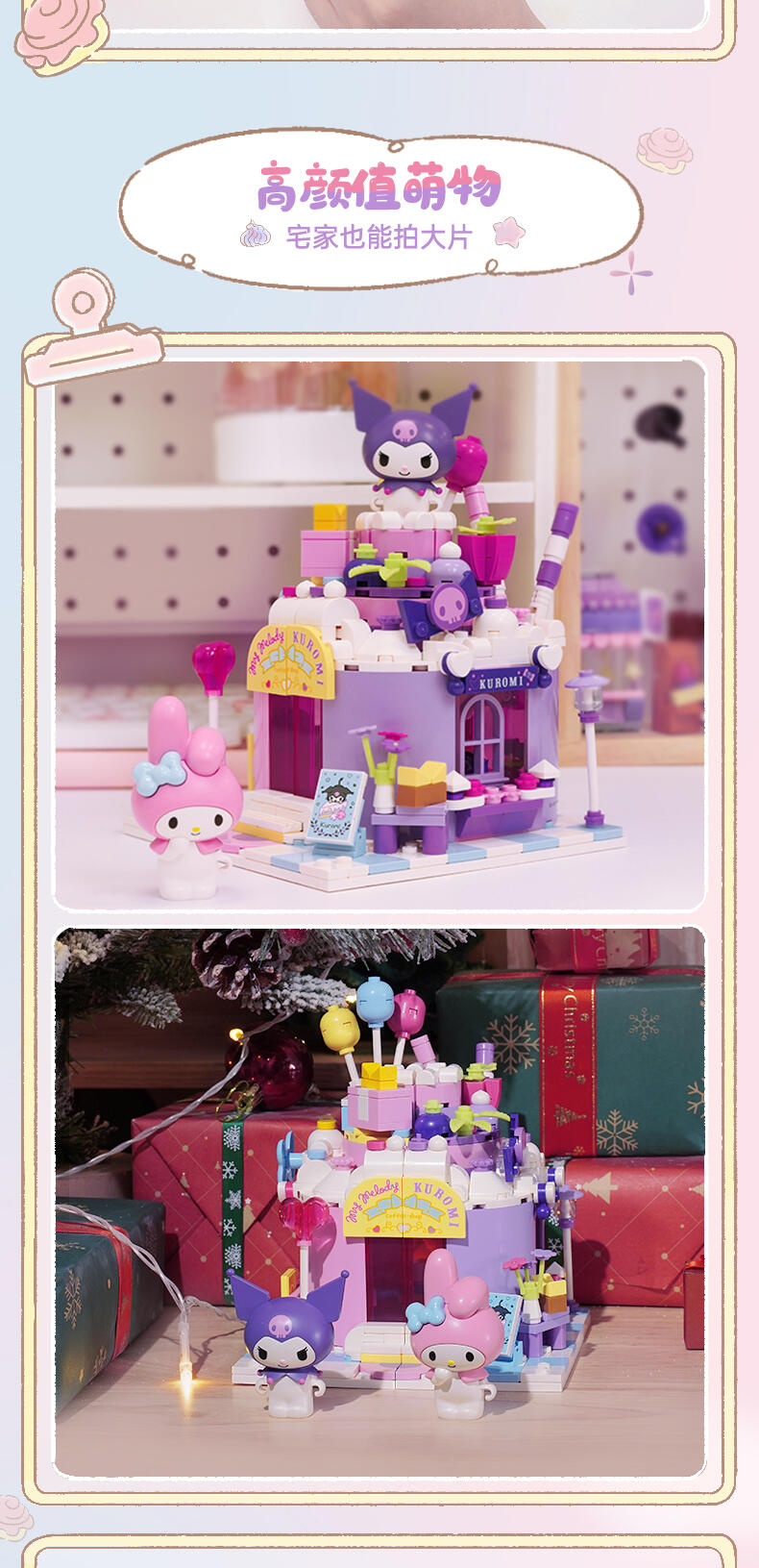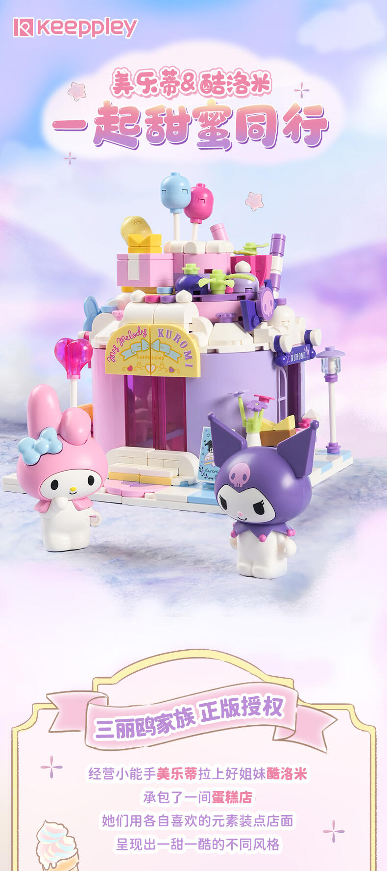 一间蛋糕店,两种主题色(美乐蒂主管料理区,酷洛米主管用餐区),开合玩法,创意设计;展开角度可达180度,全印刷细节精美;精致小道具,随心DIY。