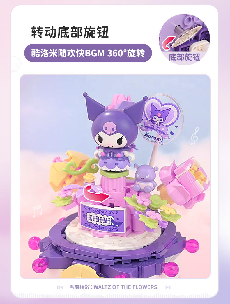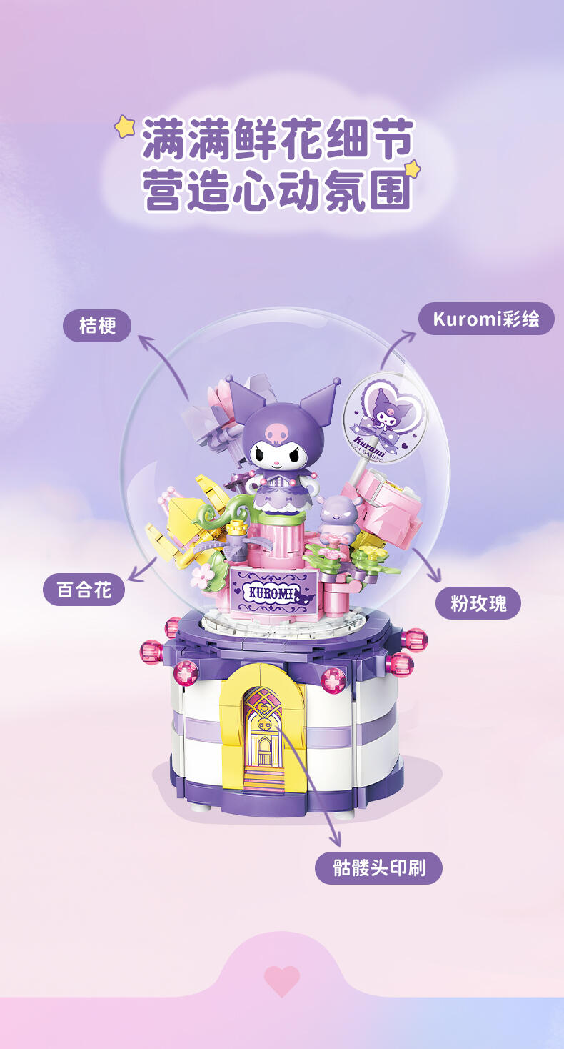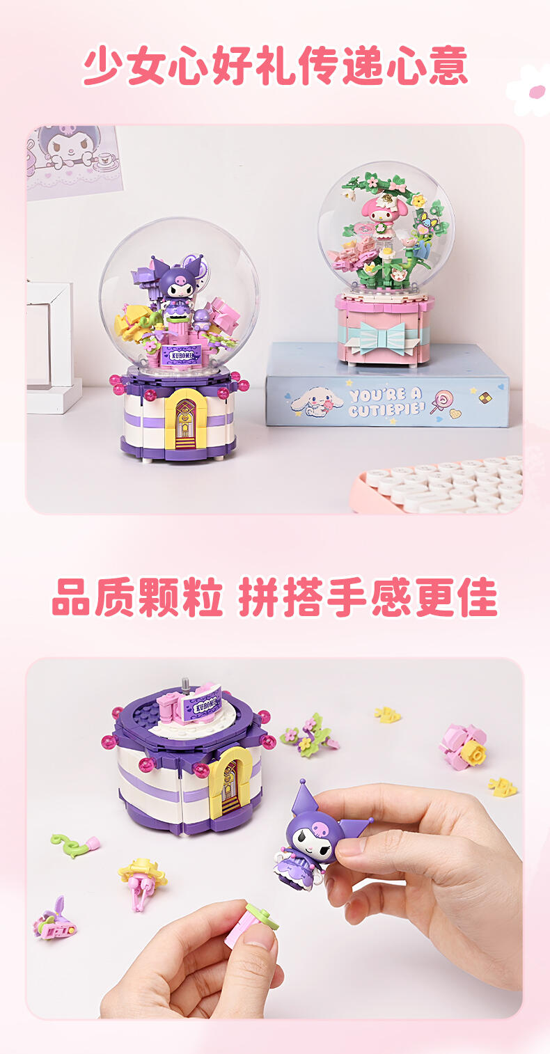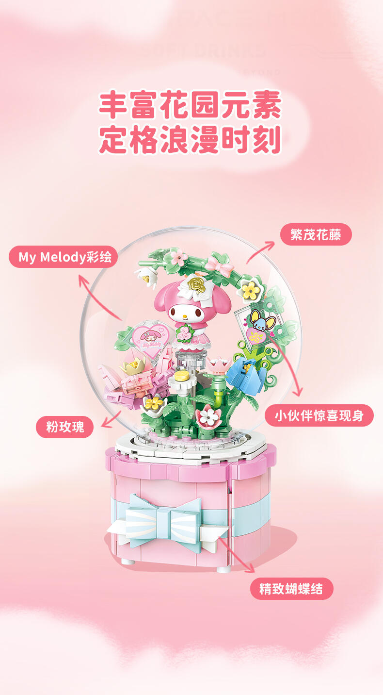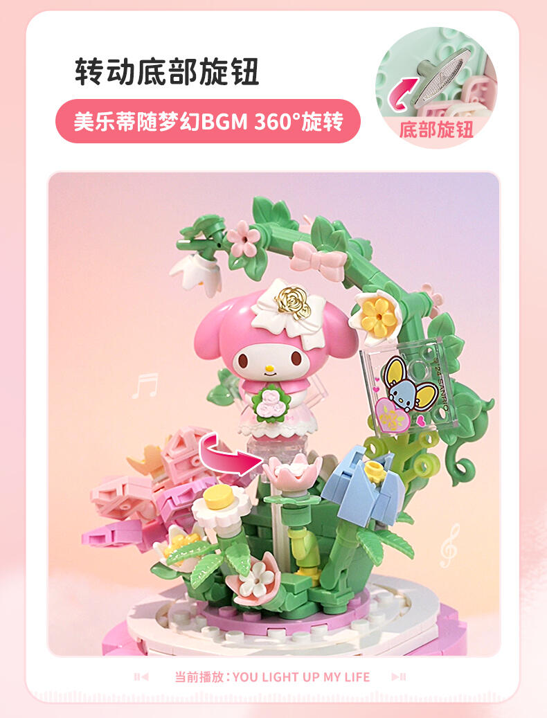 1、全新开模人仔:美乐蒂身穿美丽婚纱裙,手捧鲜花,站在花园里。 2、浪漫配乐:扭动底部旋钮,浪漫欢快的音乐响起,美乐蒂人仔360°转动 3、送礼佳品:浪漫花丛的场景加上水晶球,打动年轻女生,是节日及告白礼物的好选择!
