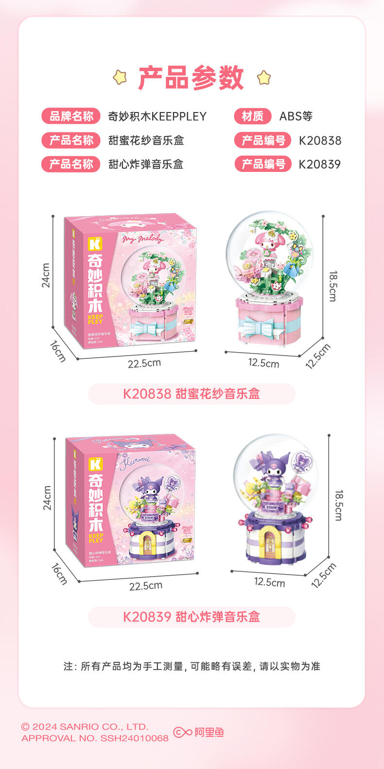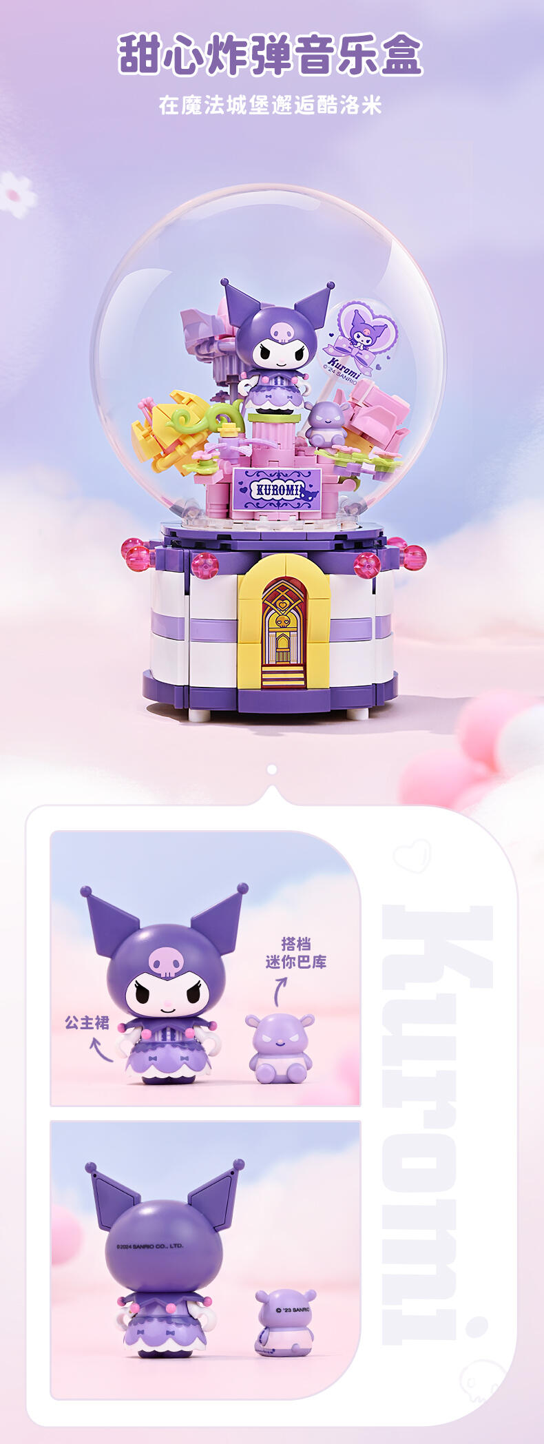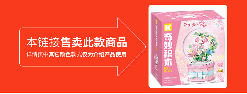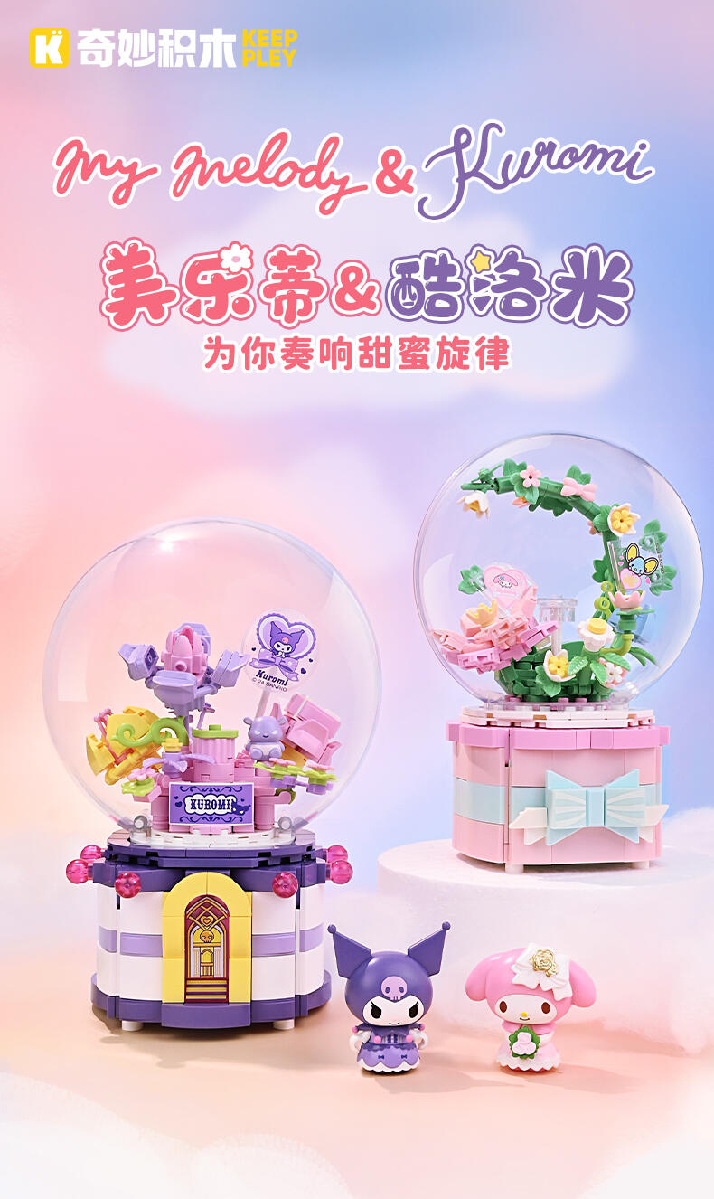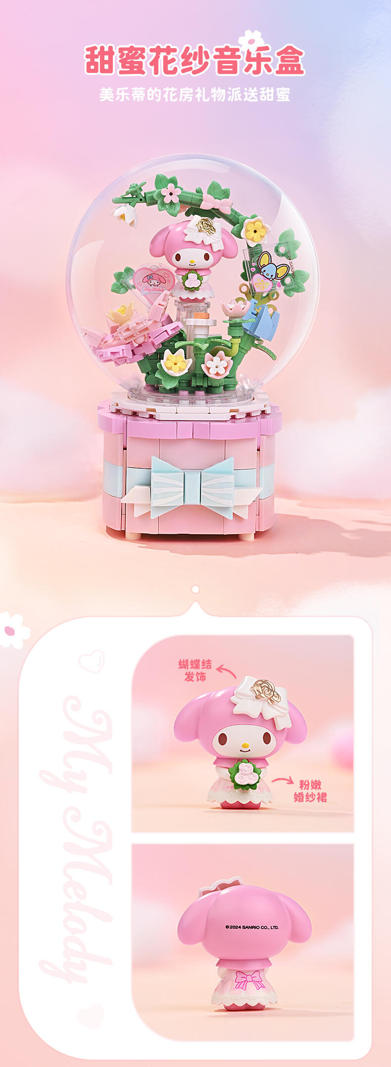 1、全新开模人仔:美乐蒂身穿美丽婚纱裙,手捧鲜花,站在花园里。 2、浪漫配乐:扭动底部旋钮,浪漫欢快的音乐响起,美乐蒂人仔360°转动 3、送礼佳品:浪漫花丛的场景加上水晶球,打动年轻女生,是节日及告白礼物的好选择!