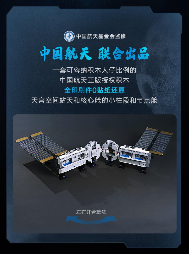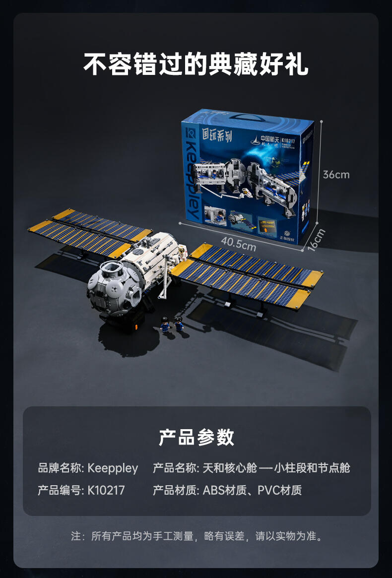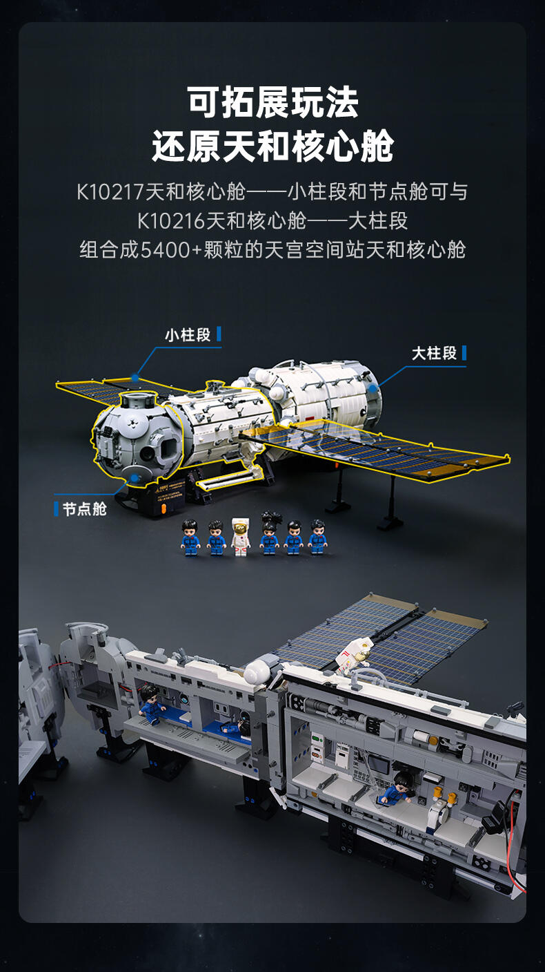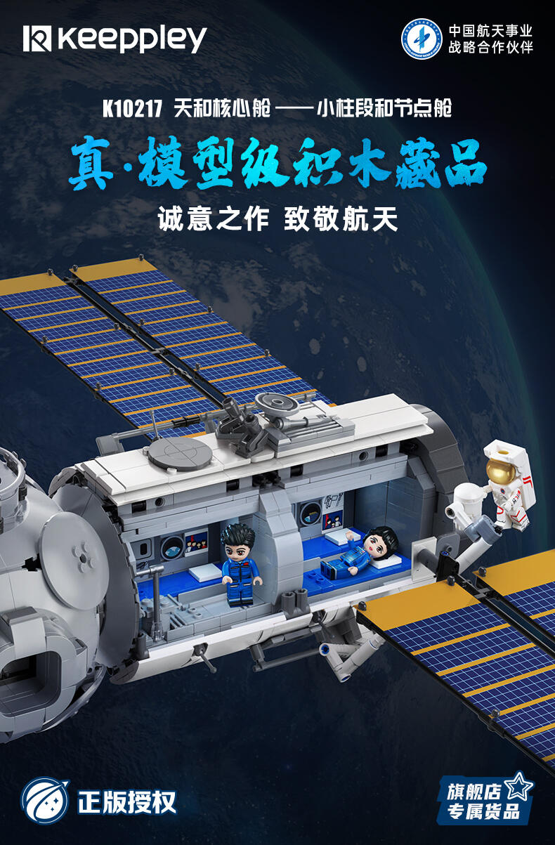 Keeppley首次推出可容纳积木人仔比例的中国航天正版授权积木,还原中国空间站天和核心舱,总颗粒数超5400+,体积庞大,具有一定拼搭挑战性,可以满足航天迷把玩与收藏的需求