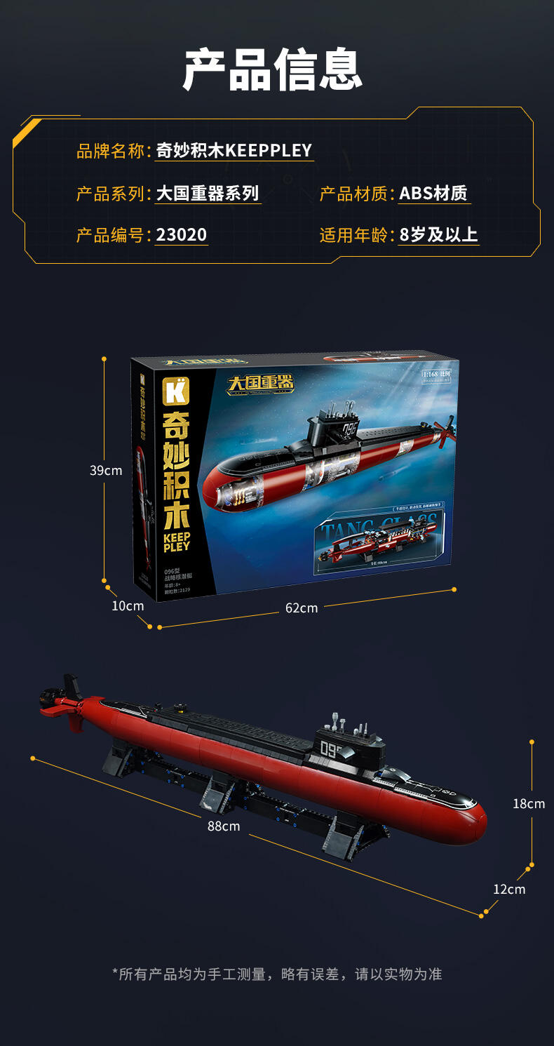 1、外观高度还原,88cm近一米长军模;半透明设计,可通过透明件展现剖面半机械体 2、手摇传动,联动起伏;部分盖子可掀开,更好欣赏内部细节 3、精致细节,具备潜艇核心元素(核反应堆、巨浪3导弹、声呐系统等)