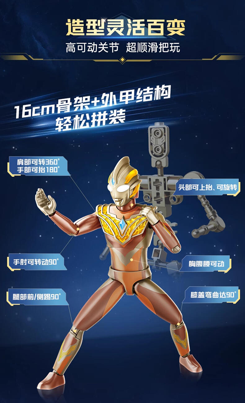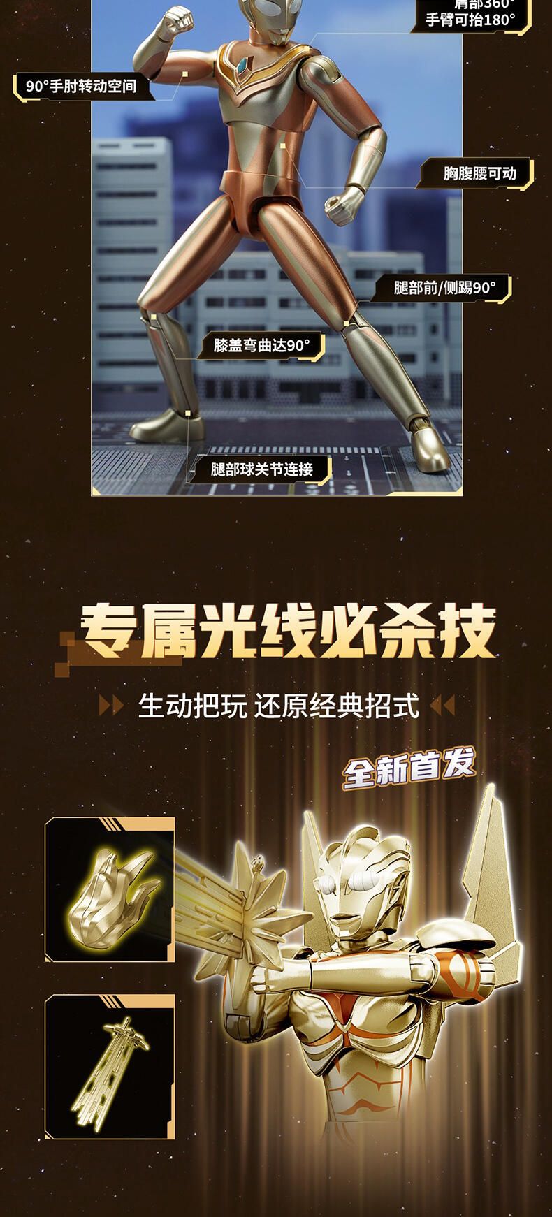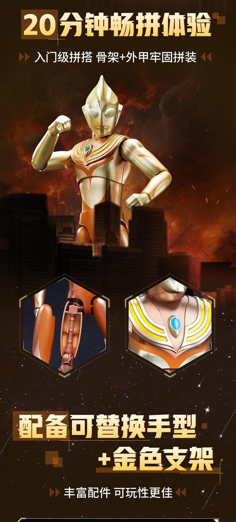 1. 稀有金色闪耀形态奥特曼拼装玩具(金色超甲皆无单独明盒发售),收藏、送礼都合适 2. 360°超旋骨架,15处可动关节,造型百变更耐玩 3. 20分钟畅拼,成就感更高 4. 搭配武器配件和支架,还原英雄大招
