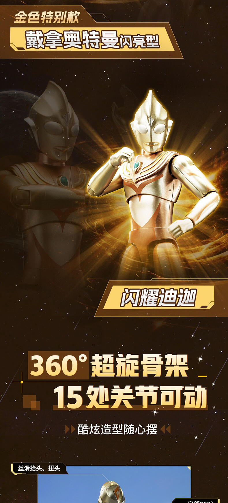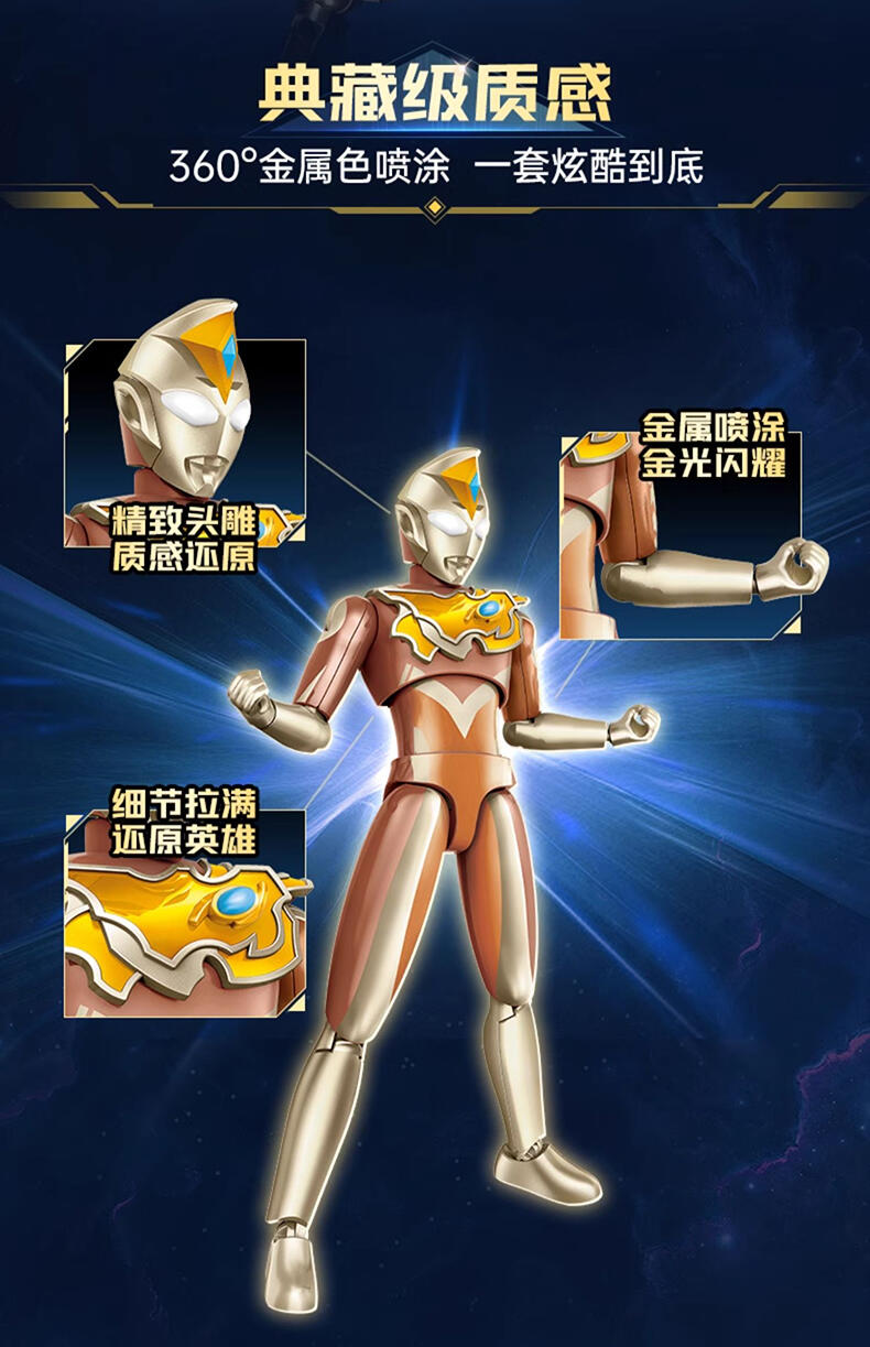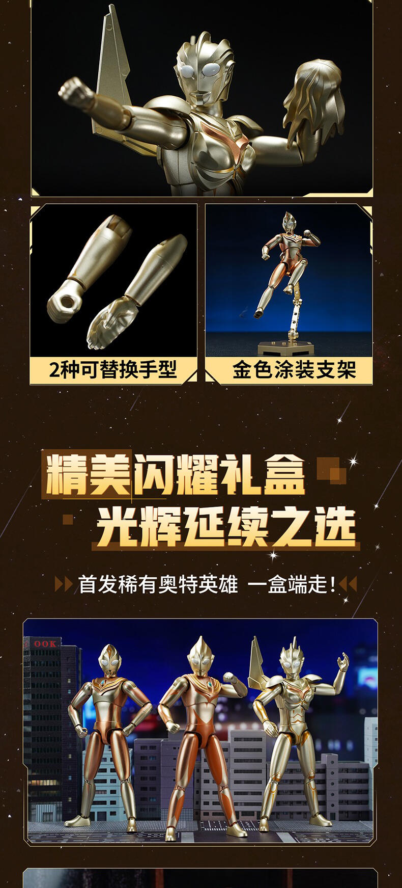 1. 稀有金色闪耀形态奥特曼拼装玩具(金色超甲皆无单独明盒发售),收藏、送礼都合适 2. 360°超旋骨架,15处可动关节,造型百变更耐玩 3. 20分钟畅拼,成就感更高 4. 搭配武器配件和支架,还原英雄大招