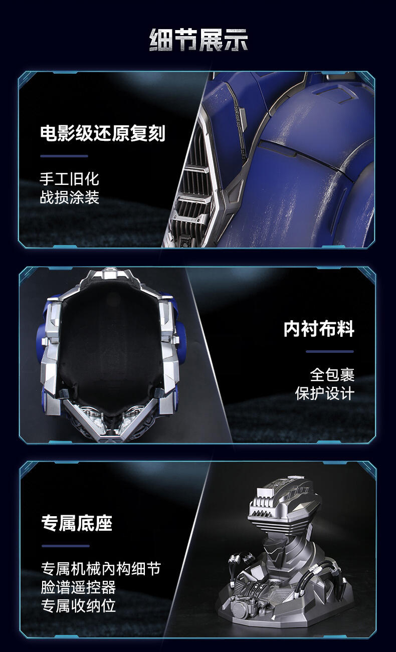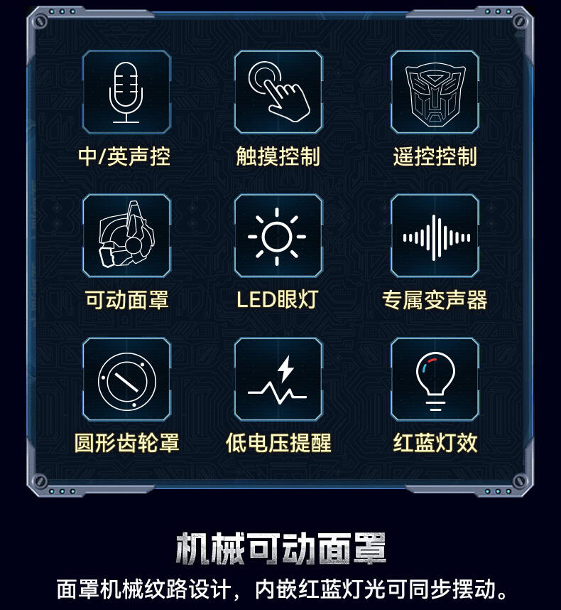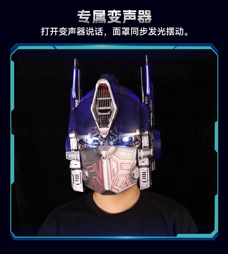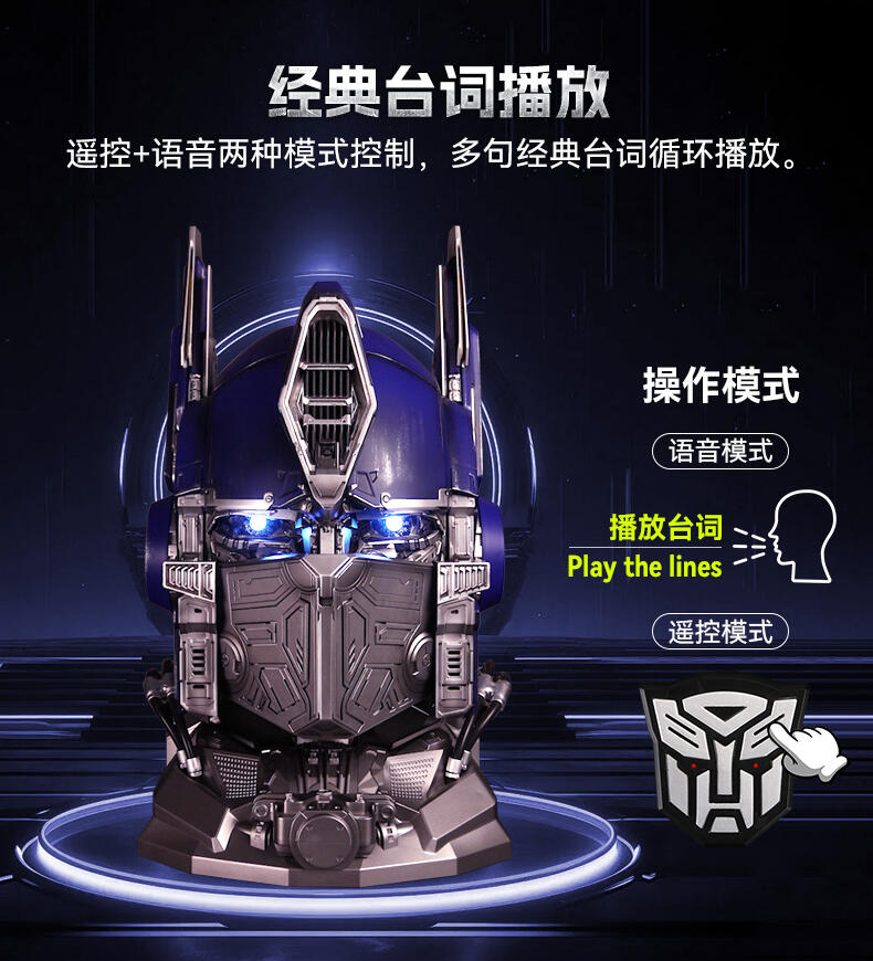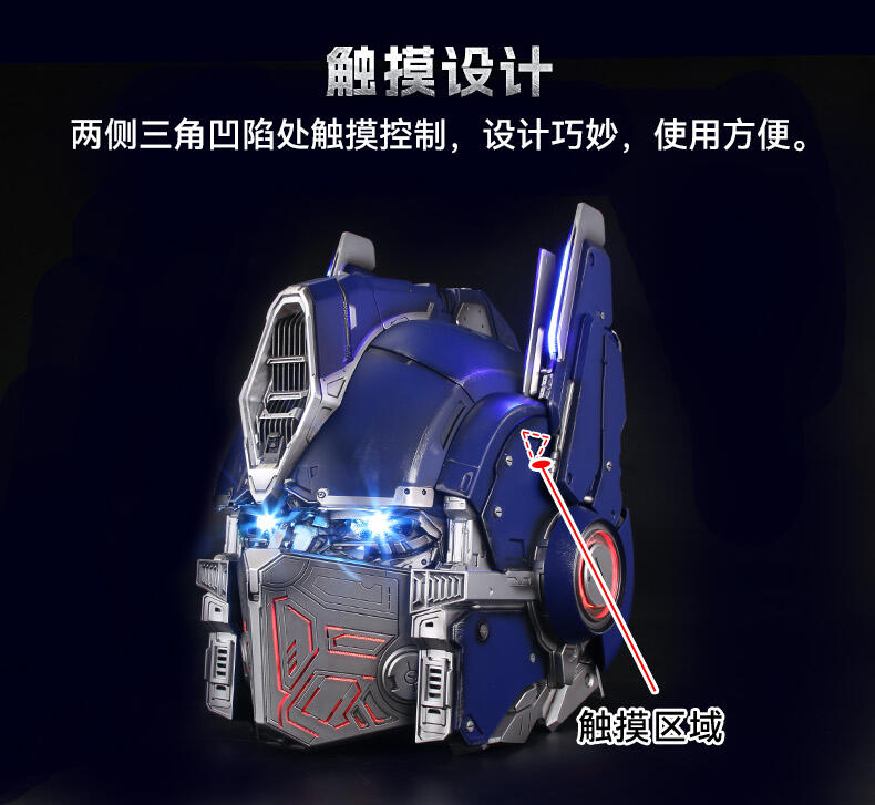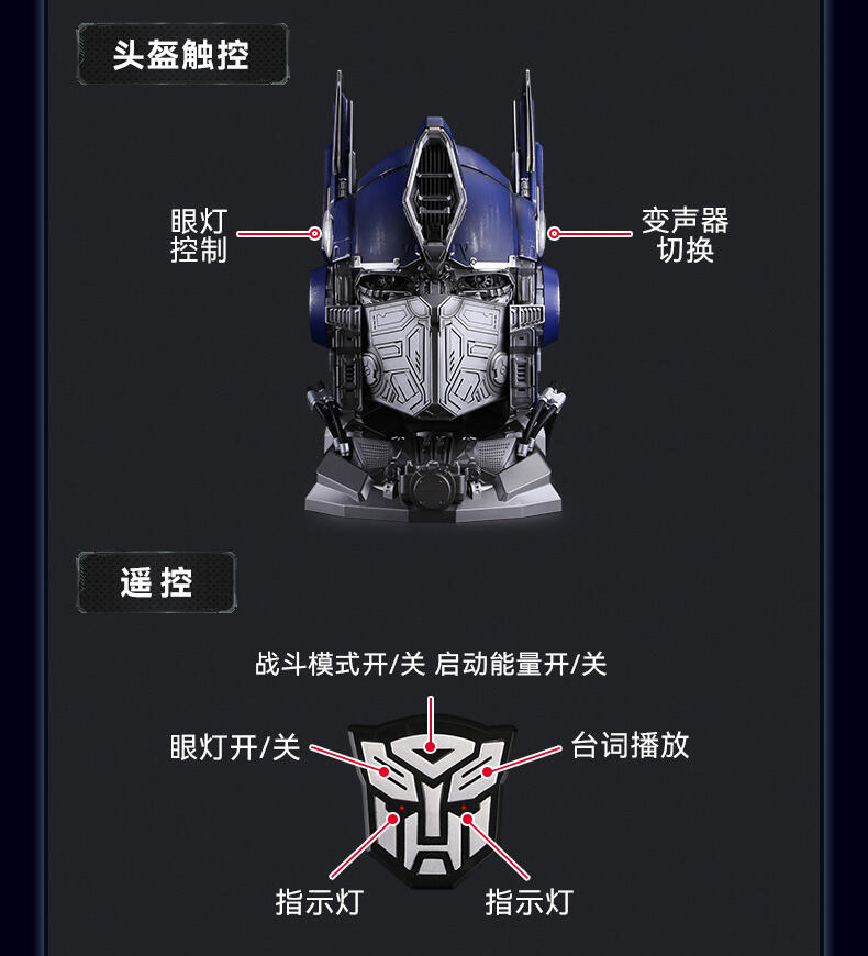1-可穿戴 / 收藏 / 展示 2-可动面罩,伴随声效,面罩同步发光摆动,机械纹路设计,内嵌红蓝灯光 3-左右两侧圆形齿轮罩正反旋转,同步机械声效,红蓝灯切换 4-顶部两侧天线内嵌LED灯条、前额格栅灯内嵌LED灯效 5-开启能量及战斗模式,伴随机械声效,面罩灯、格栅灯、圆形齿轮罩、头顶天线长灯同步亮灯,面罩可动 6-LED眼灯精细纹路复刻,可视又高级 7-擎天柱经典台词播放(面罩同步发光摆动) 8-擎天柱专属变声器(面罩同步发光摆动) 9-仿真机械变形音效,开机音效 10-电影级还原复刻,手工旧化战损涂装 11-中文语音控制 12-英文语音控制 13-两侧三角凹陷处触摸控制,设计巧妙,使用方便 14-2.4G遥控控制(博派立体脸谱标志遥控器) 15-内衬布料全包裹保护设计 16-低电压提醒,触摸唤醒