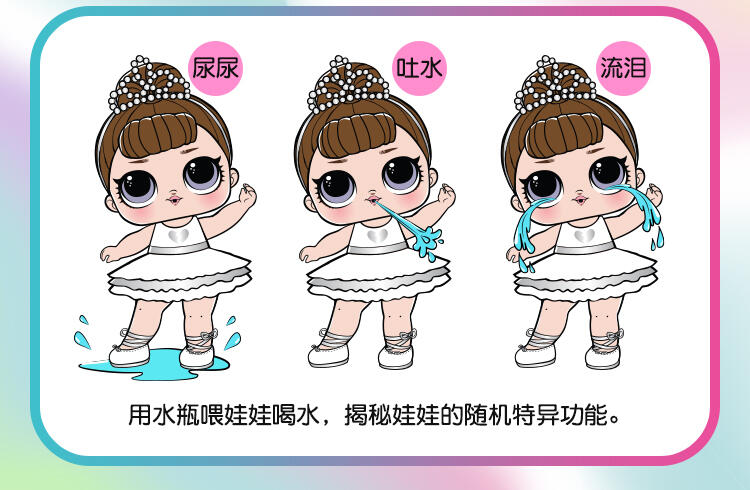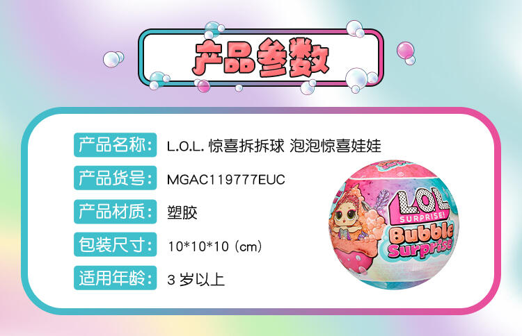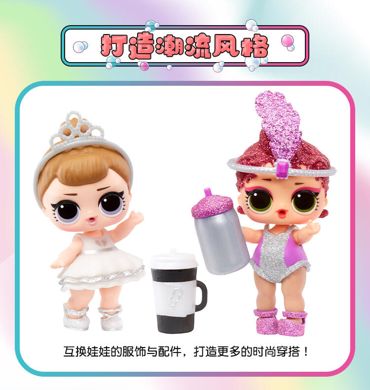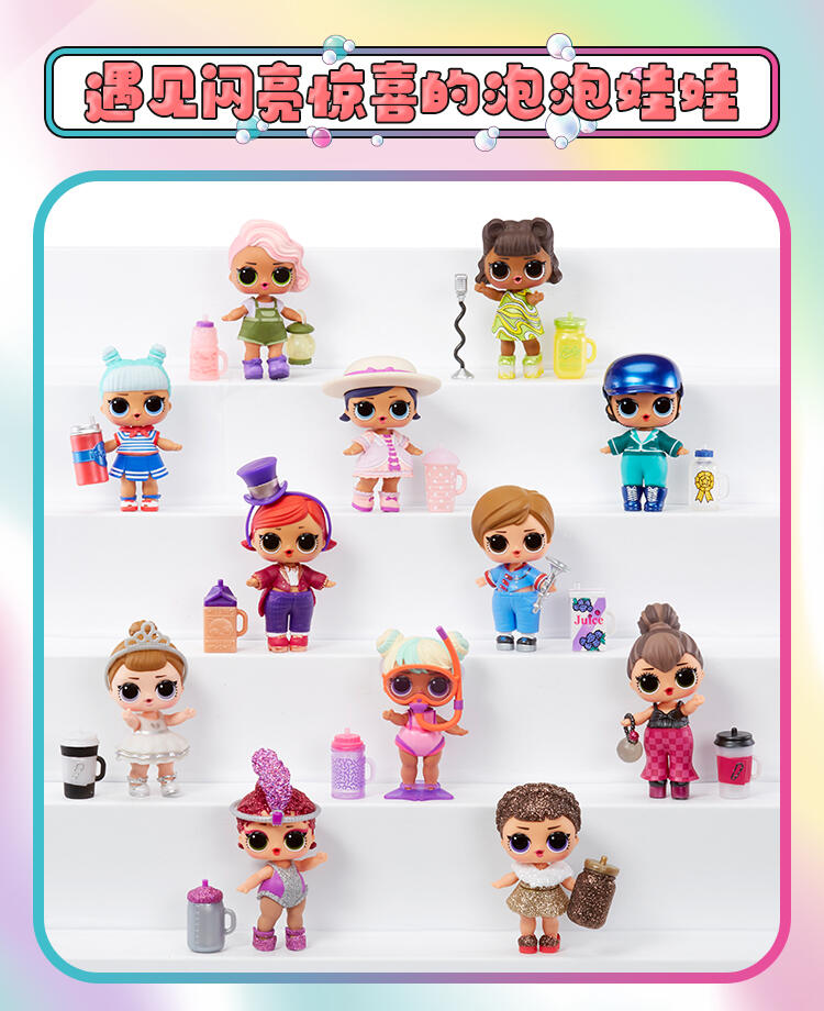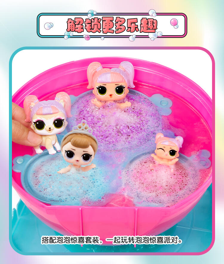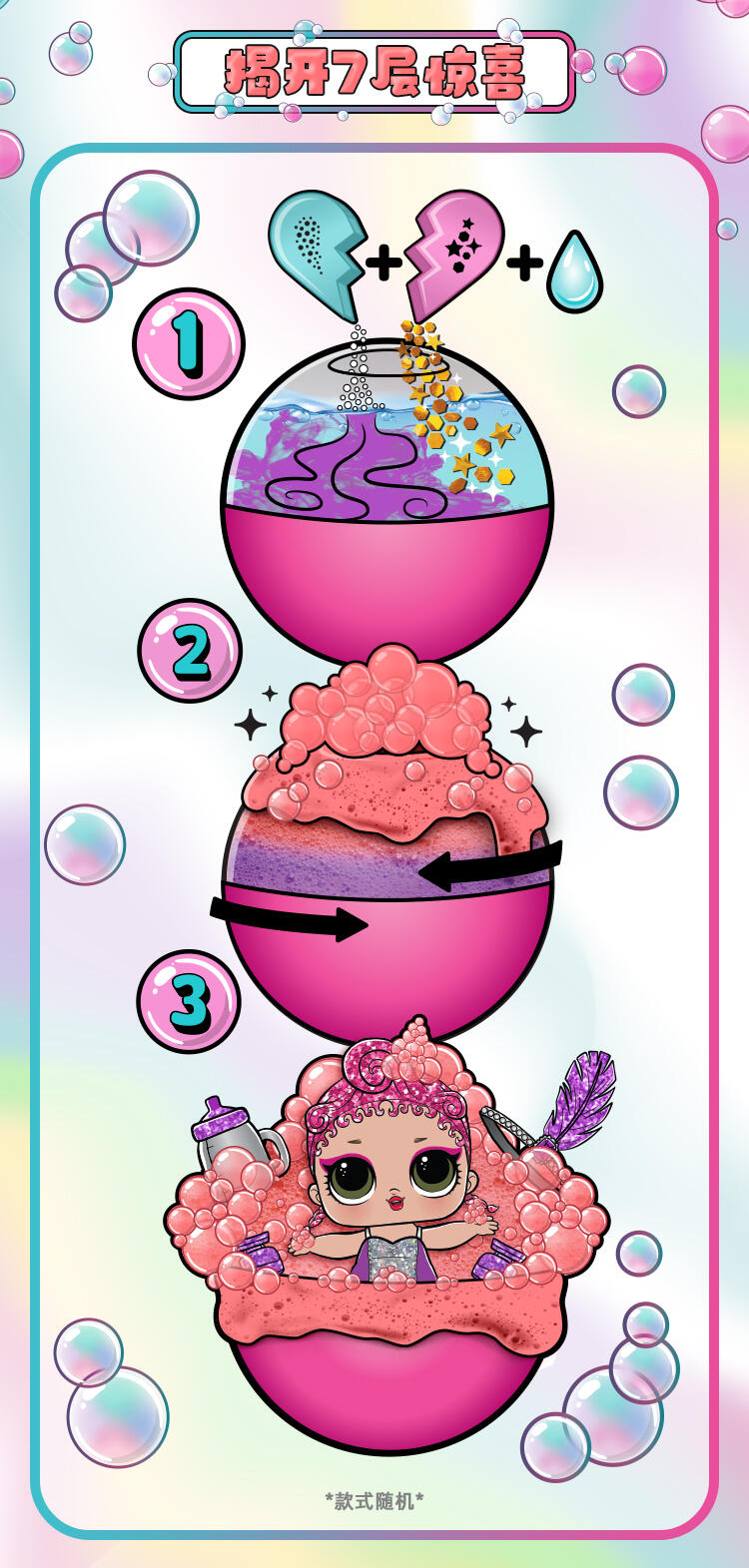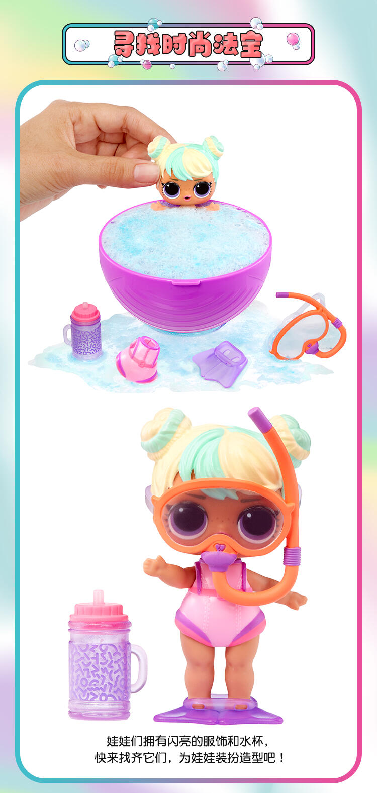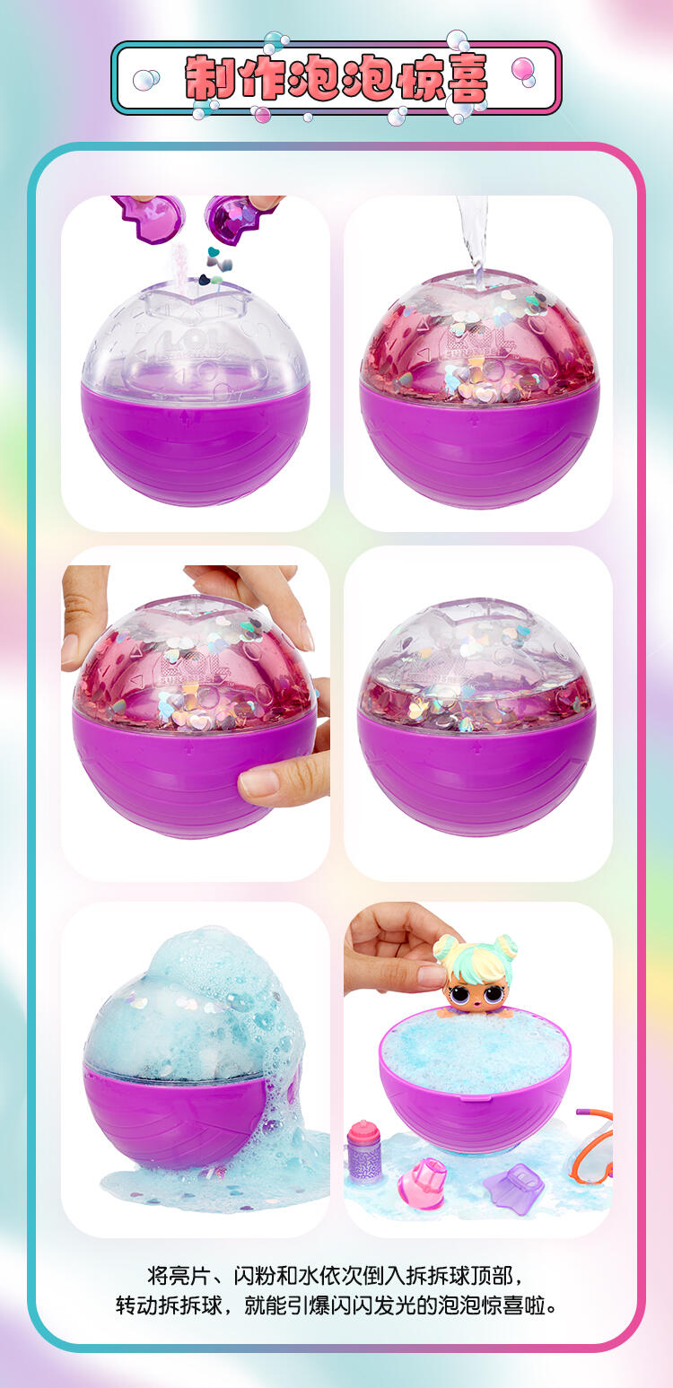 这些 L.O.L.惊喜泡泡娃娃已经准备好在您创造的闪闪发光的泡泡海中游泳了!将破碎的心碎片和水倒入 L.O.L. 惊喜球的顶部,然后看着闪闪发光的泡泡反应及改变颜色,并且呈现出惊喜的收藏娃娃!收集到所有不同颜色的球和泡泡,包括带有相配闪光的罕见玫瑰金球!