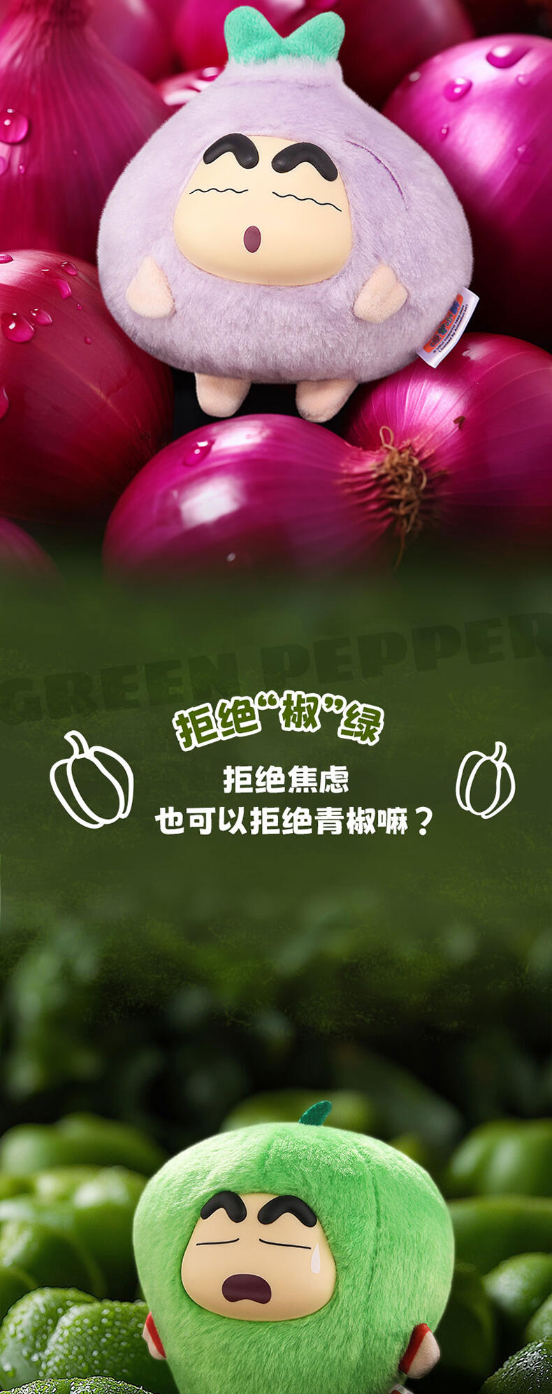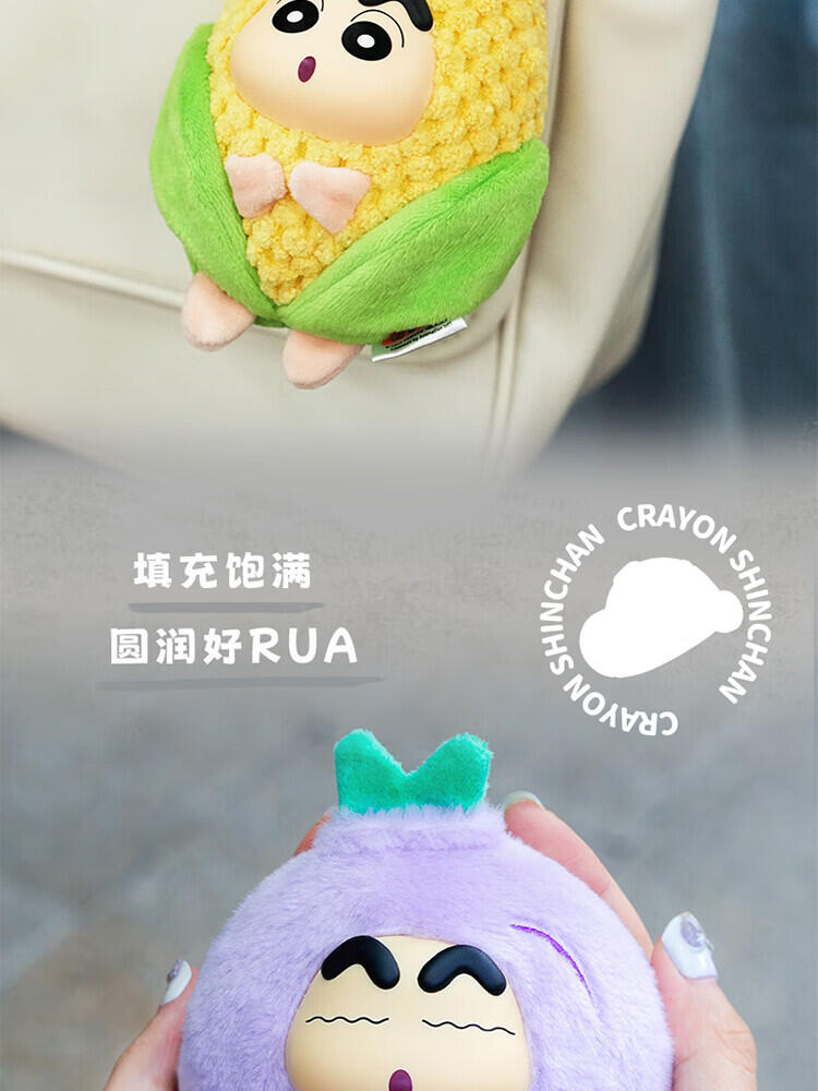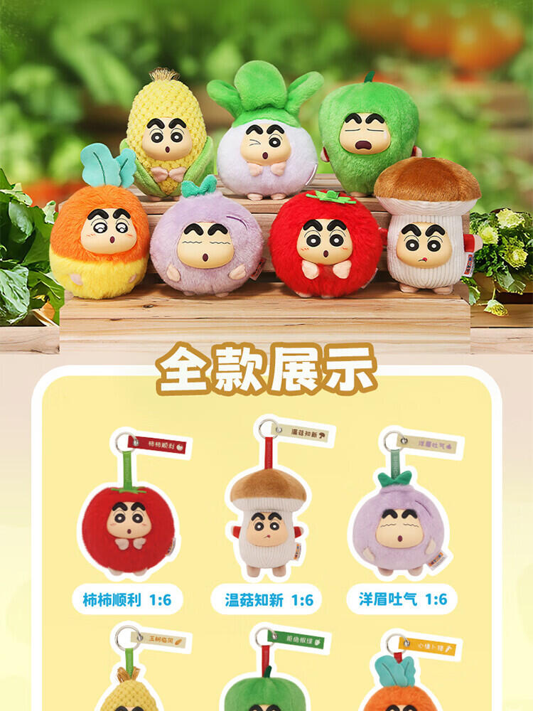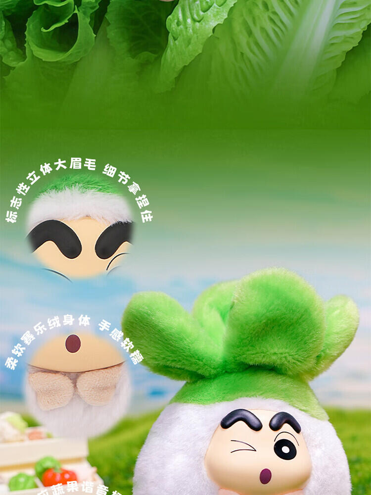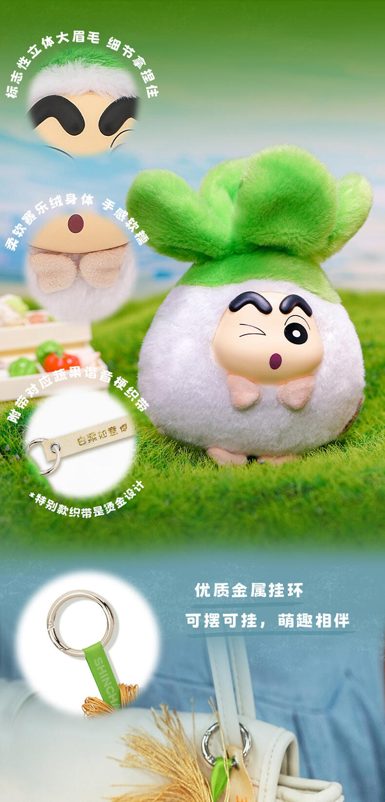 1、萌趣小新和蔬菜瓜果完美结合,可爱又好玩; 2、脸壳屁股均为搪胶材质,结合赛乐绒毛绒身体,兼具还原造型与萌软手感; 3、搭配优质挂环,可摆可挂; 4、附带印有流行谐音梗的织带,激发年轻人共鸣,自带话题流量效应。
