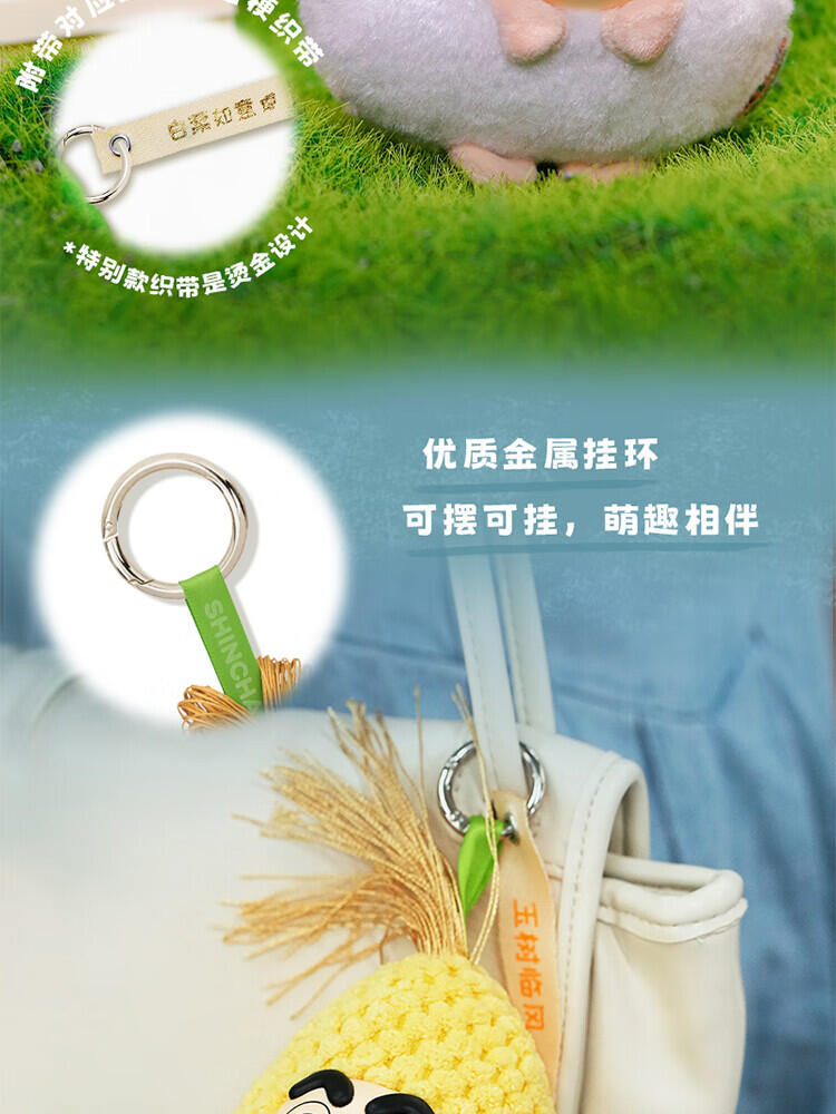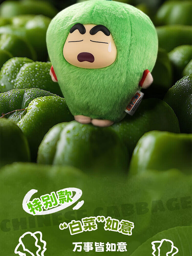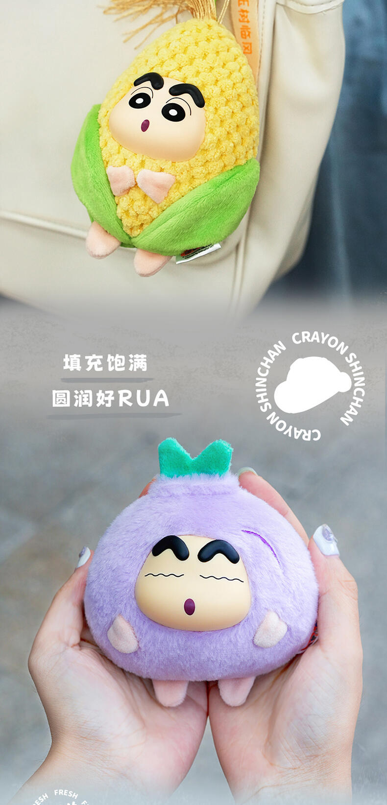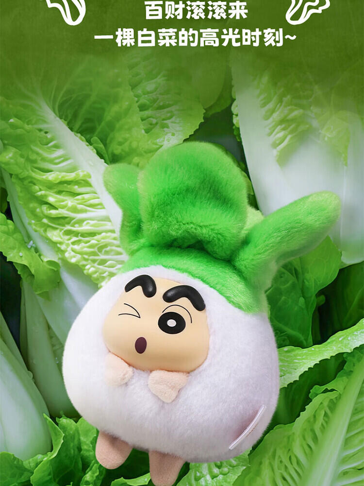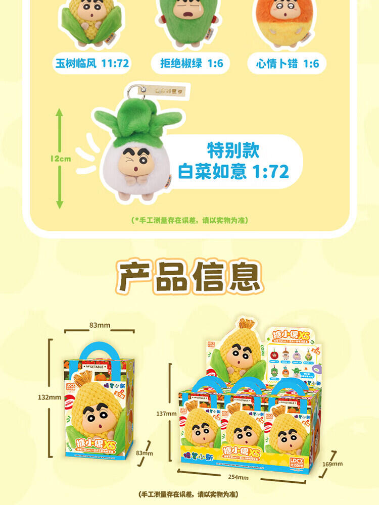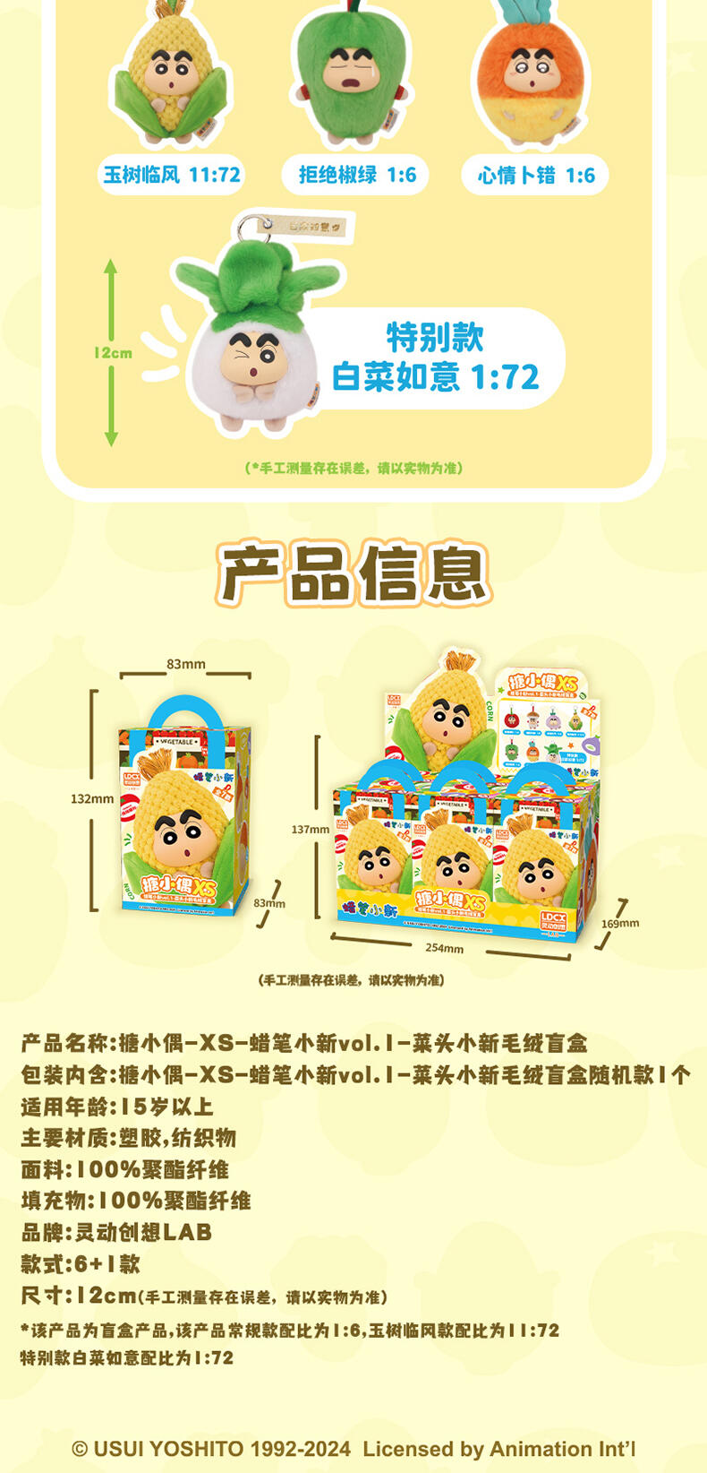 1、萌趣小新和蔬菜瓜果完美结合,可爱又好玩; 2、脸壳屁股均为搪胶材质,结合赛乐绒毛绒身体,兼具还原造型与萌软手感; 3、搭配优质挂环,可摆可挂; 4、附带印有流行谐音梗的织带,激发年轻人共鸣,自带话题流量效应。