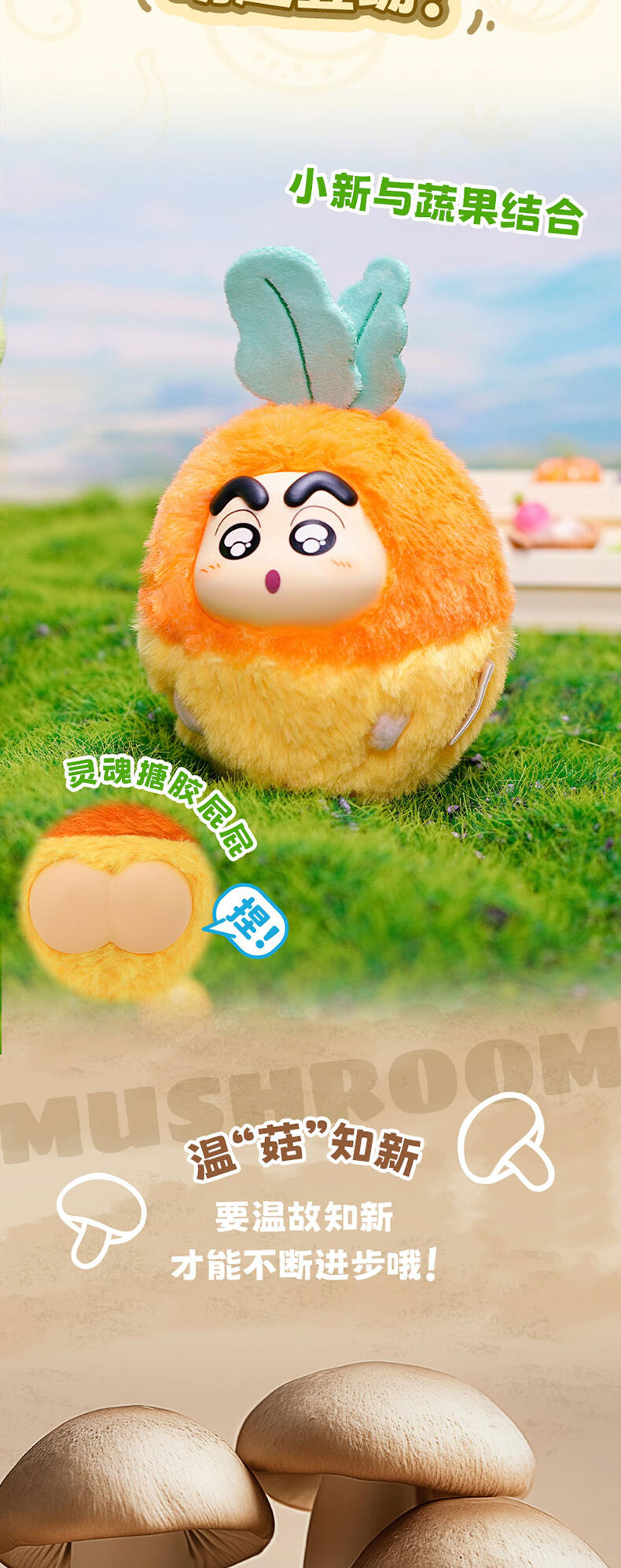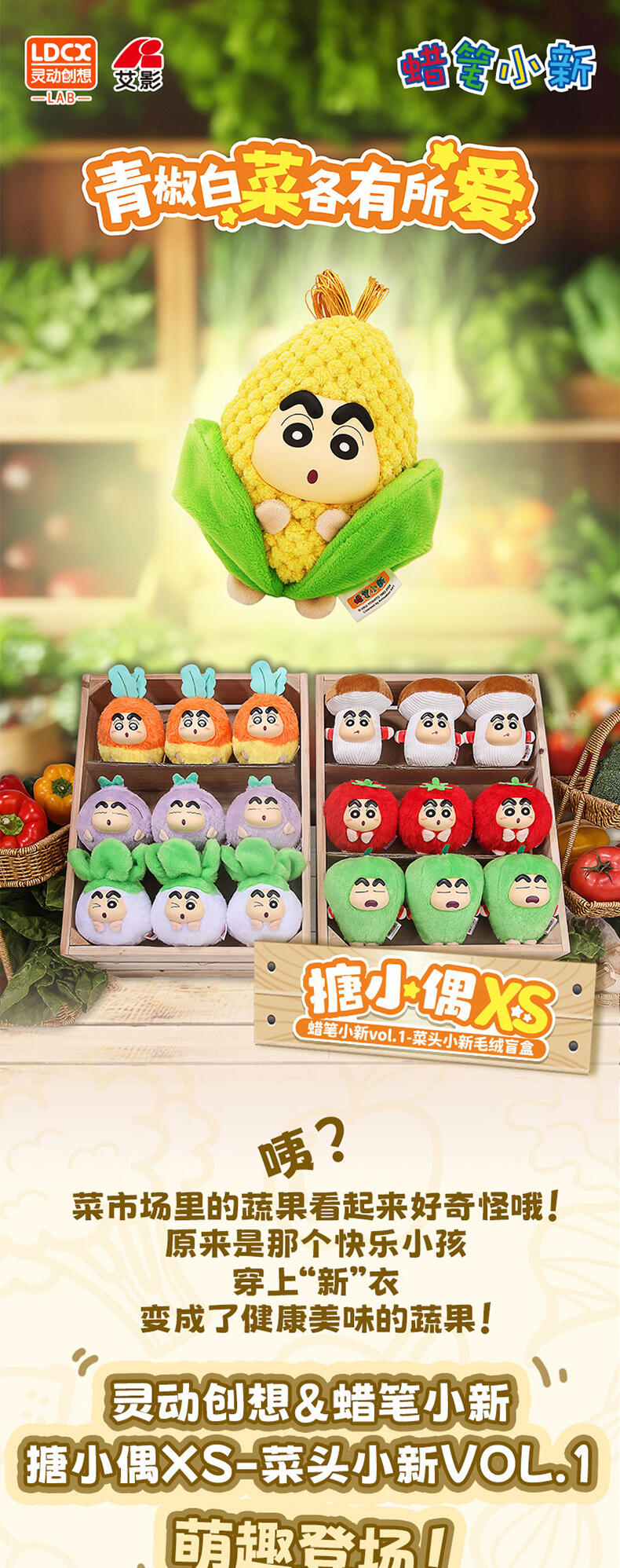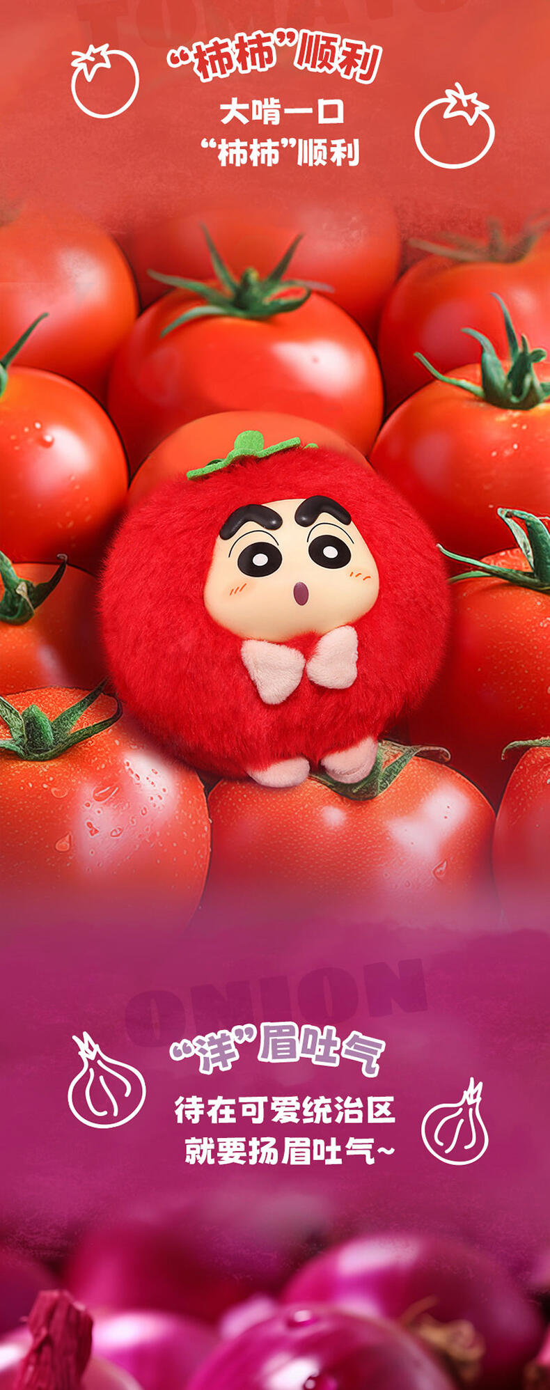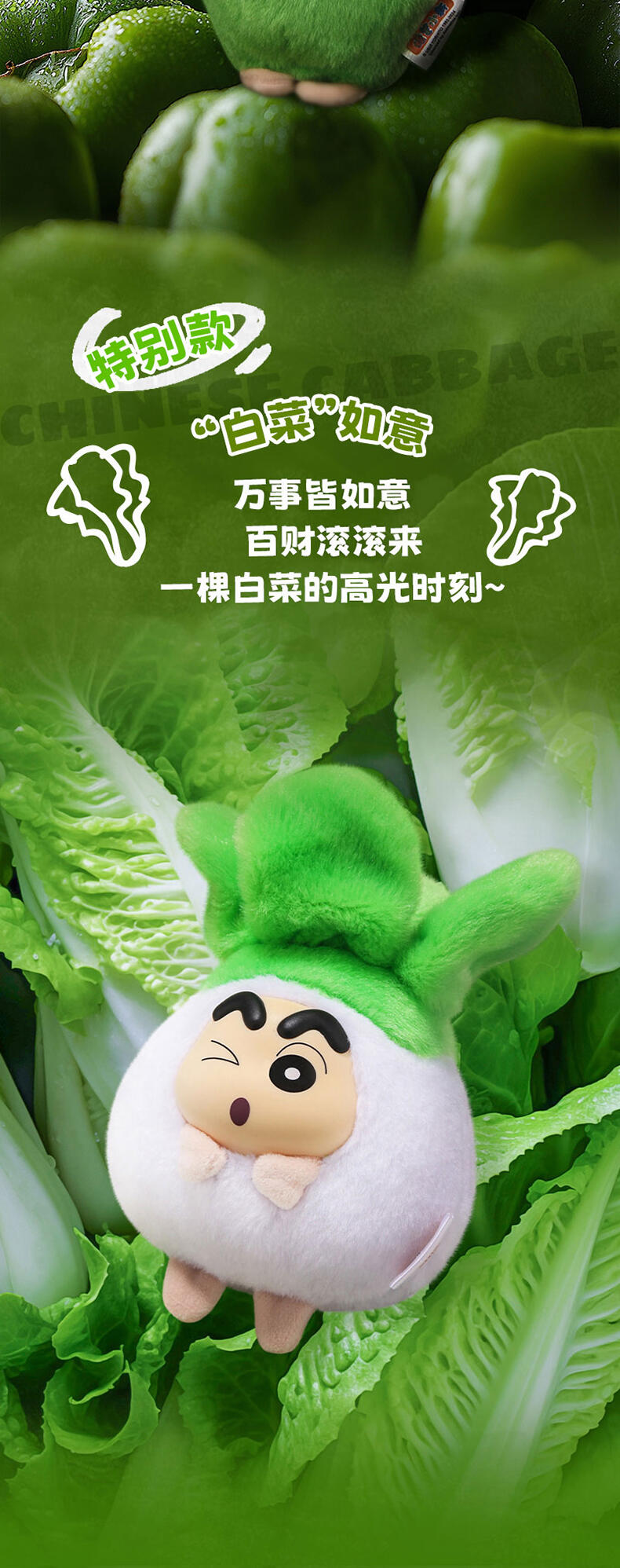 1、萌趣小新和蔬菜瓜果完美结合,可爱又好玩; 2、脸壳屁股均为搪胶材质,结合赛乐绒毛绒身体,兼具还原造型与萌软手感; 3、搭配优质挂环,可摆可挂; 4、附带印有流行谐音梗的织带,激发年轻人共鸣,自带话题流量效应。