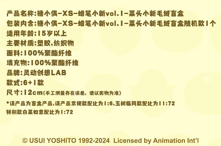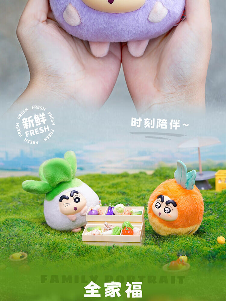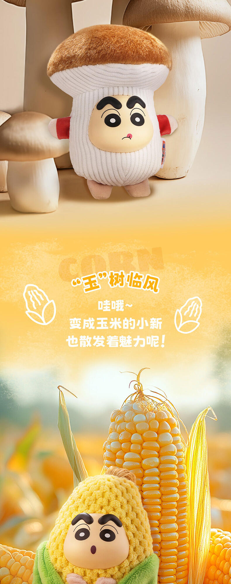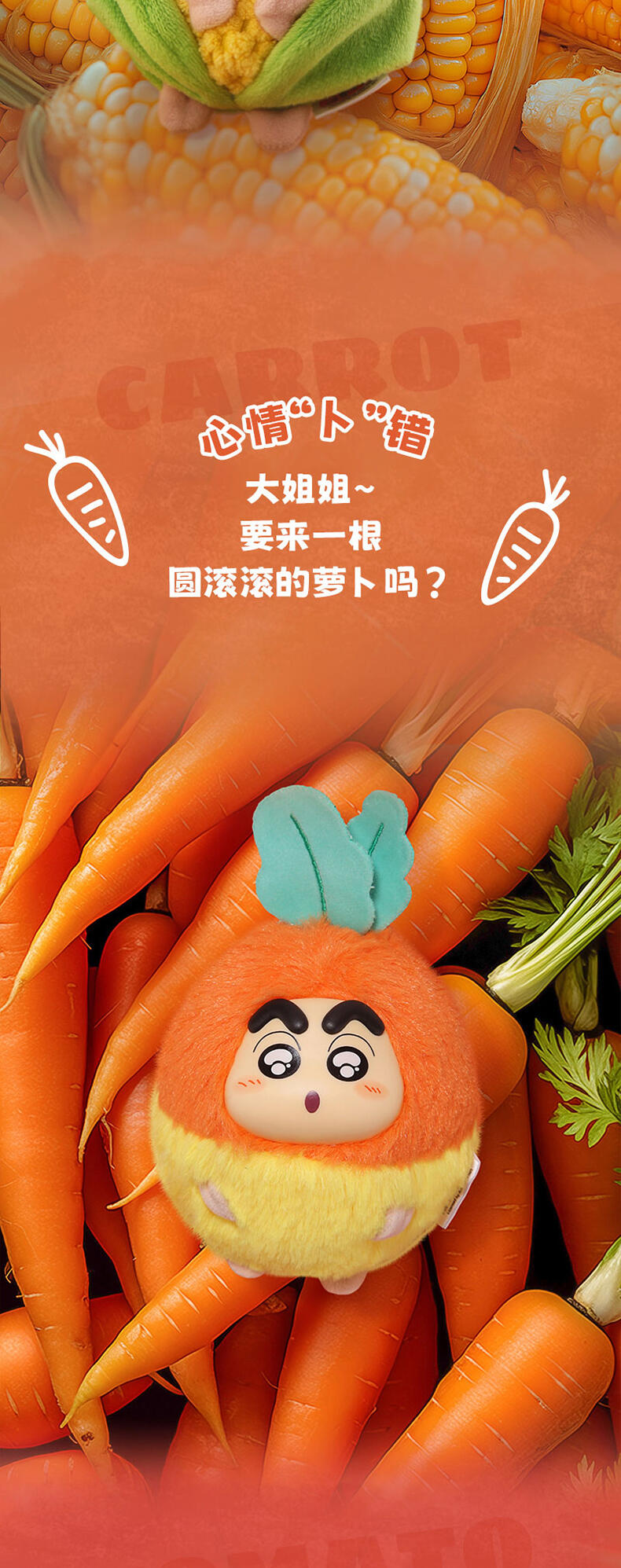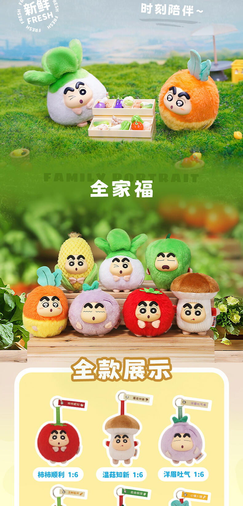 1、萌趣小新和蔬菜瓜果完美结合,可爱又好玩; 2、脸壳屁股均为搪胶材质,结合赛乐绒毛绒身体,兼具还原造型与萌软手感; 3、搭配优质挂环,可摆可挂; 4、附带印有流行谐音梗的织带,激发年轻人共鸣,自带话题流量效应。