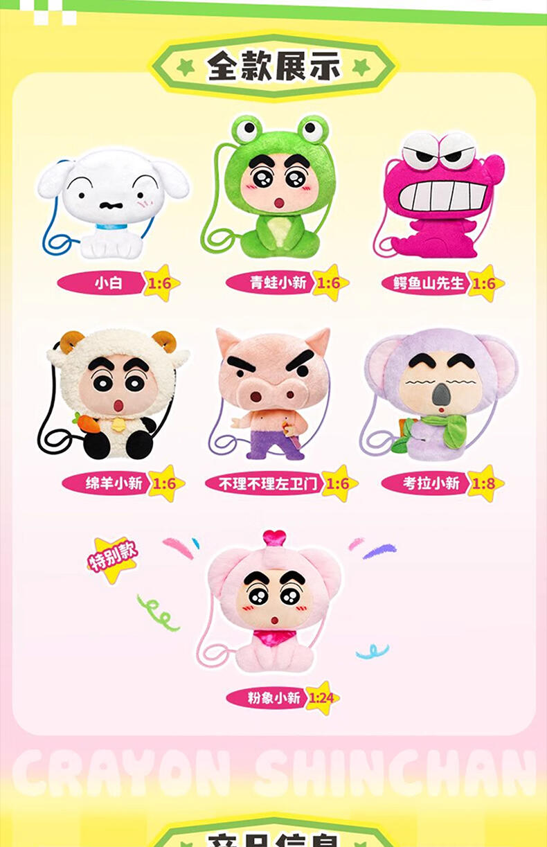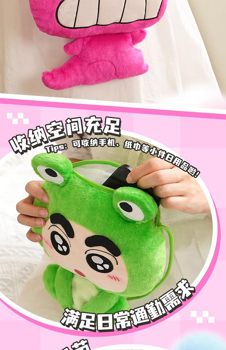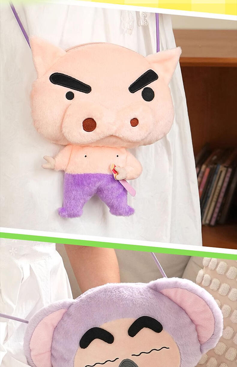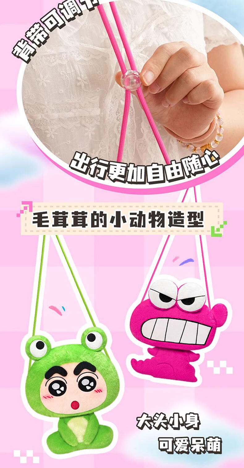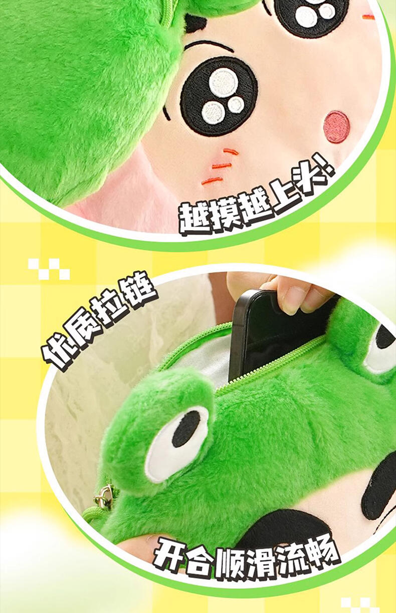 1、毛绒绒的动物造型小新和小伙伴,Q版大头小身造型,可爱Q萌; 2、容量刚好可收纳手机小物,满足日常通勤; 3、优质拉链,顺滑流畅; 4、赛乐绒材质,手感丝滑。
