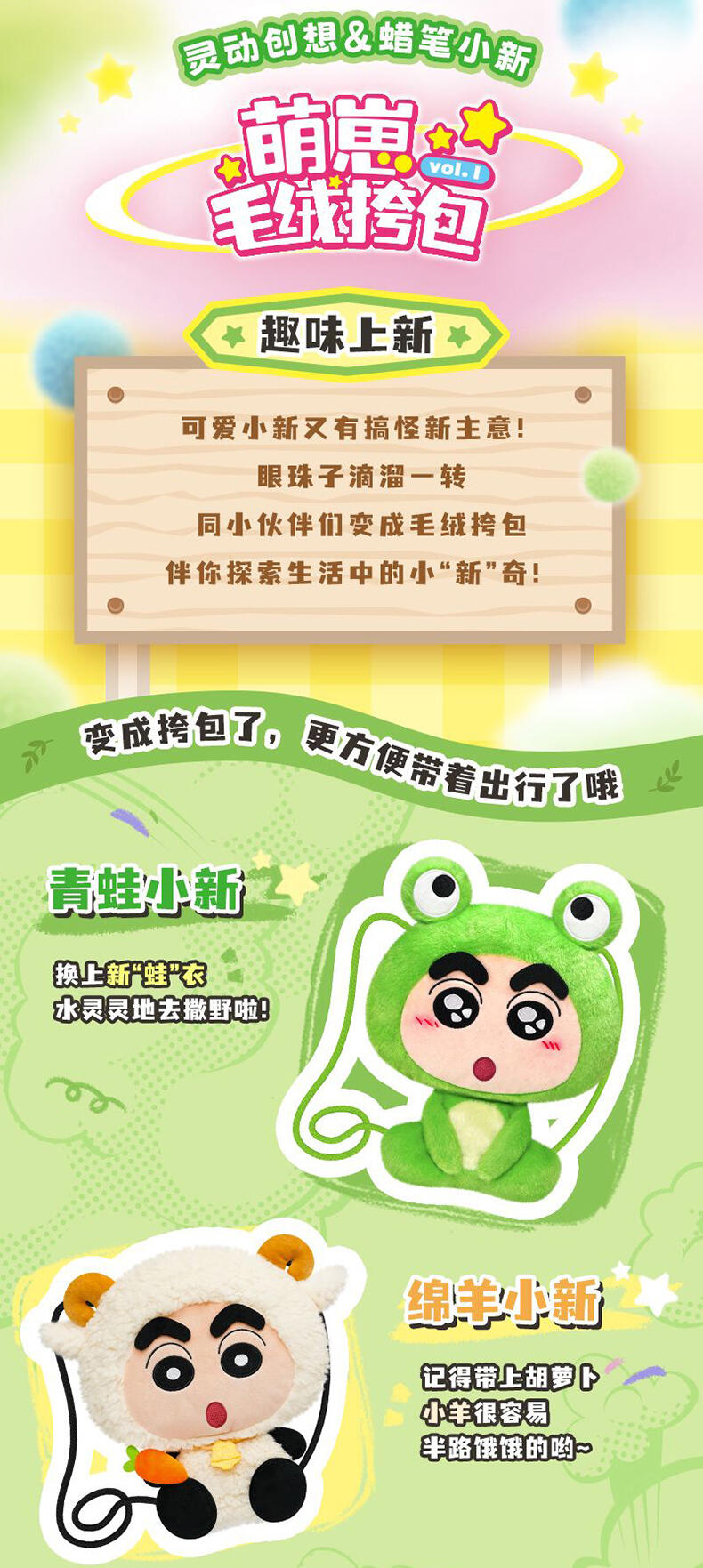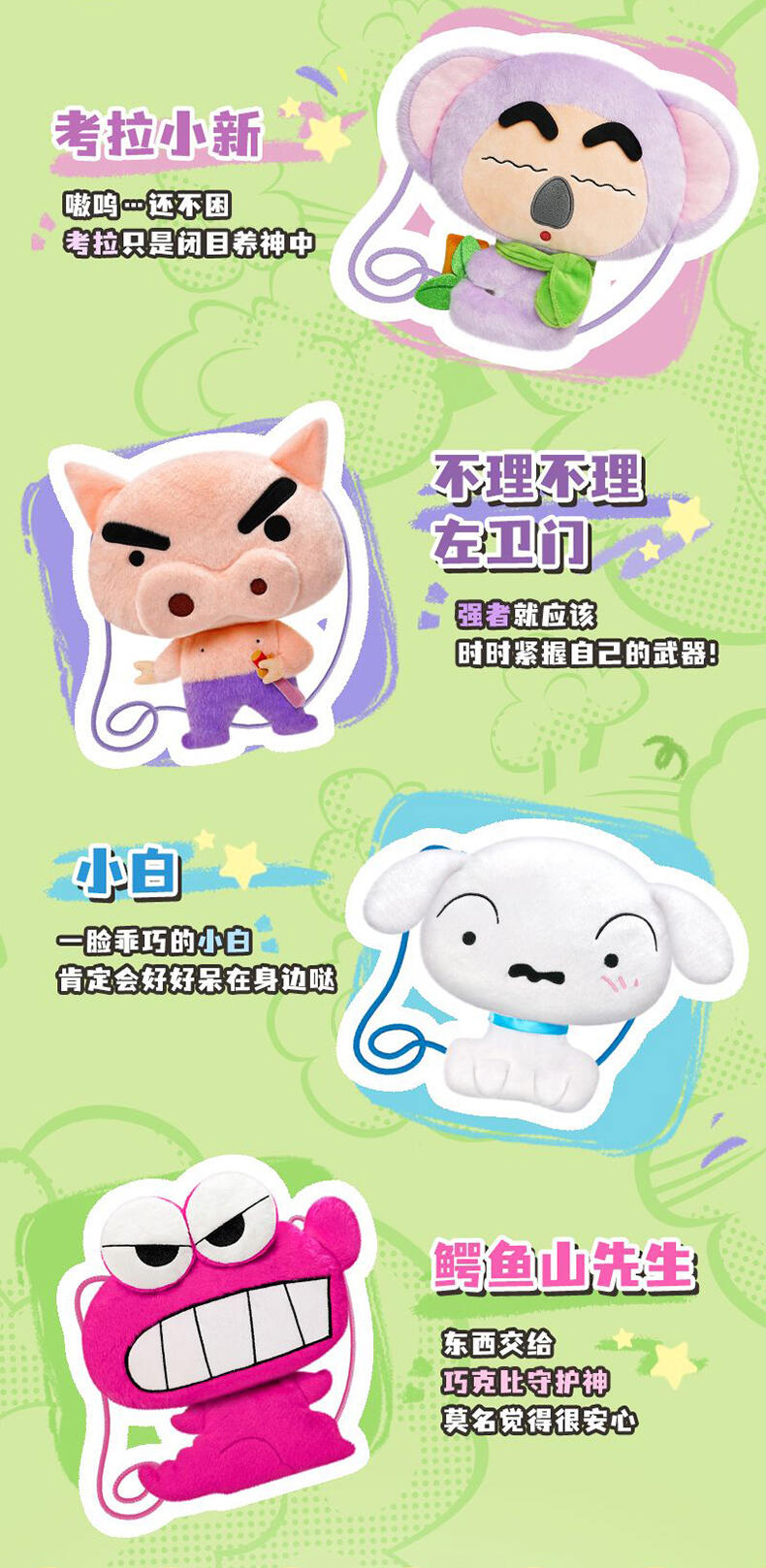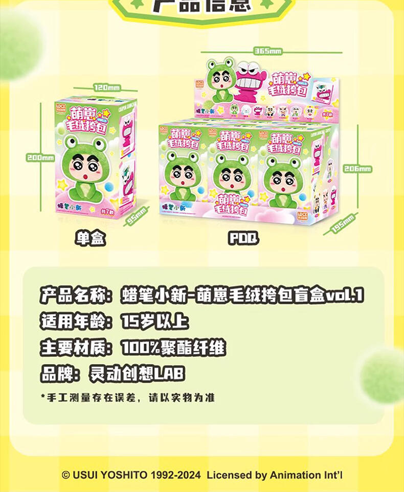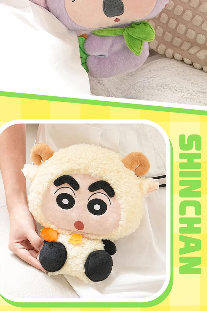 1、毛绒绒的动物造型小新和小伙伴,Q版大头小身造型,可爱Q萌; 2、容量刚好可收纳手机小物,满足日常通勤; 3、优质拉链,顺滑流畅; 4、赛乐绒材质,手感丝滑。