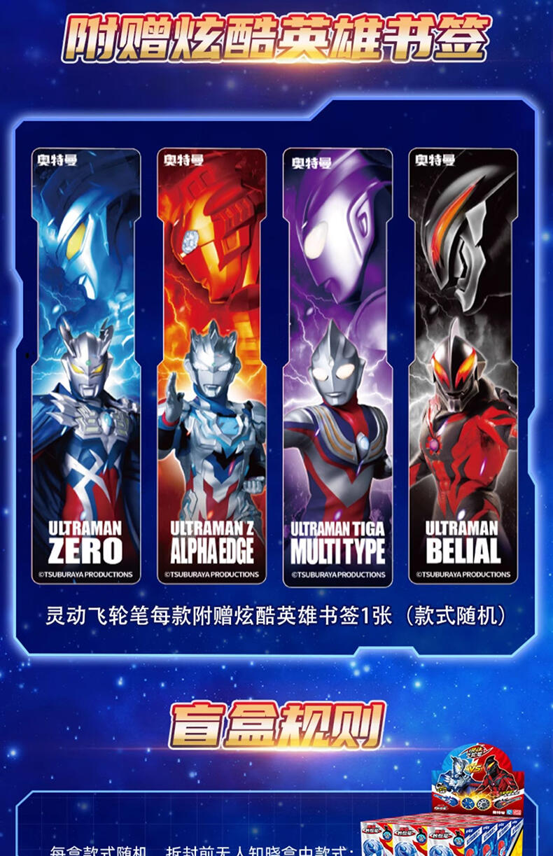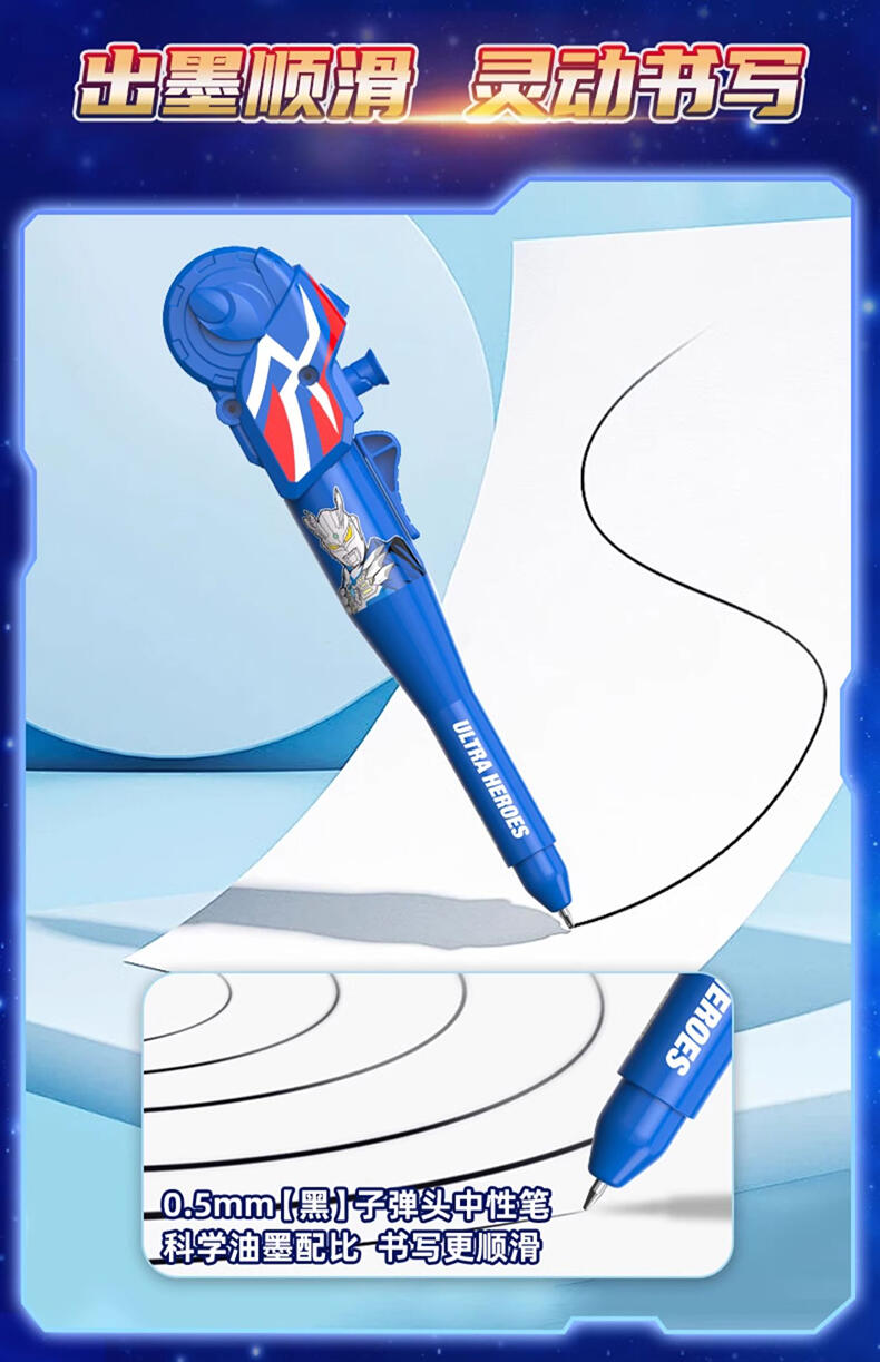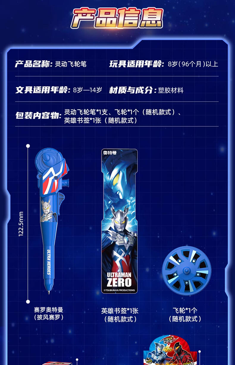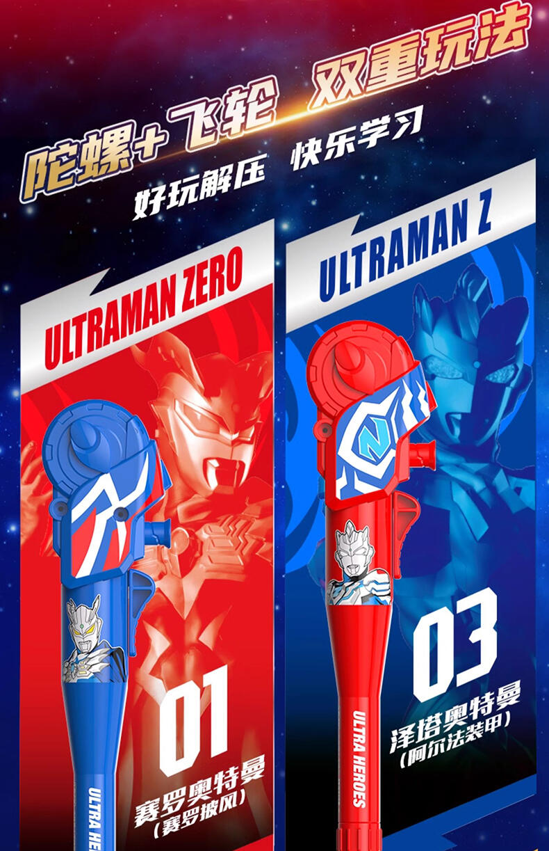 陀螺旋风,双重惊喜,好玩解压,快乐学习 1、奥特曼超级IP:男童第一超级IP,渠道引流神器! 2、创新升级:继灵动陀螺笔又一创新突破,更好玩,更解压 3、双重惊喜:陀螺旋风轮双重玩法惊喜,陀螺对战,飞轮回旋 4、学习解压:创意减压文具,缓解学习压力,为学习充电 5、书写流畅:科学油墨配比,出墨顺滑,书写流畅
