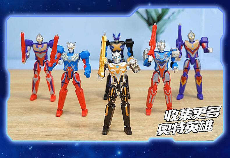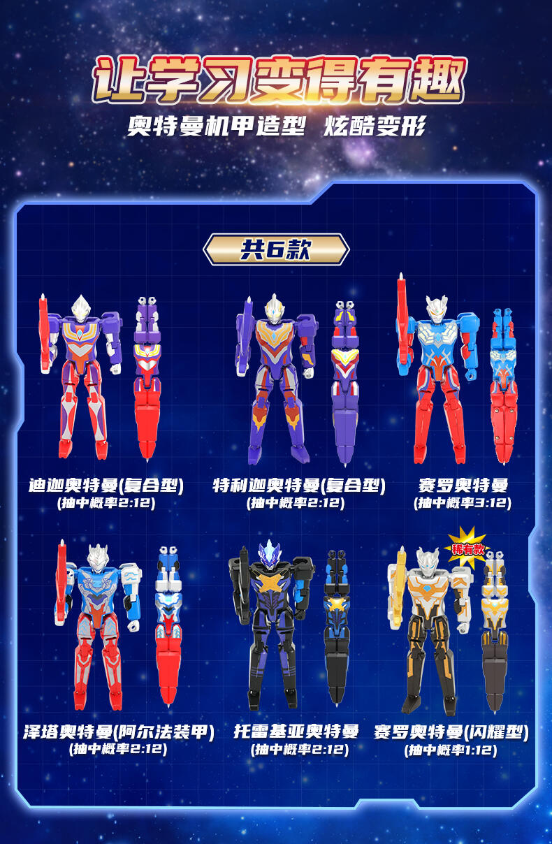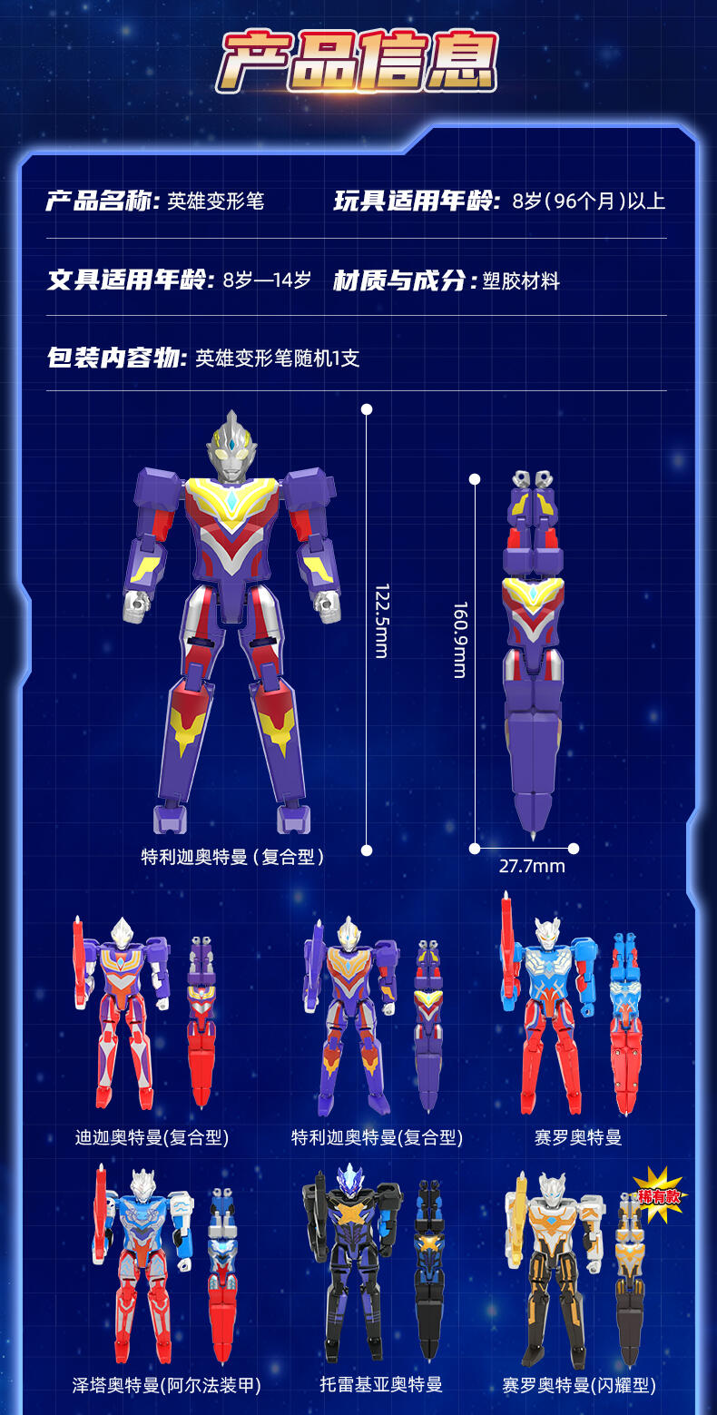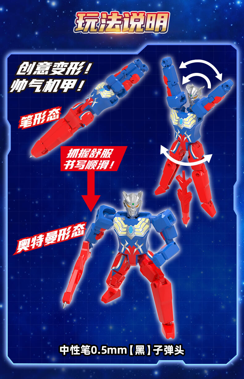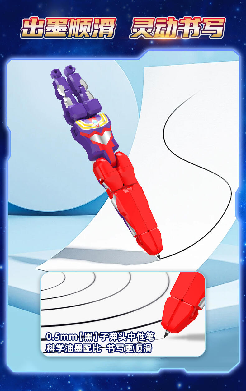 二合一机甲变形笔,炫酷变形创想无限。 1、奥特曼超级IP:男童第一超级IP,渠道引流神器! 2、趣味变形:创意手动变形,将笔变形3、成帅气机甲风格的奥特曼 灵活可动:6处关节可动,发挥想象力摆出炫酷机甲造型 4、学习解压:创意减压文具,缓解学习压力,为学习充电 5、书写流畅:科学油墨配比,出墨顺滑,书写流畅