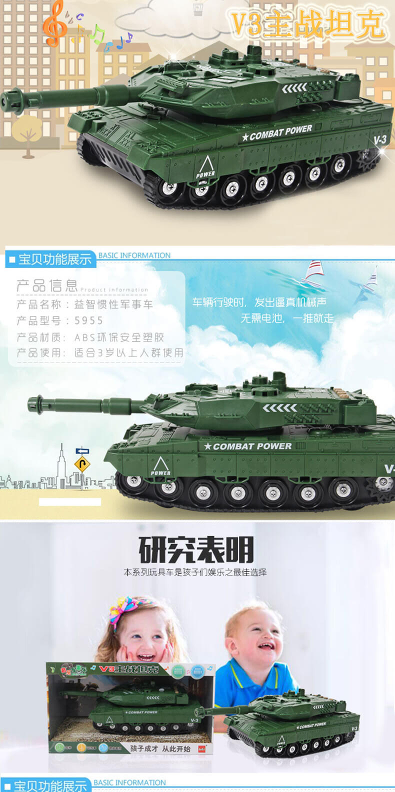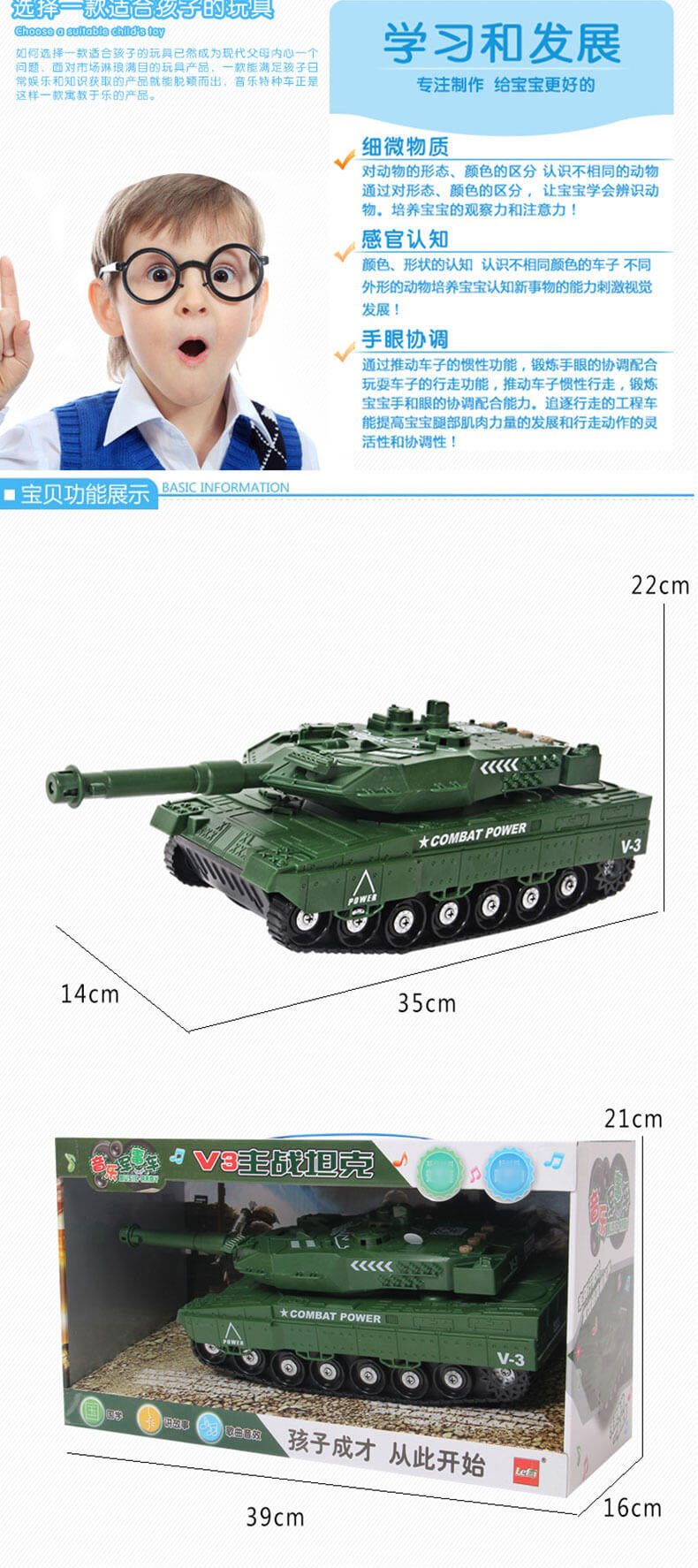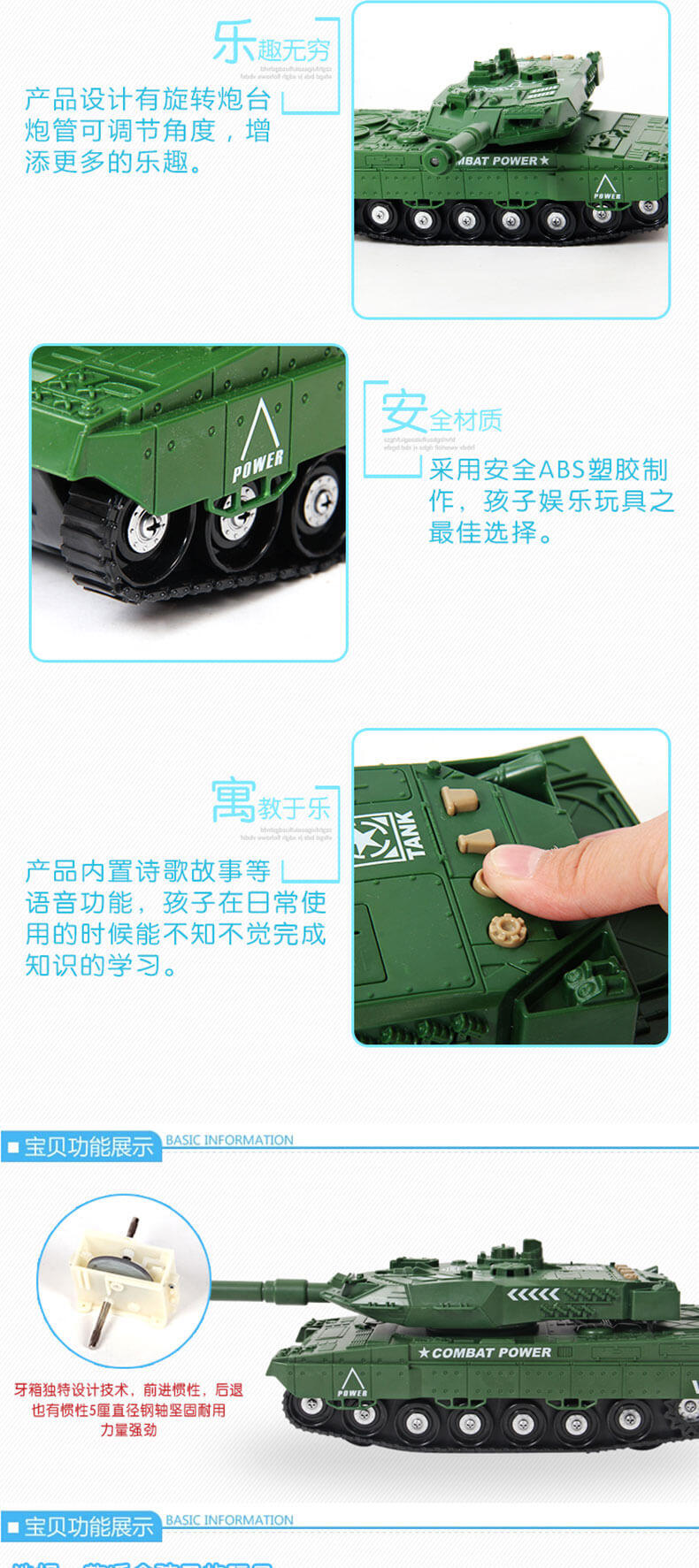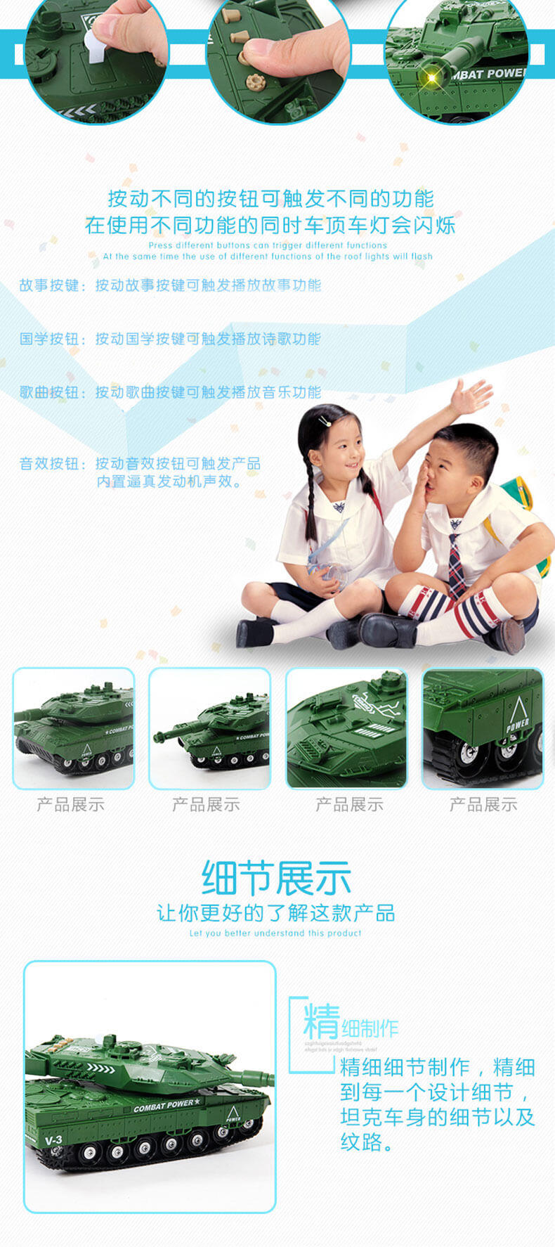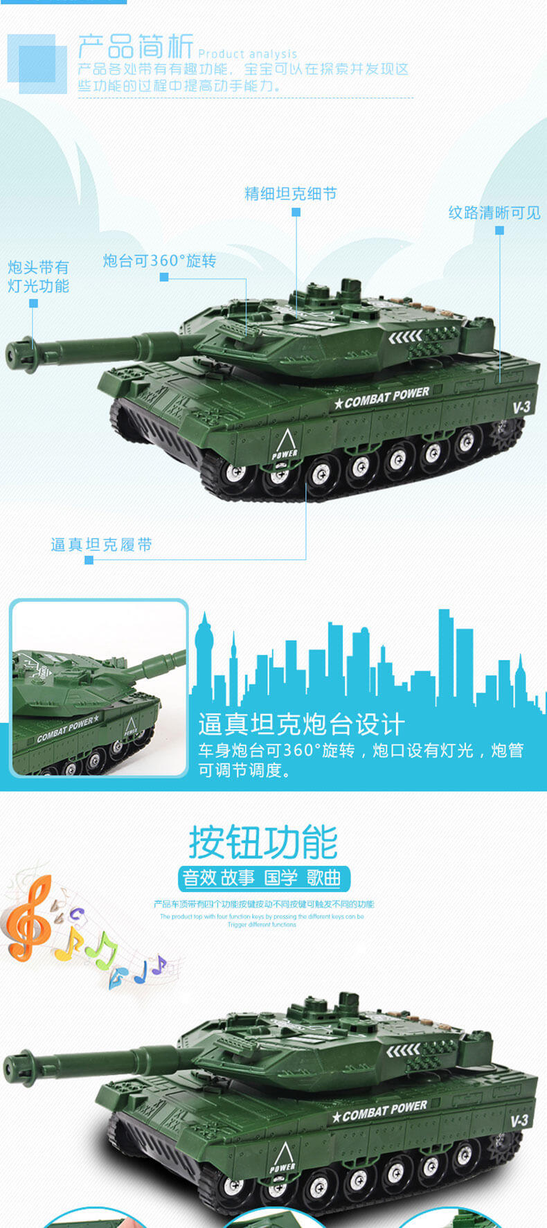 坦克具有三种不同的功能,炮头灯光功能。炮台360度旋转,另配有多功能按键,可以放播放音乐,讲故事。需配合三粒“AG13”1.5伏纽扣电池使用