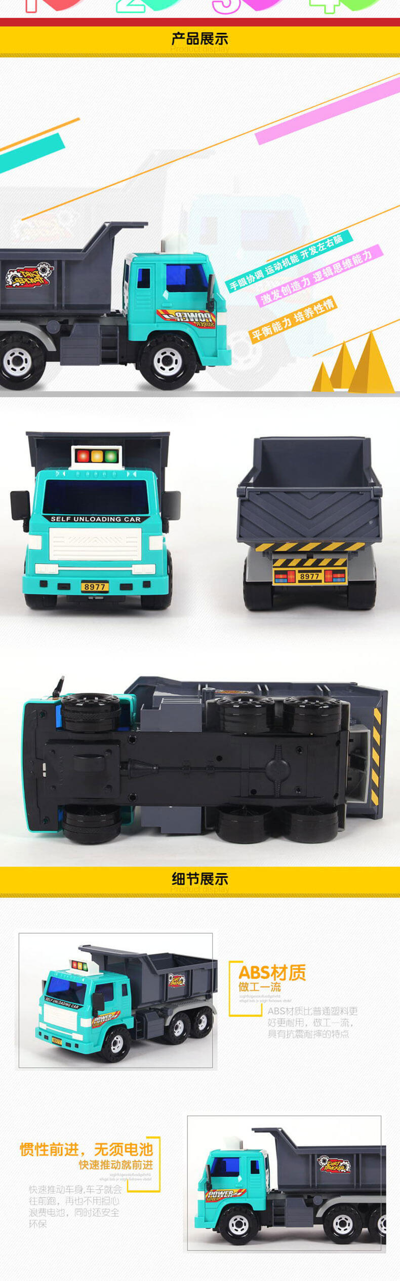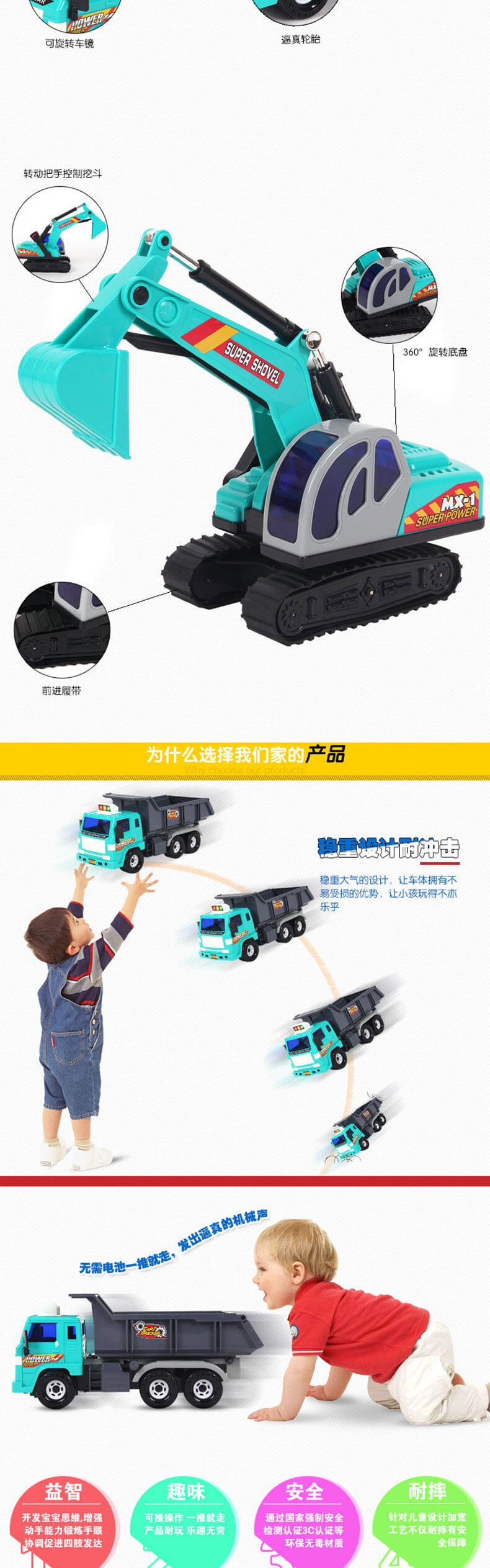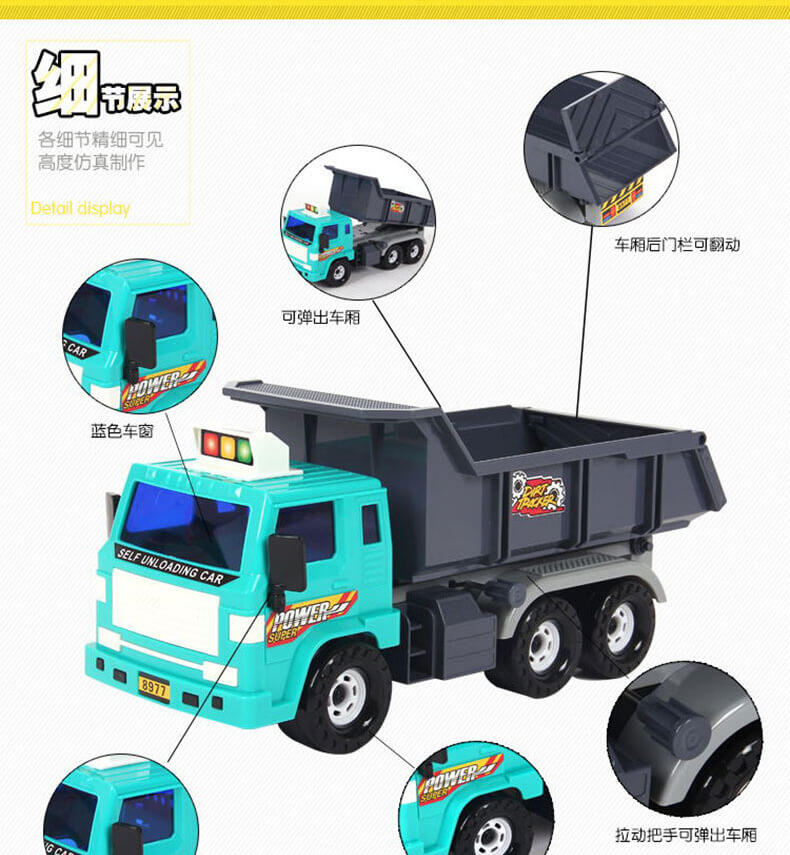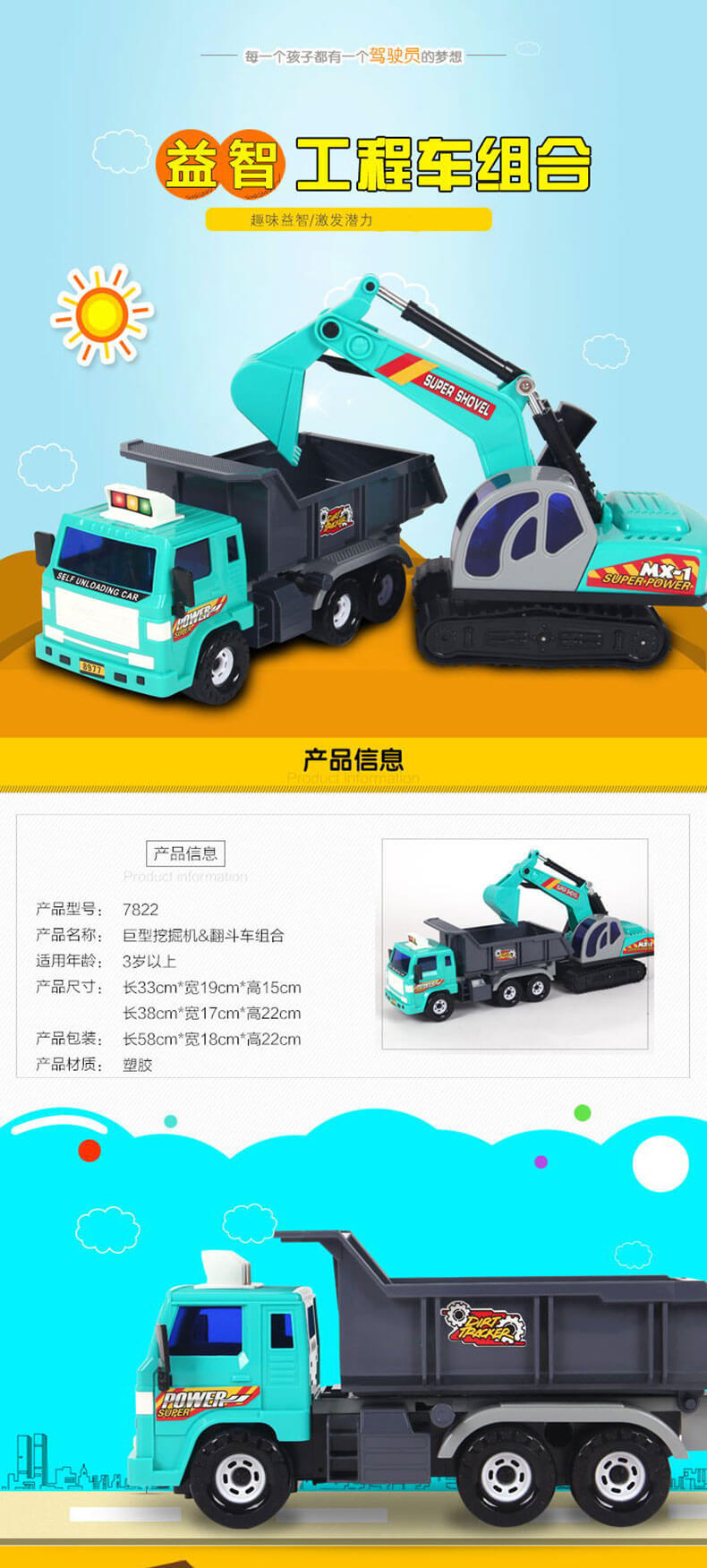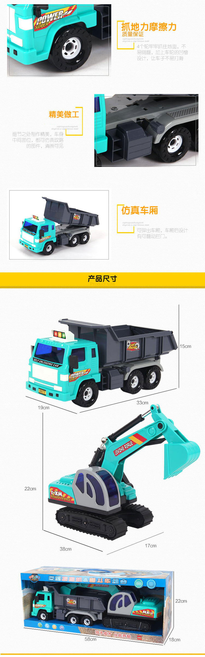 挖掘机手动摇动,铲臂挖斗可以动.翻斗车的车厢后门可翻动。逼真的轮胎,可旋转车镜,拉动把手,可弹出车车厢。