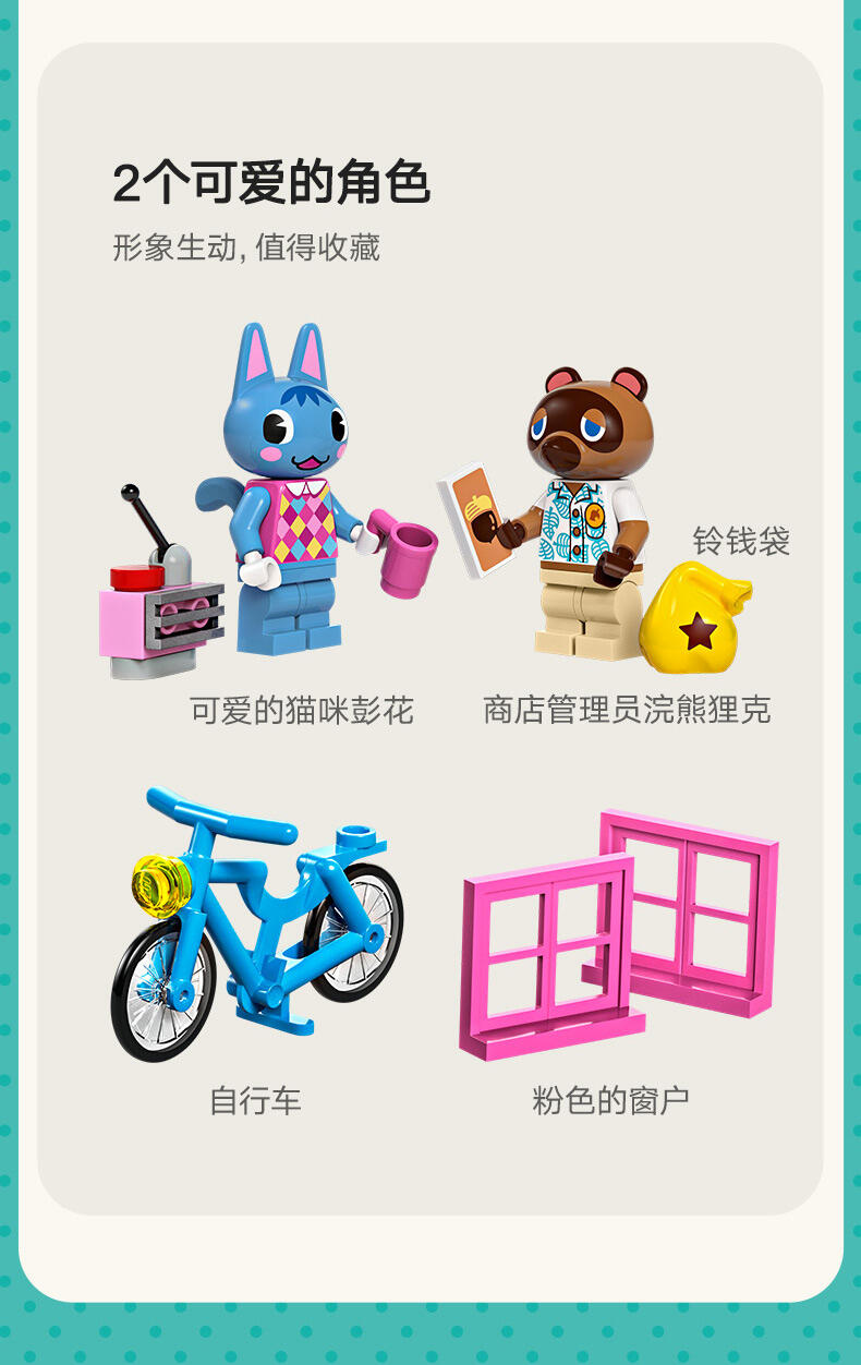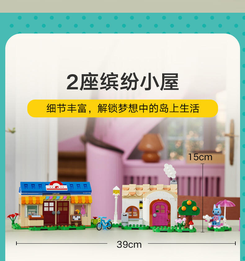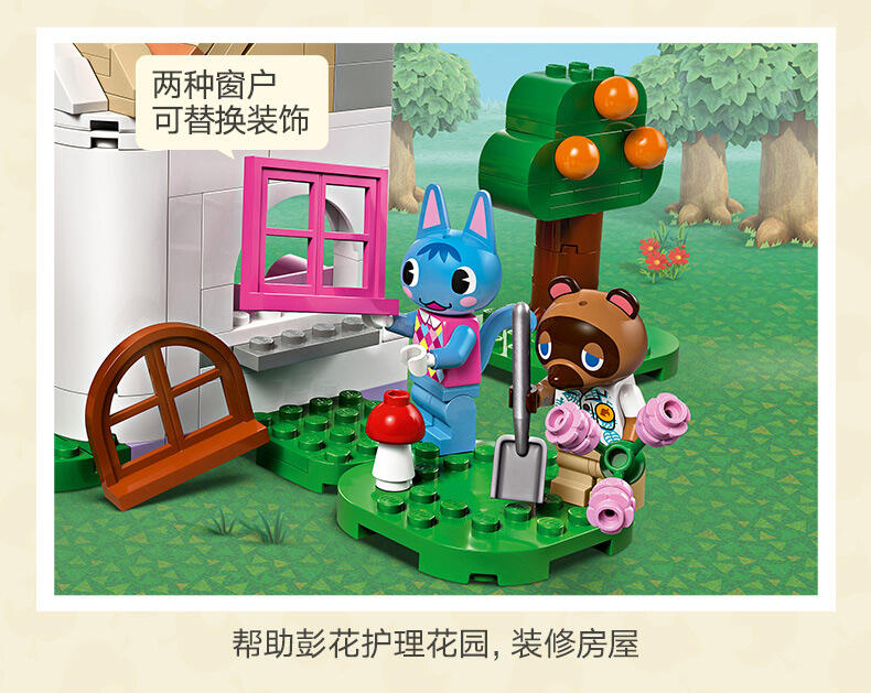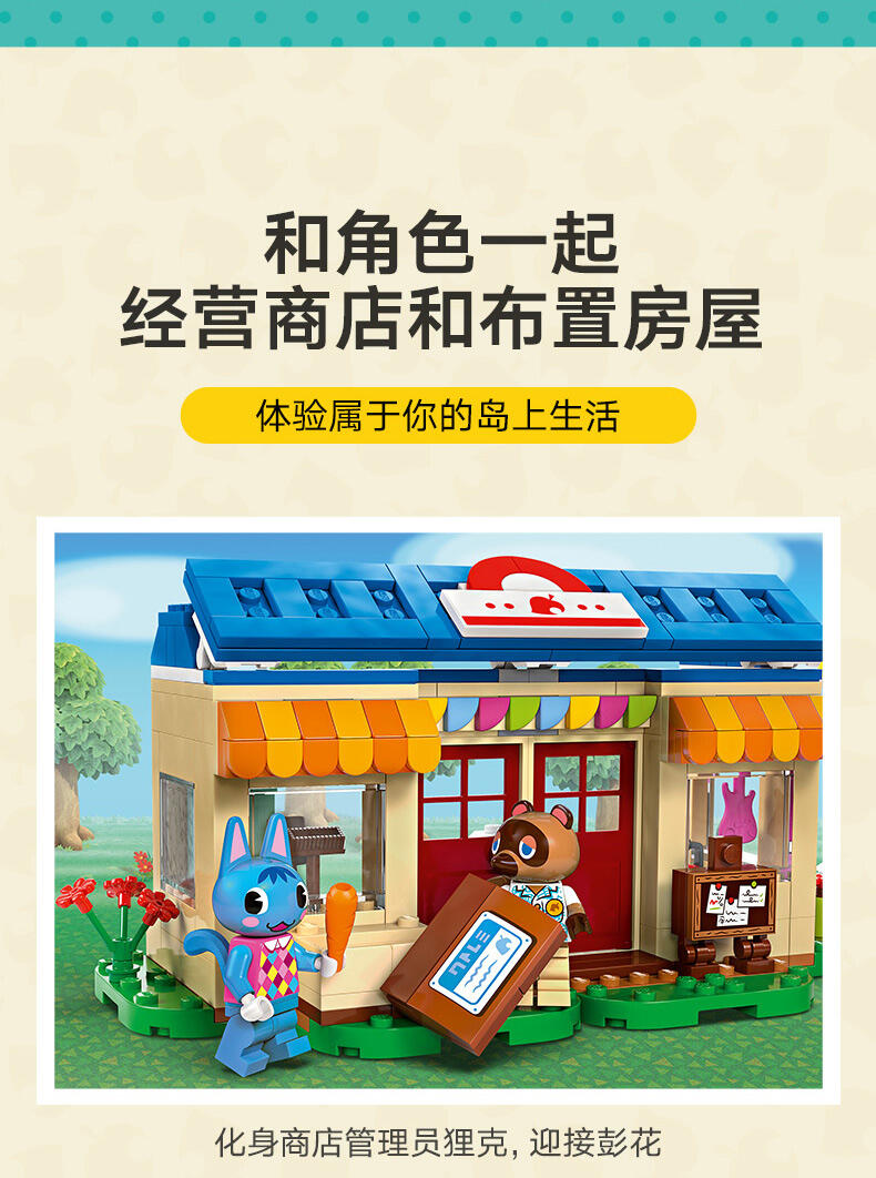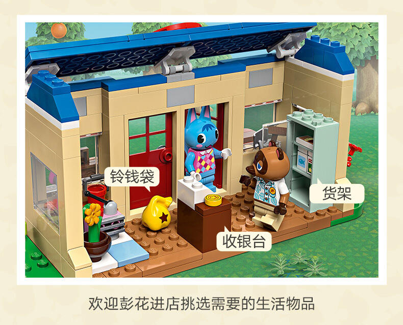 - 细节丰富的 Nook 商店与彭花的家套装——系列源自《动物森友会 》的玩具套装,7 岁及以上喜爱此电子游戏系列的男孩和女孩可以瞬间辨识出它们,并进行各式各样的定制 可以定制的儿童玩具——这款拼搭玩具包含彭花和狸克小人仔、2 座标志性的《动物森友会 》建筑、许多配件和可以互换的底板 可以拼搭的《动物森友会 》玩具——到 Nook 商店购买工具或借铃钱,然后顺道拜访彭花,品尝纸杯蛋糕,通过信箱寄信,以及帮助她重新布置家具 充满故事灵感启发物——本套装包含许多标志性组件,如 DIY 手册、公告牌、纸杯蛋糕、鱼饵,以及内部带有惊喜的树木,就像在游戏中一样 《动物森友会 》礼物——此拼搭玩具可作为此电子游戏系列和创意玩乐爱好者的特殊场合礼物或生日礼物 动物森友会 套装提供数字化拼搭说明——LEGO Builder 应用程序为本套装提供数字版拼搭说明 让孩子自由发挥创造力——借助其模块化底板和大量配件,内容丰富的乐高 动物森友会 系列玩具允许孩子们决定自己展示品的设计 可为小拼搭师带来很多乐趣——这款套装内含 535 块组件,在标准布置下尺寸为:高 15 厘米(6 英寸)、宽 39 厘米(15 英寸)和深 14 厘米(5.5 英寸)
