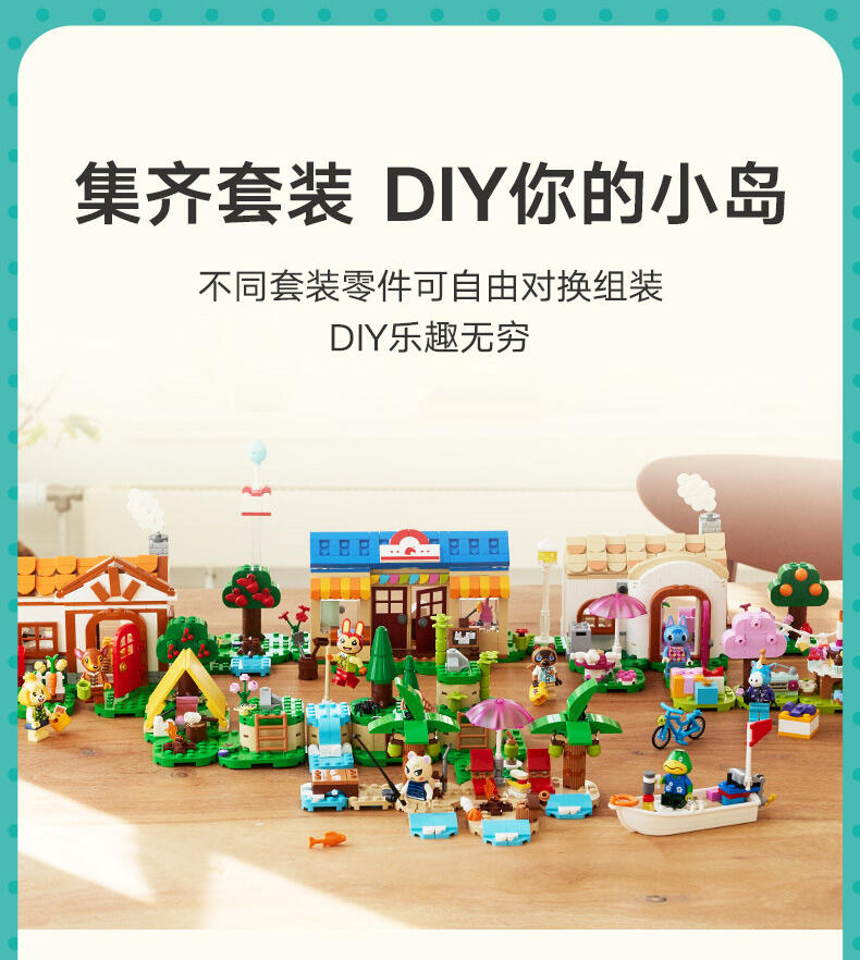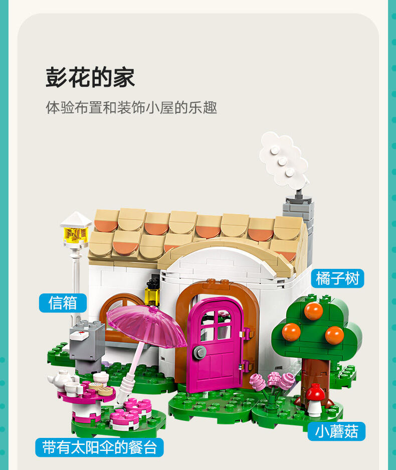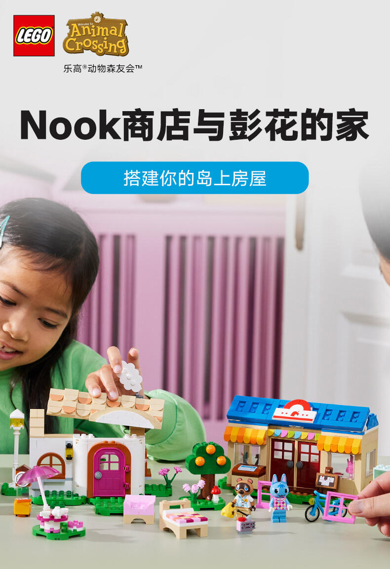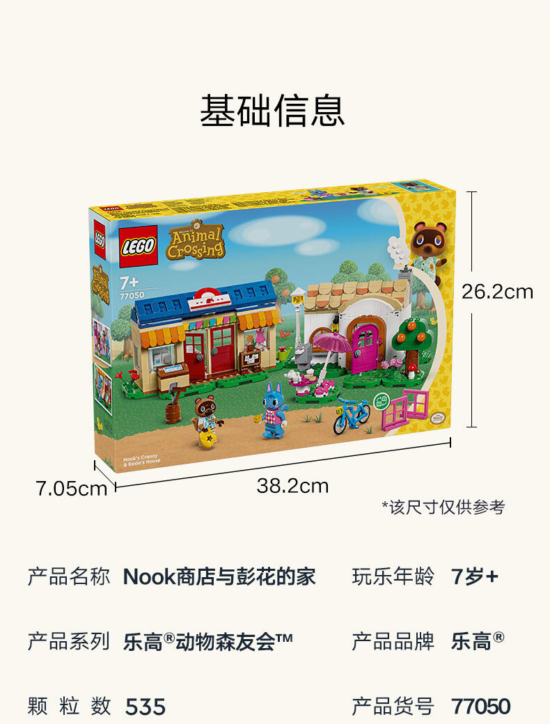 - 细节丰富的 Nook 商店与彭花的家套装——系列源自《动物森友会 》的玩具套装,7 岁及以上喜爱此电子游戏系列的男孩和女孩可以瞬间辨识出它们,并进行各式各样的定制 可以定制的儿童玩具——这款拼搭玩具包含彭花和狸克小人仔、2 座标志性的《动物森友会 》建筑、许多配件和可以互换的底板 可以拼搭的《动物森友会 》玩具——到 Nook 商店购买工具或借铃钱,然后顺道拜访彭花,品尝纸杯蛋糕,通过信箱寄信,以及帮助她重新布置家具 充满故事灵感启发物——本套装包含许多标志性组件,如 DIY 手册、公告牌、纸杯蛋糕、鱼饵,以及内部带有惊喜的树木,就像在游戏中一样 《动物森友会 》礼物——此拼搭玩具可作为此电子游戏系列和创意玩乐爱好者的特殊场合礼物或生日礼物 动物森友会 套装提供数字化拼搭说明——LEGO Builder 应用程序为本套装提供数字版拼搭说明 让孩子自由发挥创造力——借助其模块化底板和大量配件,内容丰富的乐高 动物森友会 系列玩具允许孩子们决定自己展示品的设计 可为小拼搭师带来很多乐趣——这款套装内含 535 块组件,在标准布置下尺寸为:高 15 厘米(6 英寸)、宽 39 厘米(15 英寸)和深 14 厘米(5.5 英寸)