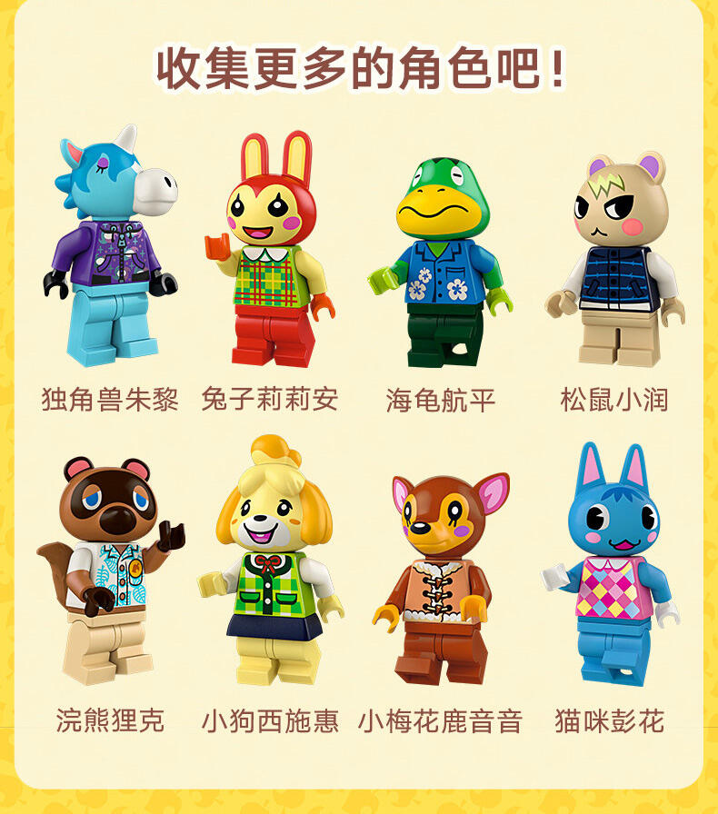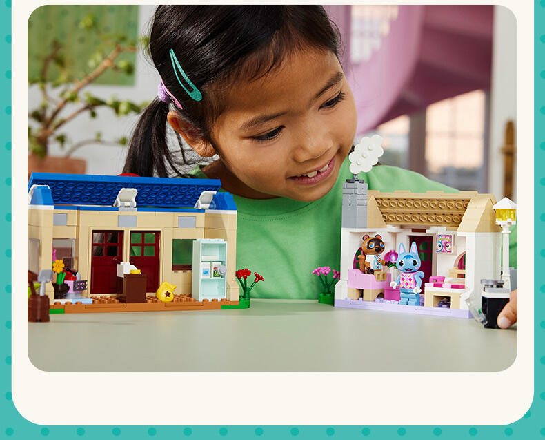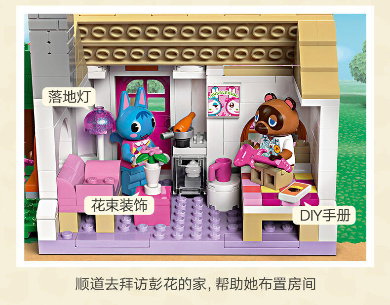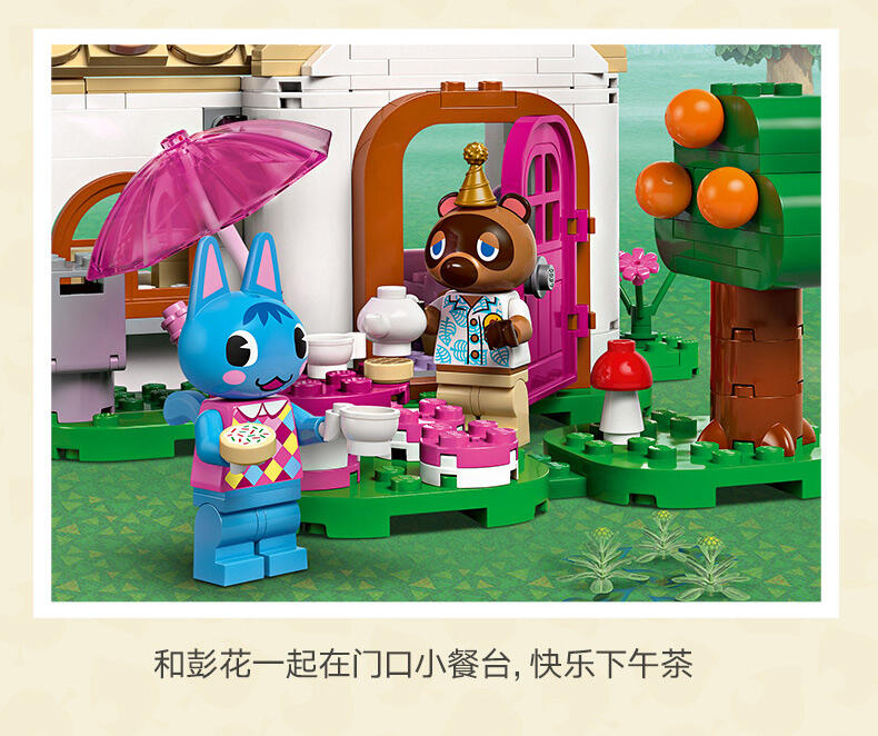 拼搭源自电子游戏系列《动物森友会》的场景,与彭花和狸克一起玩乐。前往 Nook 商店,储备工具及其它物品。接着拜访彭花,拉把椅子坐下。那是什么味道?那是从彭花厨房中飘出的纸杯蛋糕香味!帮助彭花重新布置她的家,变换其外观。定制两座建筑,使它们里里外外看起来就像你希望的那样!