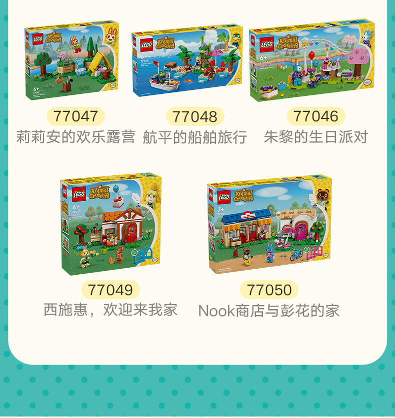 - 使用这款乐高 动物森友会 Nook 商店与彭花的家 (77050) 拼搭玩具将《动物森友会 》的世界带进孩子的房间。7 岁及以上的男孩和女孩可以创造源自电子游戏系列《动物森友会》的场景,然后围绕狸克和彭花小人仔创造全新的故事,把角色扮演带往他们喜欢的方向。 本套装可作为《动物森友会》爱好者的很棒生日礼物,其中包含许多源自此电子游戏系列的可以辨识的细节,当他们探索商店时,会发现浣熊狸克售卖的商品,像可用铃钱购买的 DIY 手册、鲜花种子、鱼饵和工具。男孩和女孩们然后可以与狸克一起到猫咪彭花的家里去喝茶,这里也有很多熟悉的组件。 小拼搭师们可以重新布置模块化底板和许多配件,使这些建筑变成他们选择的样子。拥有如此多的角色扮演和重新拼搭选择,这款可以定制的拼搭玩具允许孩子们花时间放松休息,单独或与亲朋好友一起发挥创造力。