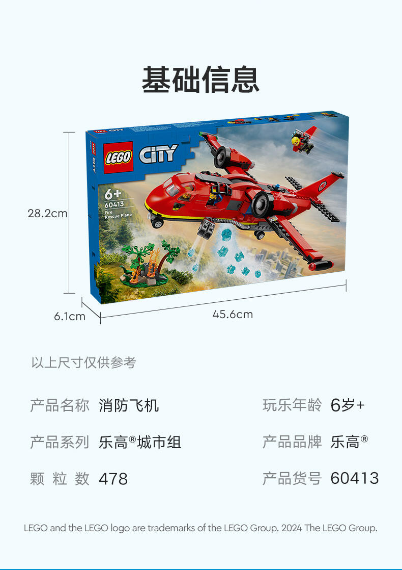 这是一款令人惊叹、适合 6 岁以上孩子的消防玩具-乐高 城市消防救援飞机(60413)有逼真特色,包括投水功能和 2 支水零件发射器。这架双引擎飞机还有可打开的后货舱与双人座驾驶舱,并含飞行员、灭火器操作员和喷射背包消防员人偶,以及野火场景,可用于精采刺激的游戏。这款紧急救援玩具包含容易理解的纸本拼砌说明,LEGO Builder 应用程序中也提供逐步 3D 拼砌说明。孩子可在应用程序中一边拼砌,一边放大、旋转,从各个角度预览模型。乐高城市系列消防主题盒组带来特色丰富的陆、海、空玩具,可用于不受限的想象游戏。孩子可将此玩具消防飞机加入其他乐高城市系列盒组(另售),享受更盛大的冒险!