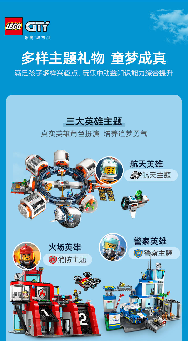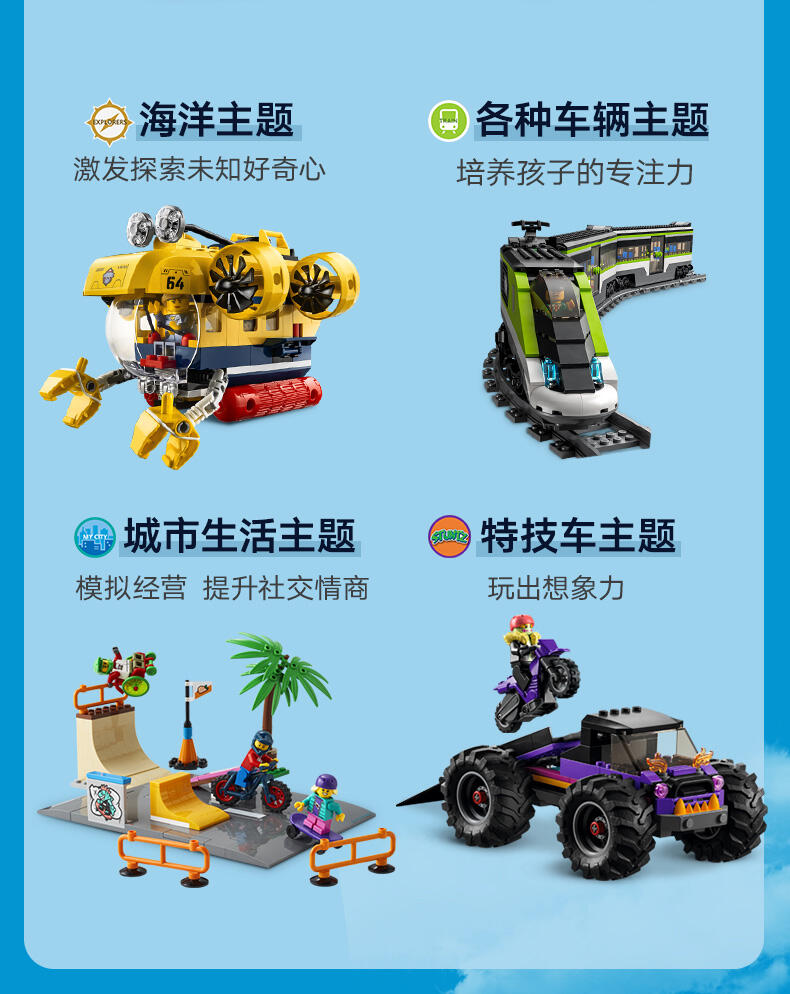 关于乐高 市组玩具套装——乐高 市是一个孩子们可以尽情发挥想象力的地方,这里有建筑、交通工具、市民,能够激发他们进行拼搭、创造、探索和玩乐的热情