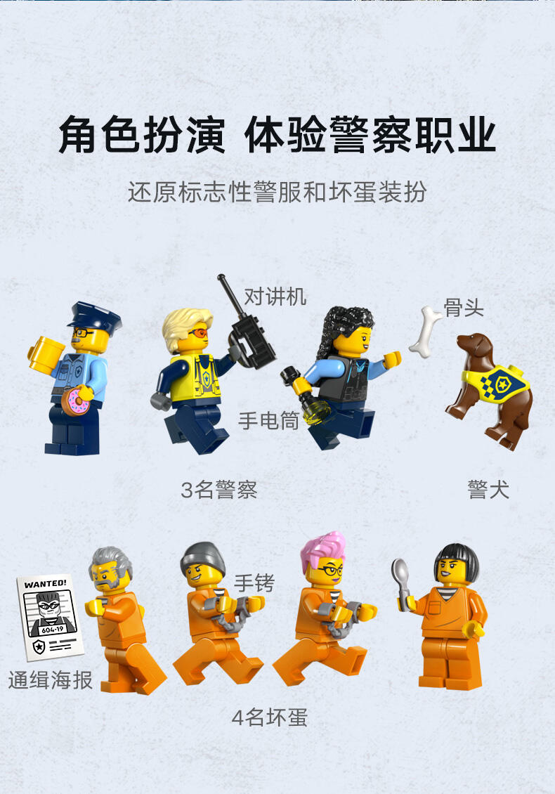 适合 7 岁及以上孩子的乐高 物——将这款警察玩具作为一份节日或生日礼物送给乐高拼搭套装和创意玩乐的爱好者,为你的日常英雄带来惊喜