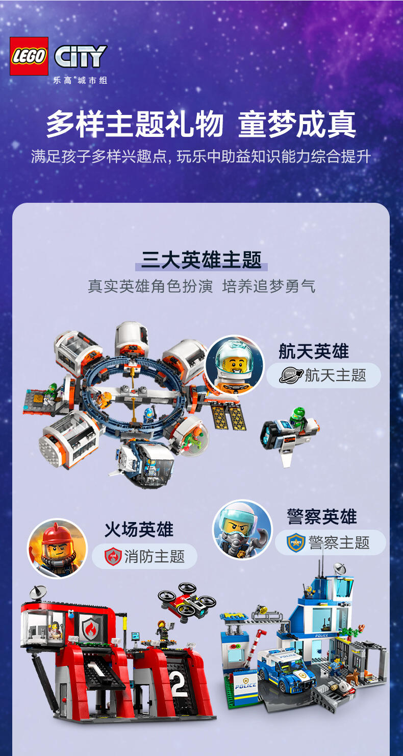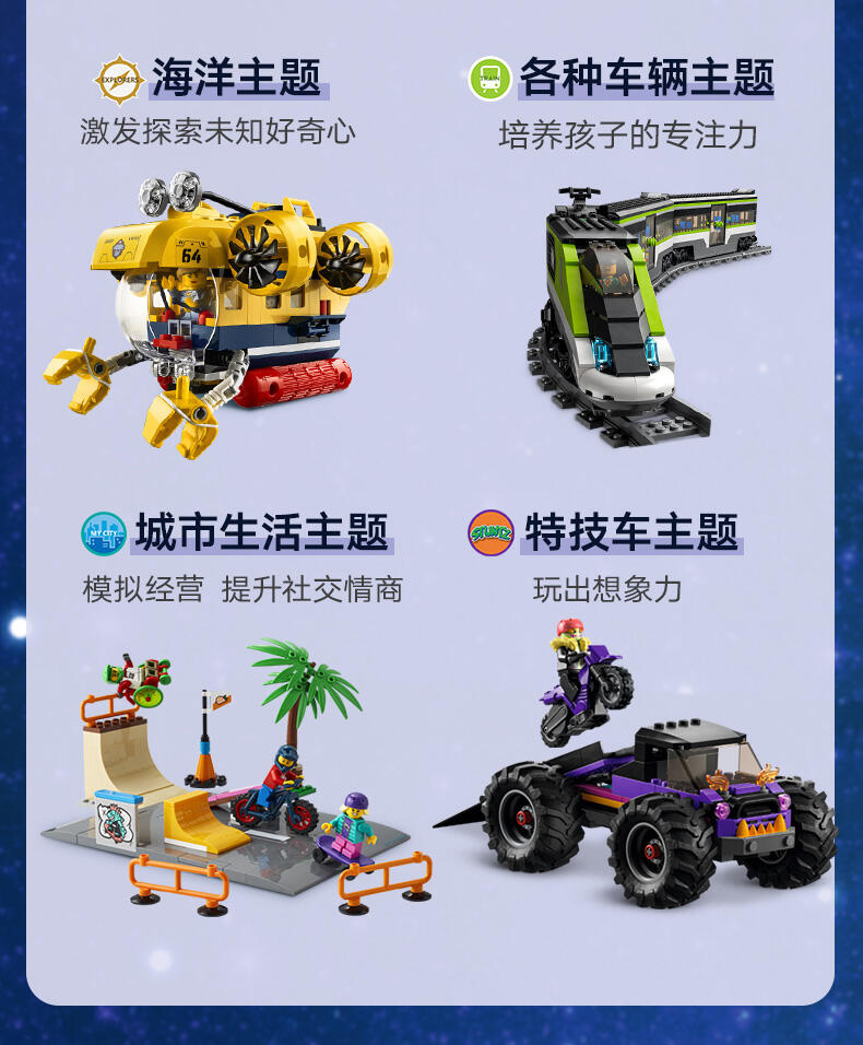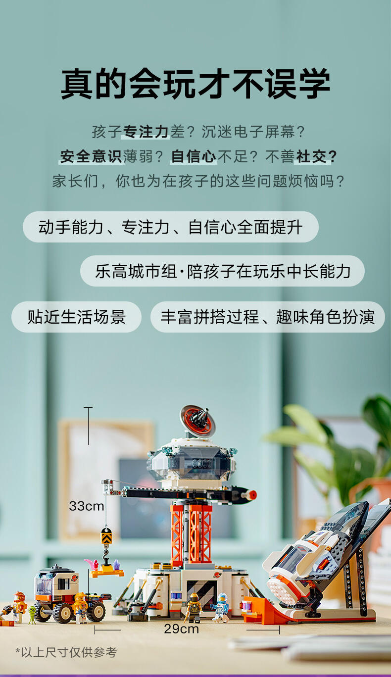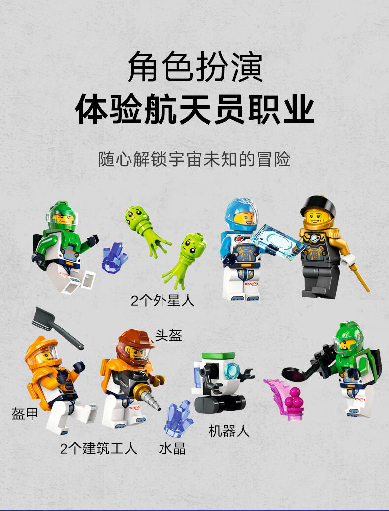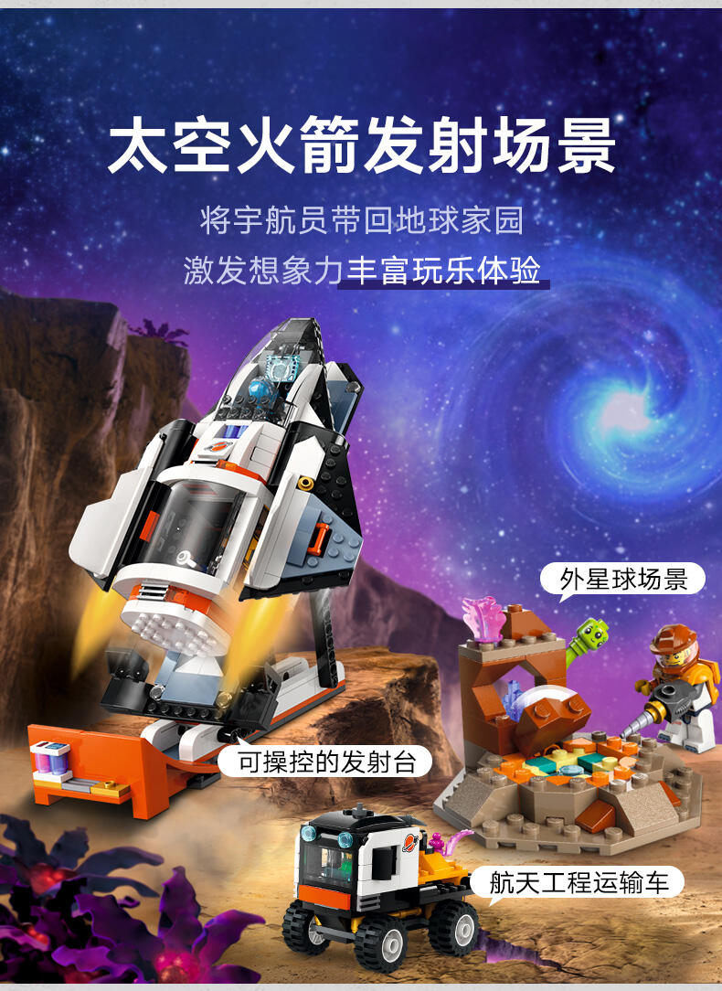 乐高城市系列太空主题盒组有逼真交通工具、精致建筑物与鼓舞人心的角色,可用于不受限的想象游戏。此盒组中的火箭飞船包含特殊的太空气匣零件,可与其他兼容的太空主题乐高盒组(另售)组合,带来更盛大的冒险!