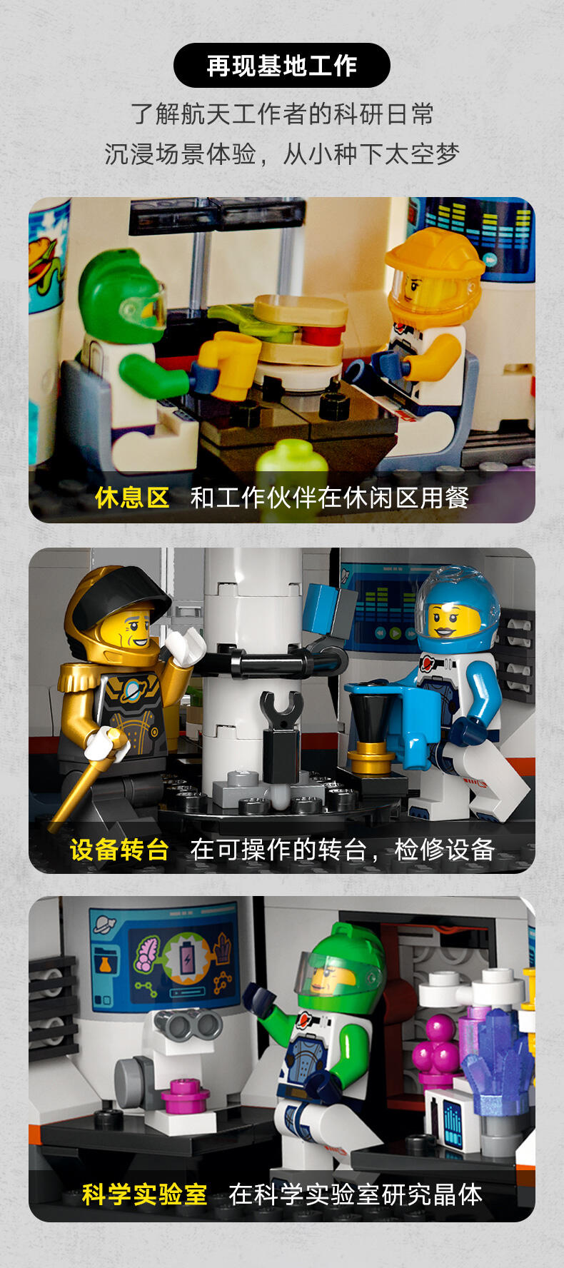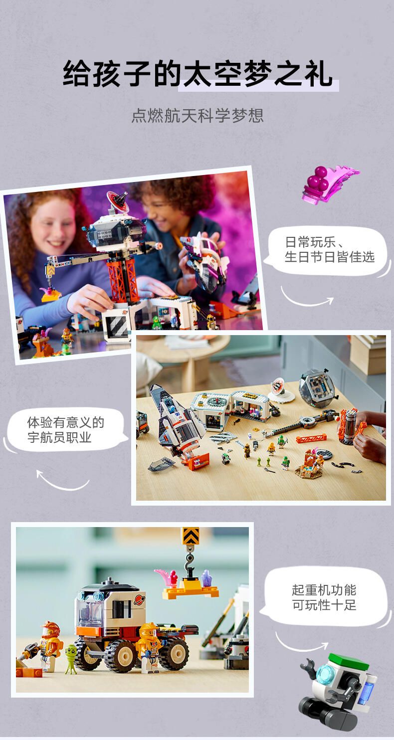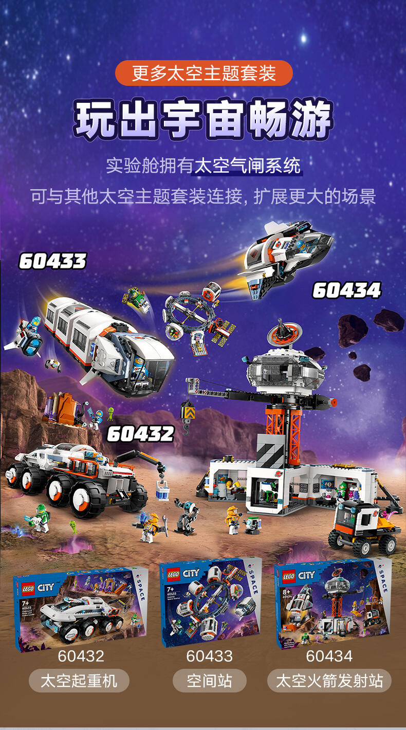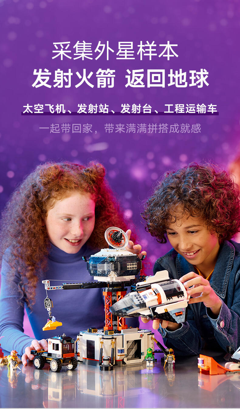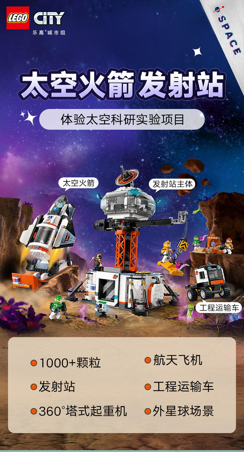 这款乐高 城市太空基地和火箭发射台(60434)太空探索玩具适合 8 岁以上玩家,有丰富特色,带来宇宙一流的冒险。里面有控制室与 360 度太空塔式起重机,下方的主区域可打开,通往装备转盘、科学实验室与茶点区。此盒组也包含宇宙飞船、发射台、工程车和有玩具能量水晶与植被的行星场景,此外还有 6 只太空团队成员人偶、1 个机器人和 2 个外星人玩偶,可用于富含想象力的角色扮演。