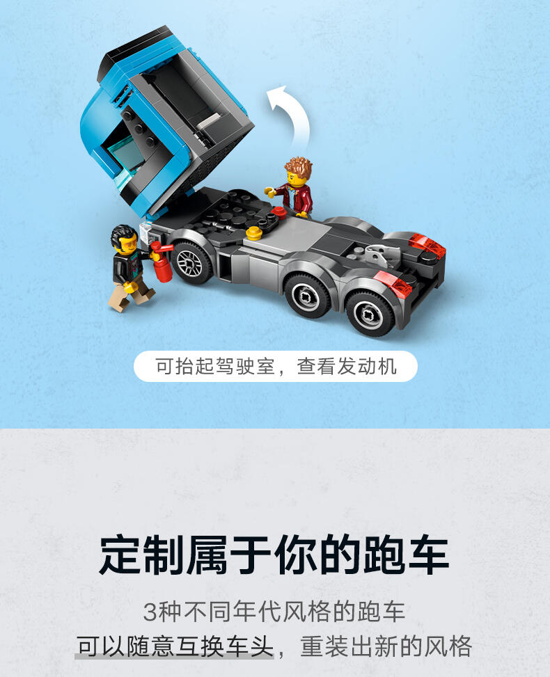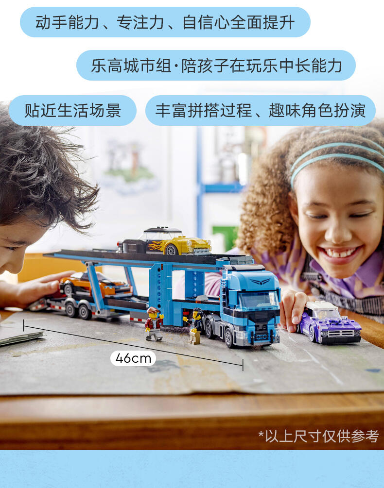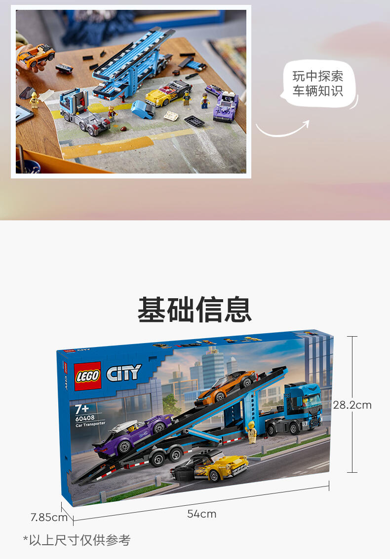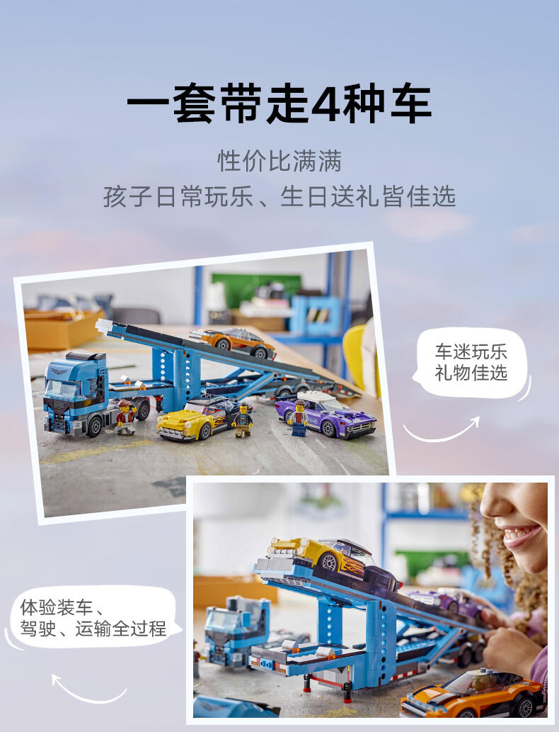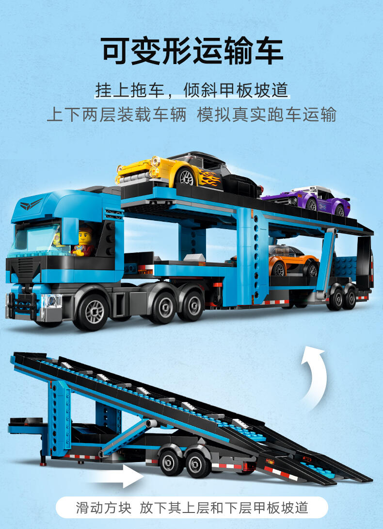 让玩具车爱好者享受这款多车乐高 市汽车运输卡车,配有跑车(60408),适合7岁及以上儿童使用。孩子们可以倾斜驾驶室以接近发动机,挂上拖车,降低其上层和下层坡道,以便登上包括50年代风格的拖尾车、70年代风格的肌肉车和现代电动超级跑车。这个令人印象深刻的卡车运输玩具套装还包括4个小人物,用于富有想象力的游戏和讲故事。