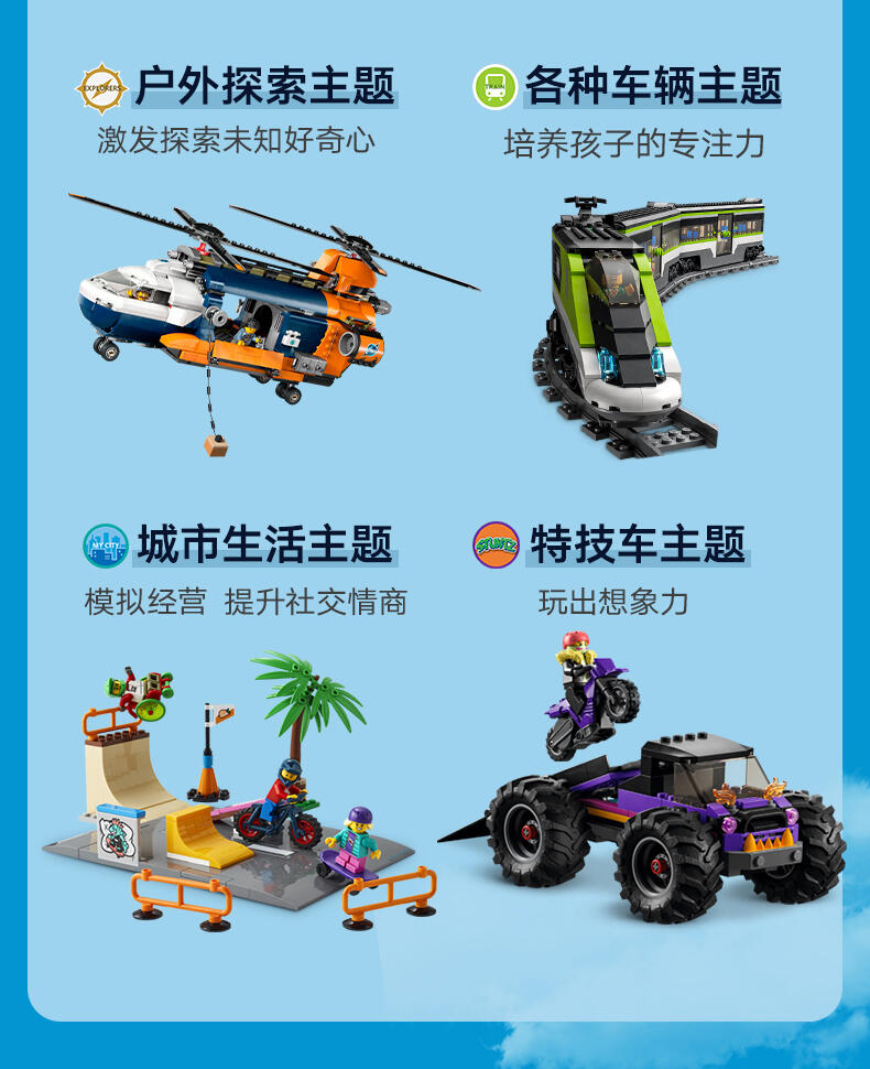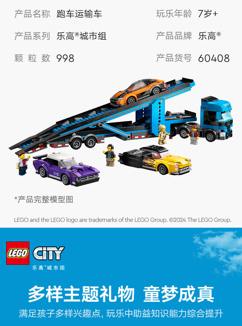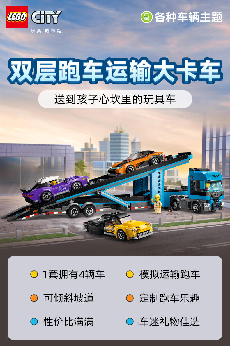 乐高城套装是送给孩子们的绝佳节日和生日礼物,有酷炫的玩具车、逼真的结构和有趣的角色,激发了无限想象力。孩子们可以将这套玩具添加到乐高城系列的其他玩具中(单独出售),以扩大游戏世界。