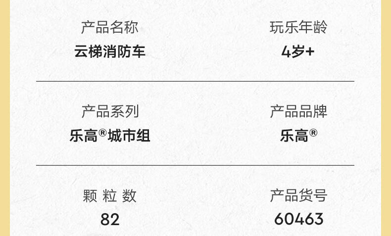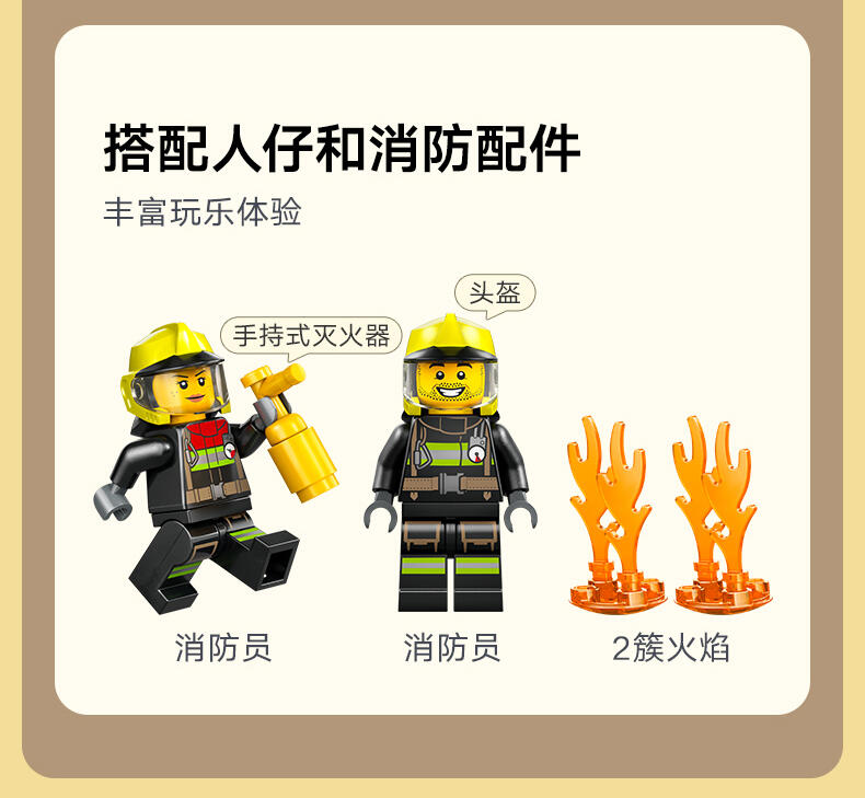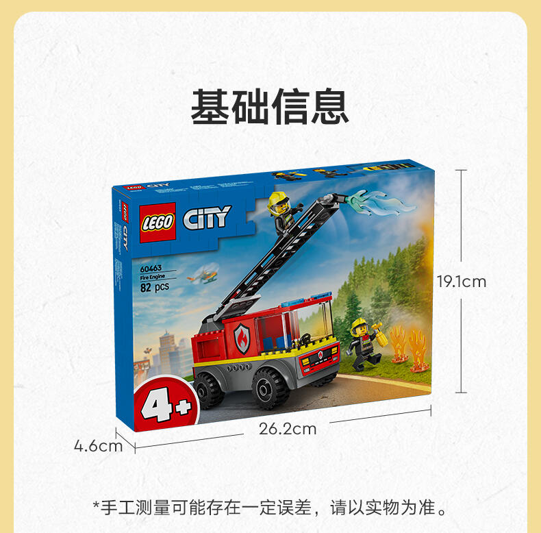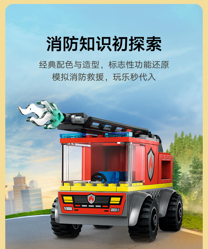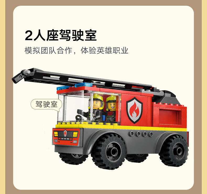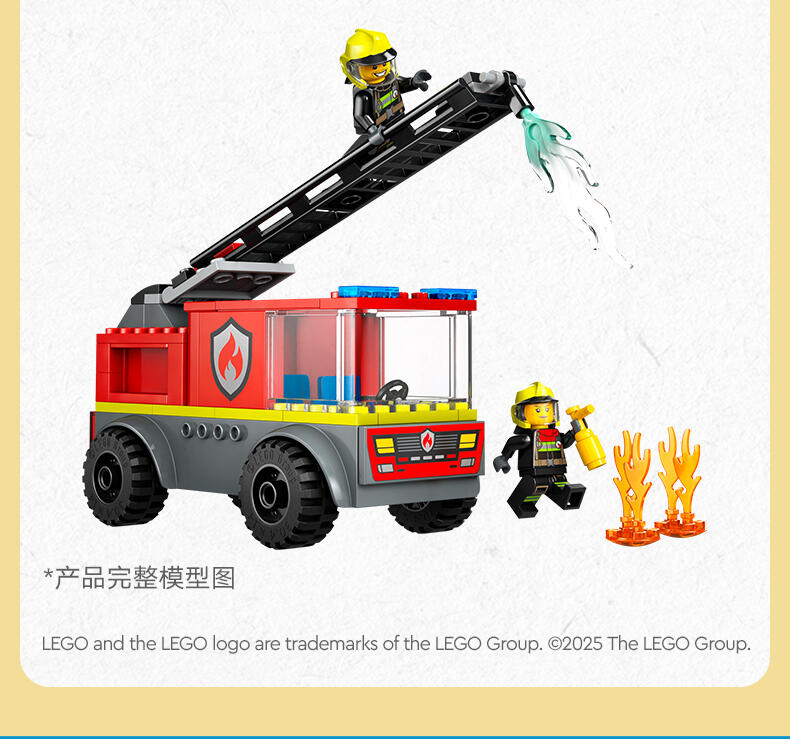 玩乐这款乐高 城市组云梯消防车玩具 (60463),与平凡英雄们一起进行英勇的冒险。这款经典的消防车模型专为 4 岁及以上的孩子设计,设有驾驶室、升降式云梯及玩具灭火器。本套装还包含 2 簇闪烁的乐高火焰、手持式灭火器和 2 个消防员小人仔,可供进行角色扮演和故事编创。这款易于拼搭的消防车玩具包含乐高入门积木组件和图画式指南。您还可以借助 LEGO Builder 应用程序中的三维说明,将您的平凡英雄带上激动人心的创造之旅。他们可以在其中探索和保存玩具套装,跟踪拼搭进度,以及在拼搭过程中缩放和旋转模型,以便从各个角度进行查看。乐高城市组消防套装包含功能丰富的陆上、空中和水上玩具,可供进行开放式创意玩乐。孩子们可将这款云梯消防车套装与其它的乐高城市组套装(单独出售)组合,进行规模更大的冒险!