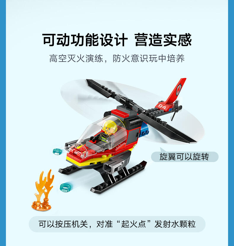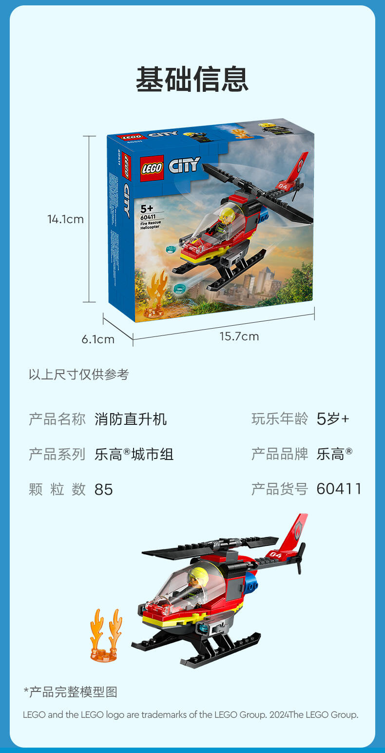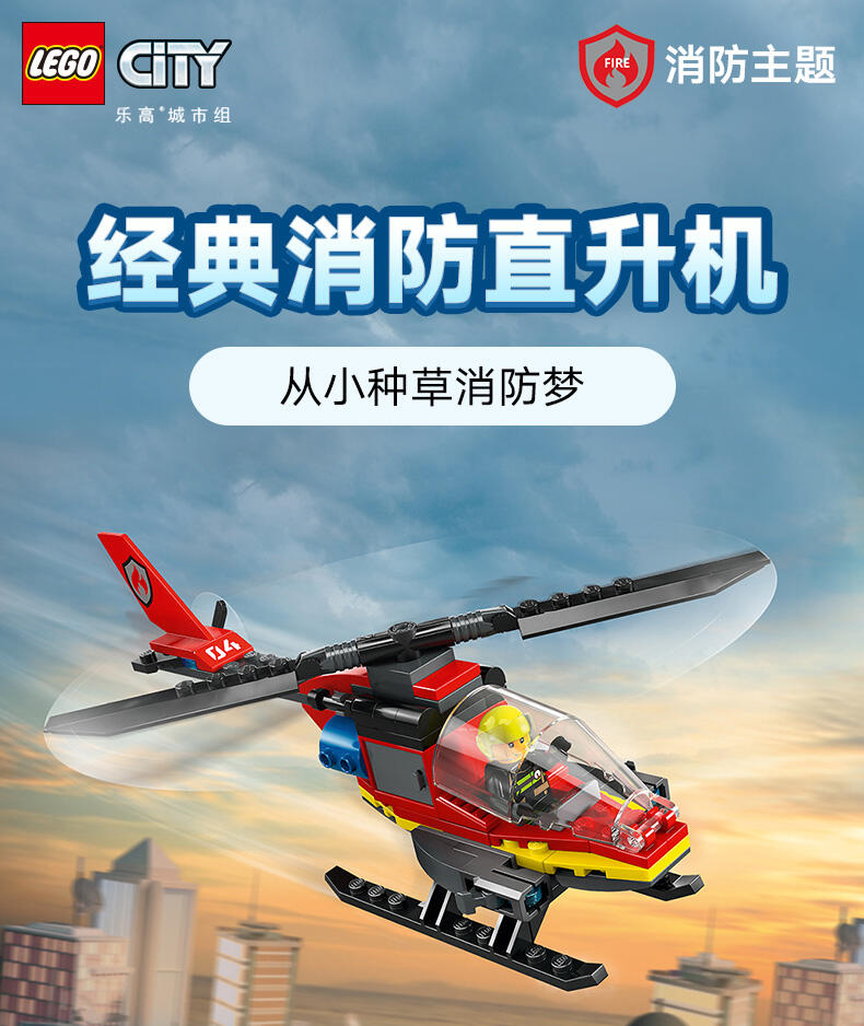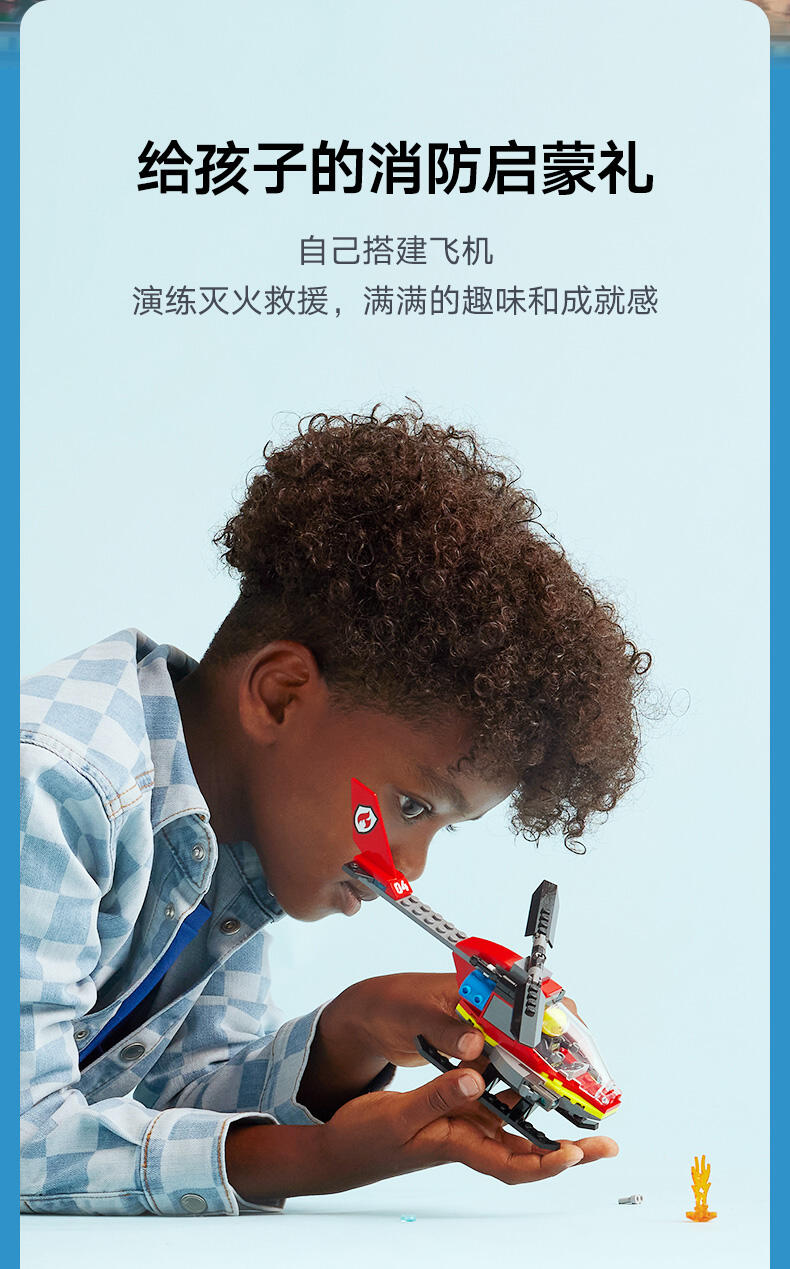 乐高城市组拼搭套装包含逼真的交通工具、细节丰富的建筑和具有启发性的角色,可供进行创意玩乐。孩子们可将这款消防直升机套装与其它的乐高城市组套装(单独出售)组合,进行更大、更精彩的冒险。