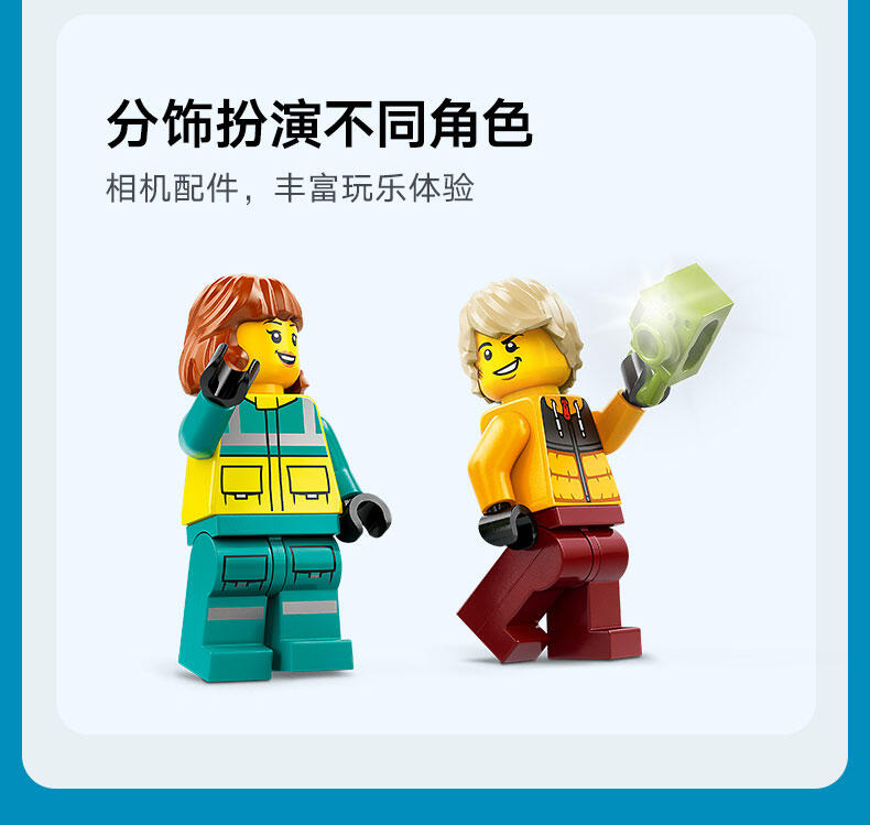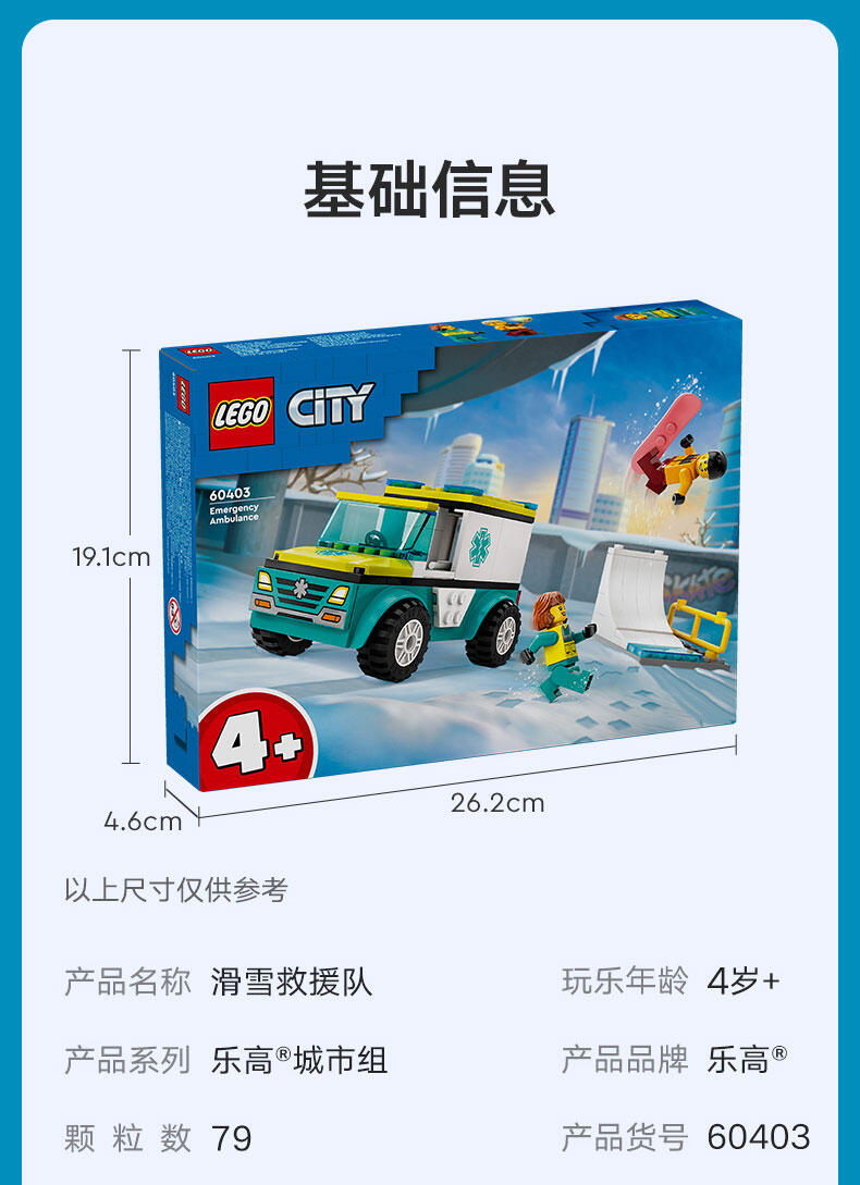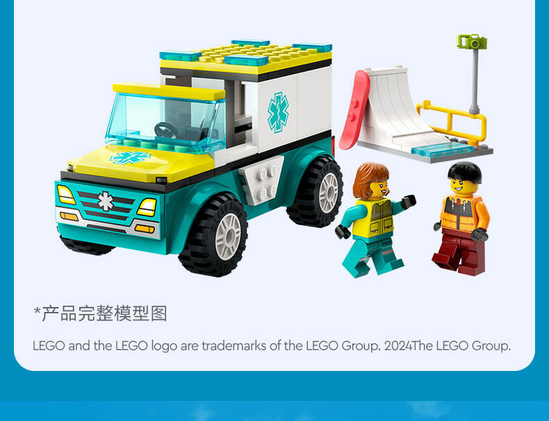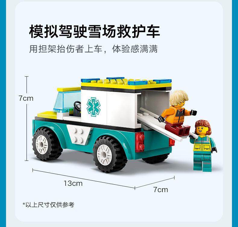 - 救护车玩具套装——玩乐这款专为 4 岁及以上孩子准备的乐高 城市组滑雪救援队拼搭套装,与你的小拼搭师一起度过美好的玩乐时光 积木盒中都有些什么呢?——这款机车拼搭套装为孩子们拼搭救护车、白雪覆盖的滑板场场景以及滑雪者和护理人员小人仔准备好了一切 可为喜爱创意玩乐的孩子带来乐趣——孩子们可以使用担架和注射器进行救护车救援任务 这款令人心动的拼搭套装提供交互式指南——探索 LEGO Builder 应用程序,孩子们可以在其中缩放和旋转三维模型,跟踪拼搭进度,以及探索和保存虚拟玩具套装 适合所有场合的有趣礼物——这款拼搭套装可作为 4 岁及以上男孩和女孩的有趣节日礼物或任何日子的奖励 欢迎来到创意玩乐的世界——可将此套装与其它乐高 城市组套装(单独出售)组合,体验更多乐趣和冒险 城市无极限——乐高 城市是一个孩子们可以尽情发挥想象力的地方,这里有建筑、交通工具、市民,能够激发他们进行拼搭、创造、探索和玩乐的热情 尺寸——这款拼搭套装内含 79 块组件,其中的救护车模型尺寸为:高 7 厘米(2.5 英寸)、长 13 厘米(5 英寸)和宽 7 厘米(2.5 英寸)