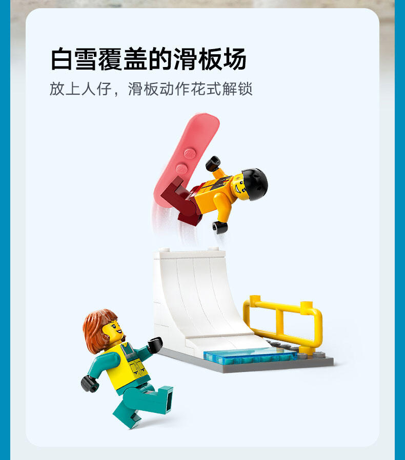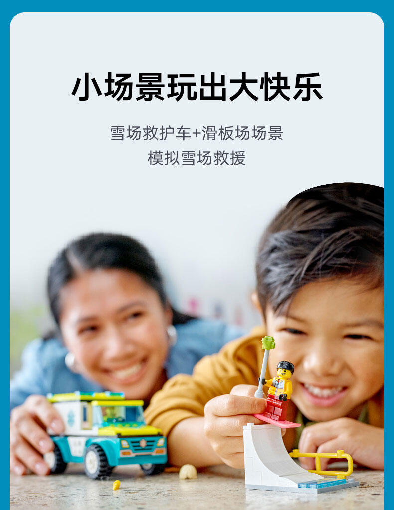 哦-噢!大雪覆盖了乐高 城市滑板场,一个摔倒的滑雪者需要你的帮助。装上救援担架,发动急救车。雪对急救车没有影响:它的高抓地力轮胎非常适合湿滑的城市街道!并且车上足可以容纳病人以及他的相机、自拍杆和滑雪板。你的城市,无极限!出发!