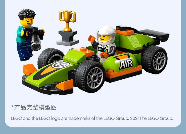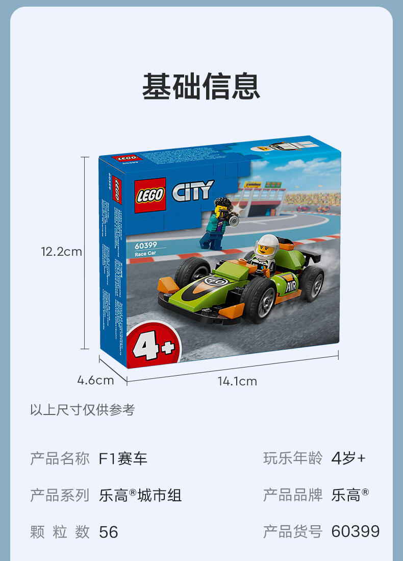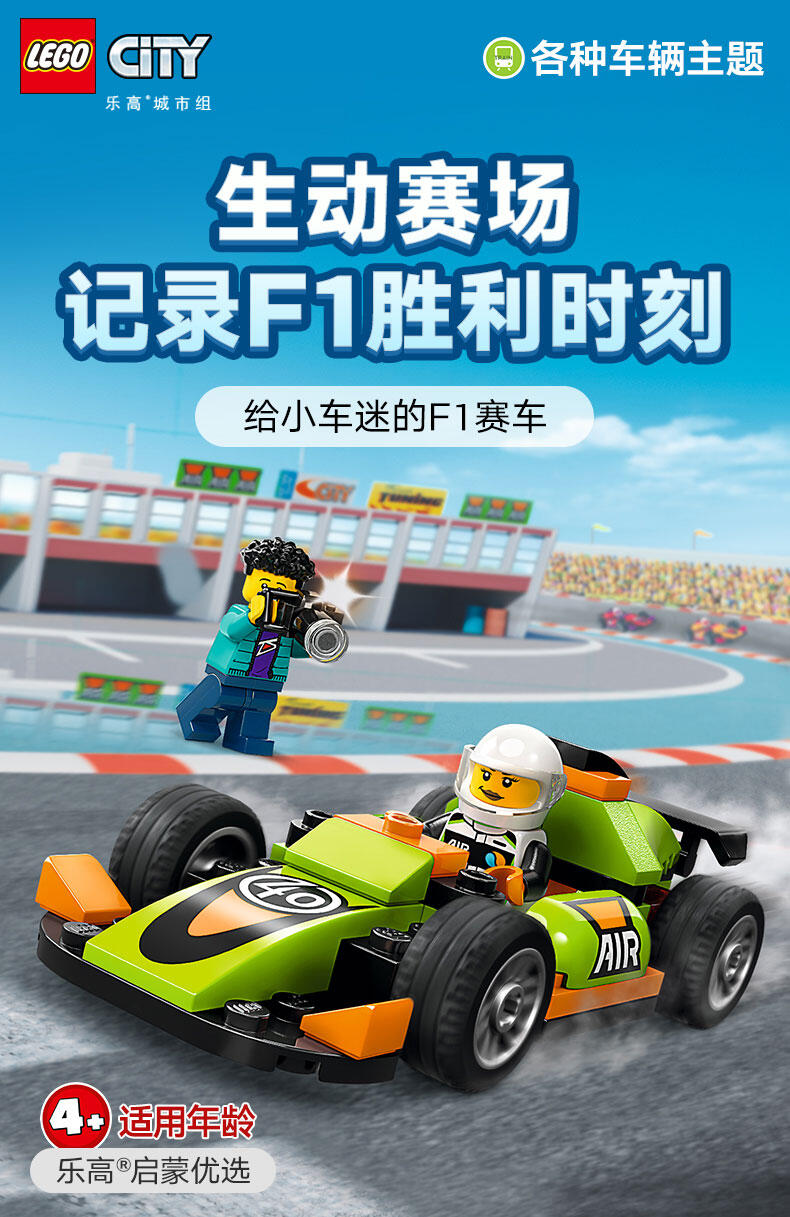 - 这款乐高 城市组 F1 赛车 (60399) 为 4 岁及以上的孩子开启了一扇通往创意玩乐世界的门户。本套装配有运动型轮胎和很酷的后扰流板。玩乐这款套装,准备为你的小赛车手加油,一起度过美好的时光。此套装还包含摄影师和赛车手小人仔,以及获胜者奖杯,可供表演精彩的故事。 这款易于拼搭的汽车玩具套装可作为 4 岁及以上孩子的很酷礼物,它提供乐高入门积木组件、图解式指南,以及 LEGO Builder 应用程序中的三维说明。此应用程序是一个数字拼搭助手,拥有直观的工具,允许孩子们在拼搭过程中缩放、旋转以及从各个角度查看模型。 乐高城市组玩具套装包含逼真的交通工具、精致的建筑和具有启发性的角色,可供孩子们进行创意玩乐,让他们成为行动的主角。可将这款机车玩具与其它的乐高城市组套装(单独出售)组合,步入开放式玩乐的世界。