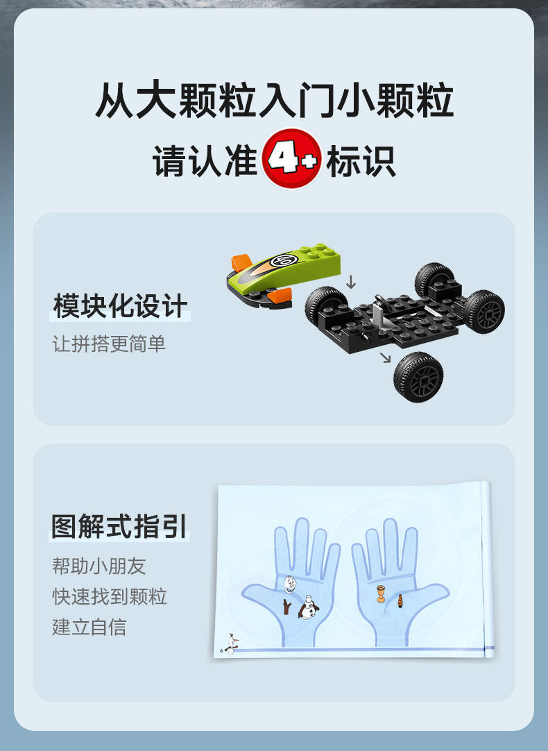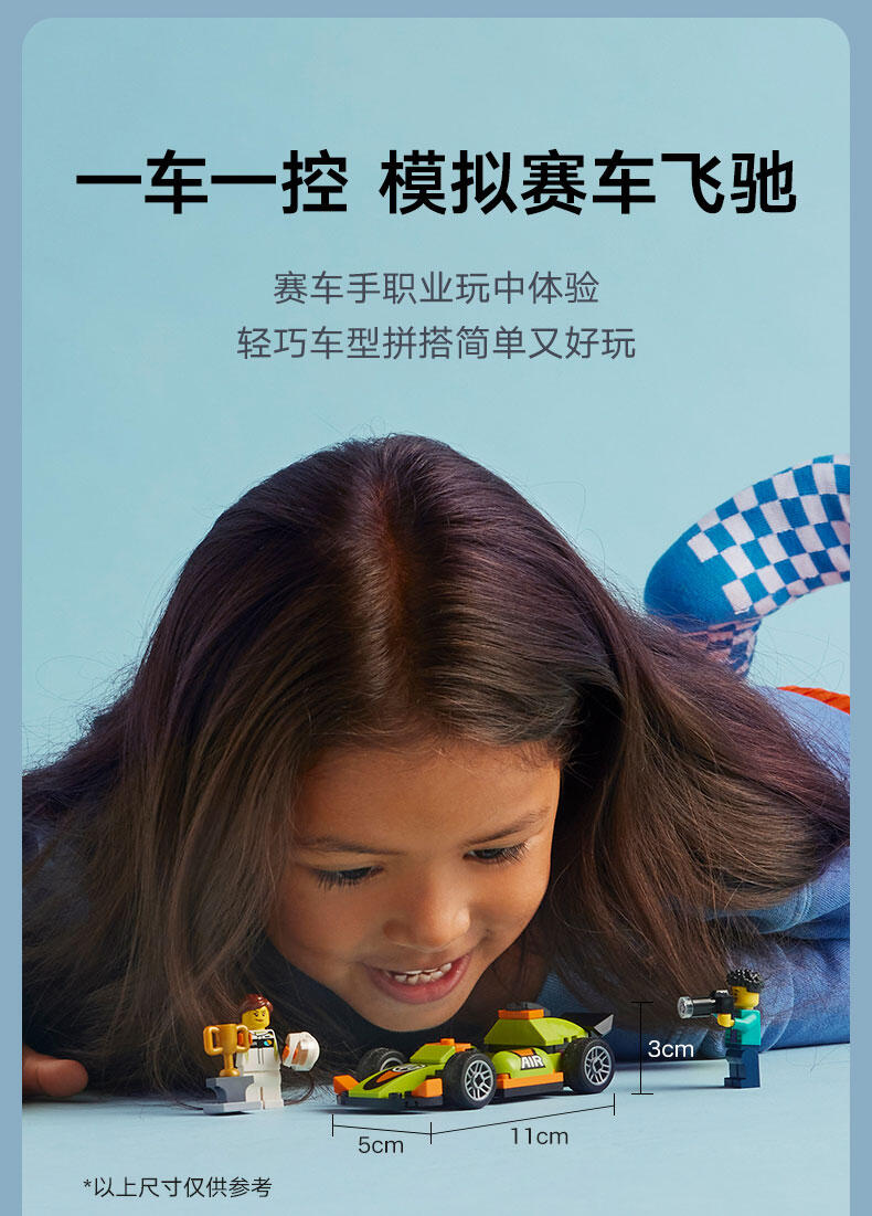 - 专为 4 岁及以上的孩子准备的赛车玩具——这款乐高 城市组 F1 赛车包含一辆玩具机车。玩乐这款套装,开始赛车活动 积木盒中都有些什么呢?——包含摄影师和赛车手小人仔、冠军奖杯,以及小拼搭师创造一辆玩具赛车所需的一切 尽情发挥想象力——将乐高 赛车手小人仔放入驾驶舱,进入一个充满创意玩乐和故事表演的世界 专为小拼搭师设计——这款 4+ 乐高 汽车拼搭玩具包含入门积木组件、简易的图解式拼搭指南和三维数字指南,其中数字指南可从 LEGO Builder 应用程序中获取 适合男孩和女孩的乐高 礼物——这款赛车玩具可作为汽车和炫酷交通工具爱好者任何时候的礼物 更多创意玩乐机会——可将此套装与其它乐高 城市组套装(单独出售)组合,体验更多乐趣和冒险 让学习充满乐趣——乐高 城市组拼搭玩具可以帮助孩子通过开放式玩乐培养自信心和重要生活技能 尺寸——这款乐高 城市组套装内含 56 块组件,其中的汽车玩具尺寸为:高 3 厘米(1 英寸)、长 11 厘米(4.5 英寸)和宽 5 厘米(2 英寸)