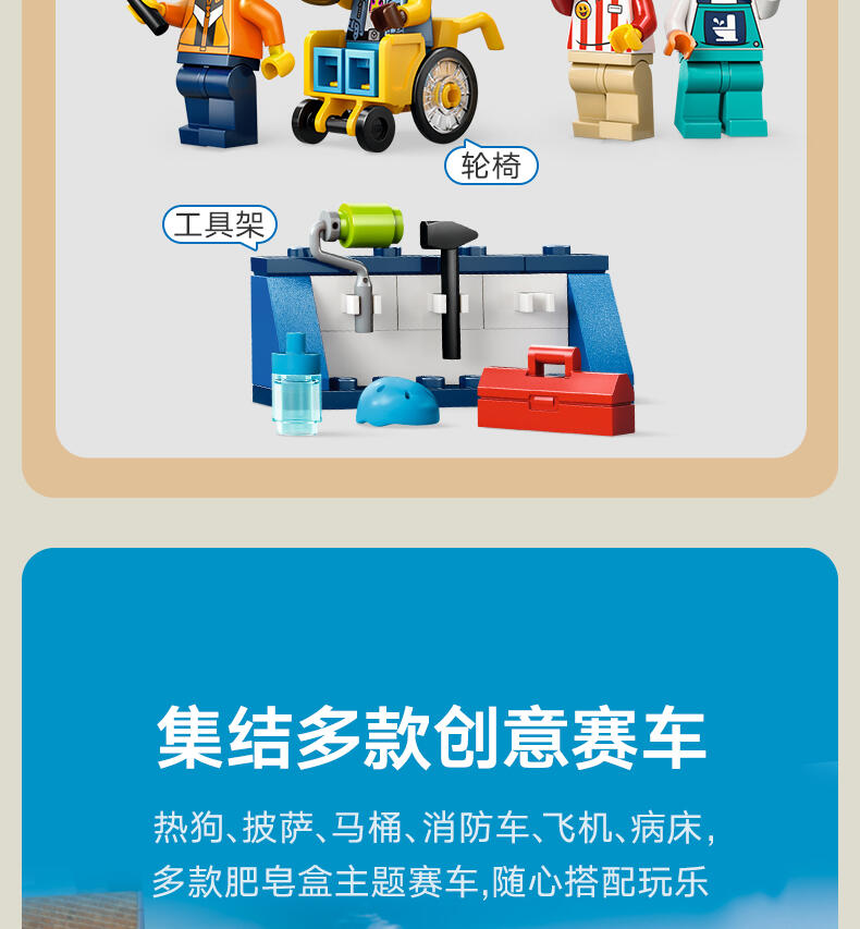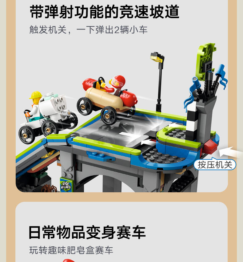 乐高城市组玩具套装包含很酷的交通工具、逼真的建筑和有趣的角色,可供孩子们尽情进行玩乐。可将这款肥皂盒汽车套装与同系列的其它套装(单独出售)组合,获取更多玩乐机会。
