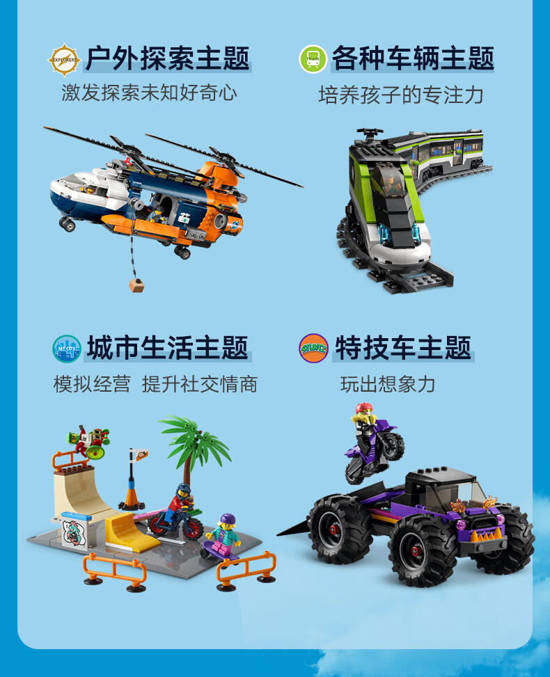 乐高城市套装以酷炫的车辆、逼真的结构和有趣的人物为特色,灵感无限。孩子们可以将这套乐高城市套装添加到乐高城市系列的其他产品中(单独出售),以扩大游戏世界的可能性。