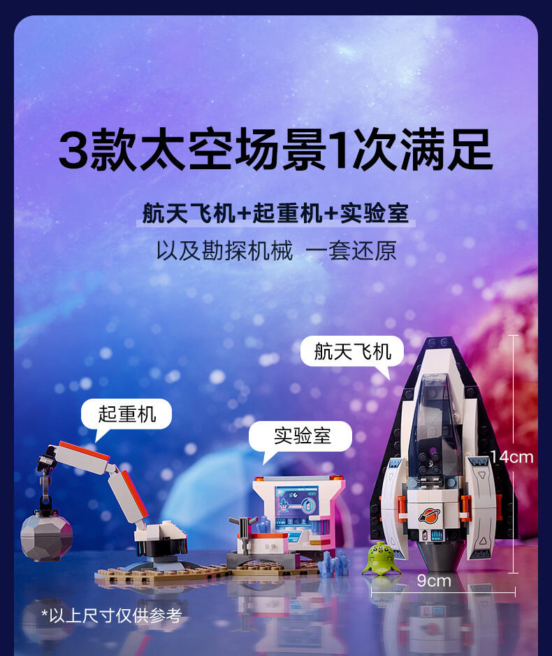 积木盒中都有些什么呢?——本太空玩具包含孩子们拼搭航天飞机、起重机、实验室和挖掘场景、内含能量水晶的陨石、2 个小人仔和一个外星人所需的一切