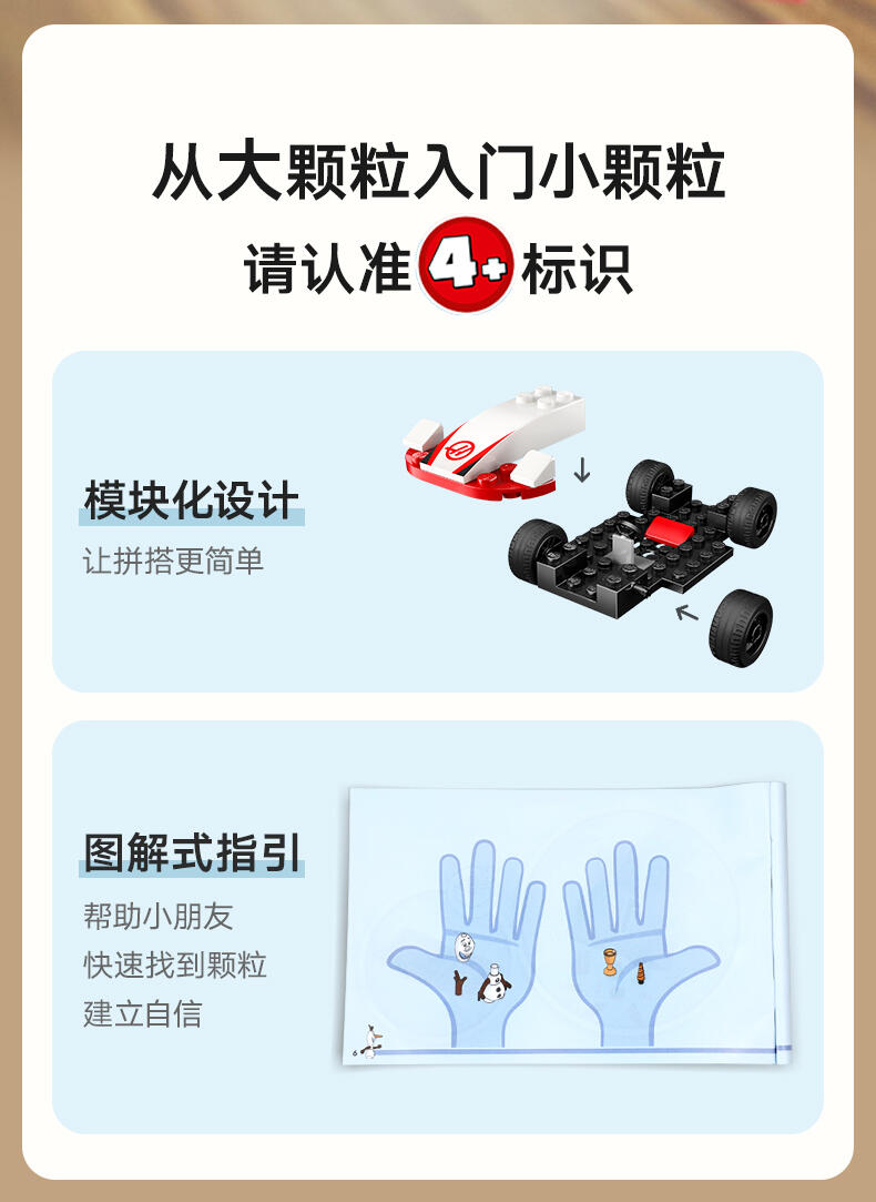 这款易于拼搭的 F1 玩具汽车套装提供乐高入门积木组件、图解式指南,还可从 LEGO Builder 应用程序中获取三维说明。此应用程序是一个数字拼搭助手,拥有缩放和旋转工具,允许孩子在拼搭过程中从各个角度查看模型。