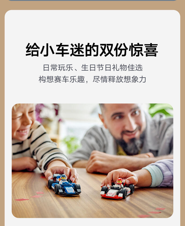 孩子们在各式各样令人惊叹的车辆和机器中长大,而借助乐高城市组拼搭套装,他们可以通过逼真的模型和有趣的角色近距离探索它们。还可将这款赛车套装与其它的乐高城市组套装(单独出售)组合。