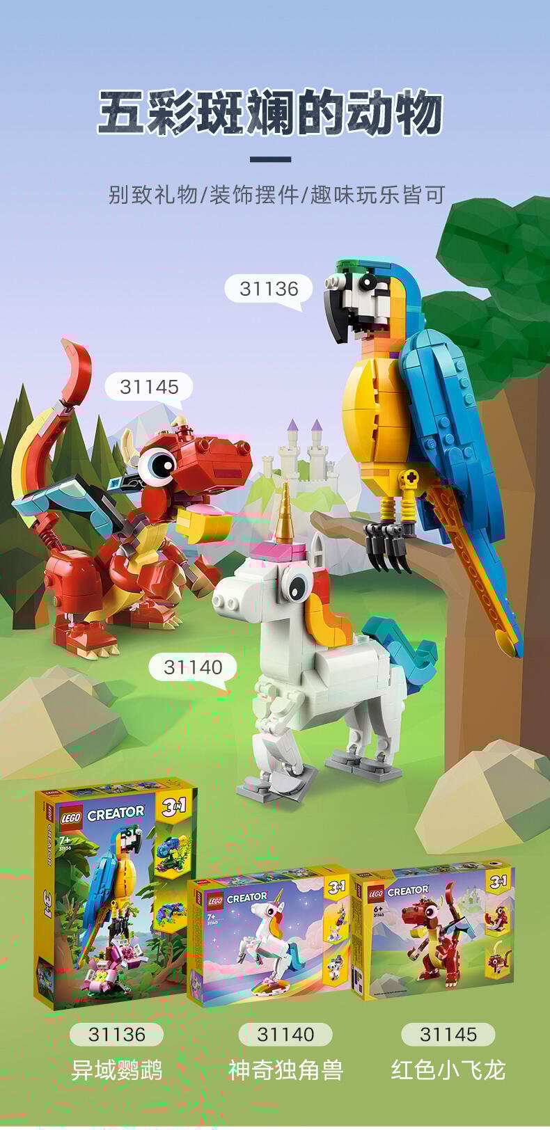 - 这款乐高创造者套装为孩子们提供了一个无限玩耍的世界,用同一套砖块制作3种不同的动物玩具。他们可以制作一个优雅的龙玩具,将其重建成有五颜六色羽毛的凤凰玩具,将它变成有优雅鳍的鱼玩具,或者创造自己的乐高动物。